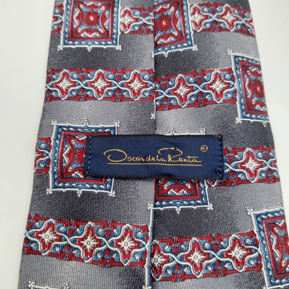 HomeOscar de la Renta Mens Gray Red Geometric Silk Tie Vintage 57 Inch