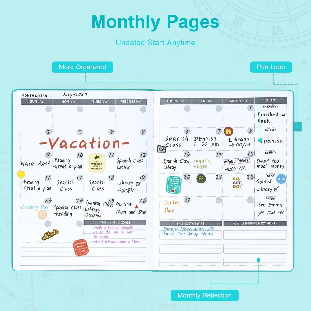 Ospelelf Undated Daily Planner 2024-2025 12 Months, 8.5 x 11 Weekly & Monthly Life Planner, Organizer Notebook & Productivity Journal. A4 Leather Hardcover with Stickers(Turquoise) Exquisite & Unique Leather Cover - This 8.5 x 11'' planner is completely handcrafted by using leather that is sof and thick. It features precise deep embossing on the cover and durable leather cord binding,which offers a soft touch exterior with a natural, distressed look that’s truly exclusive. Stay Organized & Achieve Your Goals - Learn to prioritize by using monthly and weekly priority sections to focus your energy on most initial goals. Manage your time effectively and never miss a meeting again by using the monthly calendar and weekly planning sections to schedule appointments and deadlines. Strive for continuous improvement by using the weekly and monthly reflection sections. This is the perfect productivity and time management planner for men and women! Improve Work-Life Balance, Build New Habits & Feel Happier - Become your best self by setting and achieving goals in all important areas of your life. Bring more healthy habits and positive daily rituals into your life, and stick to them by using the habit tracker section of the planner. Incorporate gratitude and affirmation techniques for a more inspired and happier everyday life. Undated, Luxurious & Premium Quaility - The planner comes undated so you can start any time of the year without wasting a page. 12 months capacity runs in bulk and are separated into weeks and days.3 colorful bookmarks to flip between weekly and monthly spreads. The hardcover is made from skin-friendly faux leather with unique artwork engraved, a convenient pen holder, elastic band, and totally 384 decorative stickers and 12 index stickers. Unique Among Others - If you are searching for a perfect planner that makes a difference, then please try Ospelelf. We are dedicated to designing and manufacturing innovative products of the highest quality. Exquisite & Unique Leather Cover - This 8.5 x 11'' planner is completely handcrafted by using leather that is sof and thick. It features precise deep embossing on the cover and durable leather cord binding,which offers a soft touch exterior with a natural, distressed look that’s truly exclusive. Stay Organized & Achieve Your Goals - Learn to prioritize by using monthly and weekly priority sections to focus your energy on most initial goals. Manage your time effectively and never miss a meeting again by using the monthly calendar and weekly planning sections to schedule appointments and deadlines. Strive for continuous improvement by using the weekly and monthly reflection sections. This is the perfect productivity and time management planner for men and women! Improve Work-Life Balance, Build New Habits & Feel Happier - Become your best self by setting and achieving goals in all important areas of your life. Bring more healthy habits and positive daily rituals into your life, and stick to them by using the habit tracker section of the planner. Incorporate gratitude and affirmation techniques for a more inspired and happier everyday life. Undated, Luxurious & Premium Quaility - The planner comes undated so you can start any time of the year without wasting a page. 12 months capacity runs in bulk and are separated into weeks and days.3 colorful bookmarks to flip between weekly and monthly spreads. The hardcover is made from skin-friendly faux leather with unique artwork engraved, a convenient pen holder, elastic band, and totally 384 decorative stickers and 12 index stickers. Unique Among Others - If you are searching for a perfect planner that makes a difference, then please try Ospelelf. We are dedicated to designing and manufacturing innovative products of the highest quality. Shipping from the USA All of our products are shipped from the USA, ensuring quick delivery to your destination. Payment We offer the following payment methods: PayPal, credit card, bank transfer, and eBay's secure payment system. Free Shipping & Free Returns Shipping within the USA is FREE. Additionally, any return is absolutely free for you. Risk-Free Purchase You have the option to return an item within 30 days without any justification. We cover the return shipping costs! Fast Shipping We ship immediately upon receipt of payment. Generally, the package is delivered within 2-3 days in the USA. If it takes longer, we will contact you. Quality and Costs Made in Europe, USA, China No customs fees or additional charges Total satisfaction guarantee Invoice with declared VAT available upon request in .pdf format Feedback Your feedback is very important to us. After you pay for your purchase, you will automatically receive positive feedback from us.