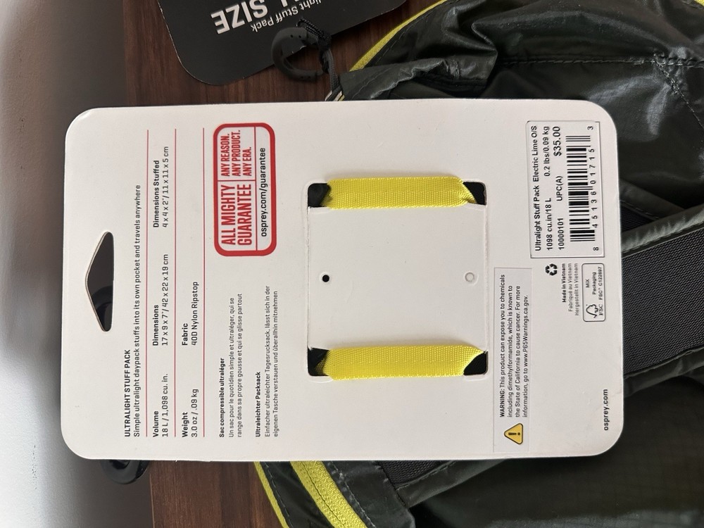 The Osprey Stuff Pack Ultralight Shadow Grey 18L O/S is a versatile hiking backpack made of durable nylon material. It features a sleek gray color with a one size fit for both men and women. This backpack comes with 3 pockets for convenient storage, and is designed to be ultralight for easy carrying during hiking adventures. Backed by a lifetime manufacturer warranty, this Osprey Stuff Pack is a reliable and stylish choice for outdoor enthusiasts looking for a practical and comfortable backpack for their hiking expeditions. Brand new collecting dust. So I am letting it go.