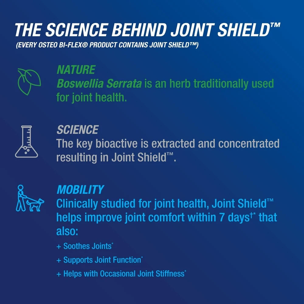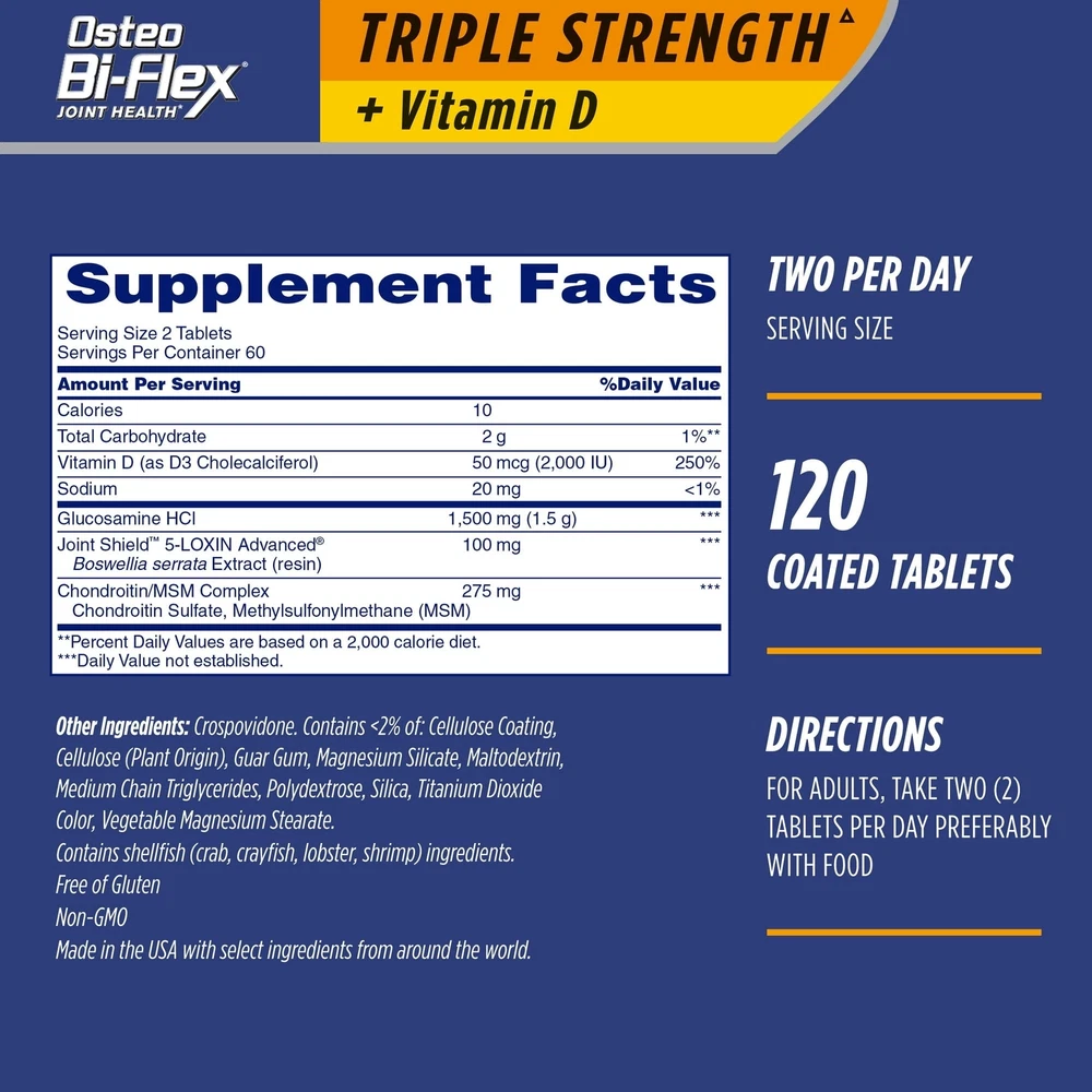 Product Description Osteo Bi-Flex with Vitamin D and Glucosamine Chondroitin, Joint Health Supplement, 80 Tablets (Pack Of 2) This Osteo Bi-Flex Glucosamine Chondroitin Triple StrengthΔ formula with 50mcg of Vitamin D includes Joint Shield 5-LOXIN Advanced**, a clinically studied herbal extract that has been shown to significantly improve joint comfort in 7 days.*† This Osteo Bi-Flex joint supplement formula also includes Vitamin D to help support immune and bone health.* Glucosamine chondroitin, an ingredient essential for the maintenance of joint cartilage and comfortable joint movement provides additional joint support to nourish and strengthen your joints for the long term.* Osteo Bi-Flex is the #1 pharmacist-recommended *** joint care supplement brand, built on quality and innovation. With a focus on providing high-quality joint supplements that fulfill a variety of needs, Osteo Bi-Flex is a trusted brand, committed to providing products to support joint comfort, mobility and flexibility* so you can keep moving, the way you were made to. Osteo Bi-Flex with Vitamin D and Glucosamine Chondroitin, Joint Health Supplement, 80 Tablets One 80 count bottle of Osteo Bi-Flex Triple StrengthΔ with Vitamin D Glucosamine Chondroitin Joint Health Supplement Osteo Bi-Flex is the #1 pharmacist-recommended joint care supplement brand *** Joint Shield 5-LOXIN Advanced is a clinically studied herbal extract that has been shown to improve joint comfort in 7 days Includes glucosamine chondroitin to nourish and strengthen your joints for the long term This joint support formula includes Vitamin D to help support immune and bone health The #1 Doctor & Pharmacist Recommended Brand Like calcium supplements can help your bones, Osteo-Bi-Flex can help your joints Osteo BiFlex (1) These statements have not been evaluated by the Food and Drug Administration. These products are not intended to diagnose, treat, cure or prevent any disease.2 or (2) IRI Total US-Multi Outlet Latest 52 weeks ending 05/28/23.1 or ◊ or (3) Based on the results of the U.S Pharmacy Times Survey of Pharmacists’ OTC Recommendations who recommend a “joint health” dietary supplement, 2023-2024.† or (4) Based on three human studies with 5-LOXIN ADVANCED® where subjects rated their joint health over time, subjects’ joint health improved within 7 days, and continued to improve throughout the duration of the studies.Δ or (5) Refers to level of Glucosamine HCl per tablet compared to regular strength.‡ or (7) In a select study, participants taking Joint Shield (5-LOXIN ADVANCED®) or placebo over 90 days rated their joint comfort during daily activities.Individual results may vary.5-LOXIN ADVANCED® is a registered trademark of PLT Health Solutions – Laila Nutraceuticals, LLC. U.S. Patent #8,551,496 and patents pending. Brand Osteo Bi-Flex Flavor Unflavored Primary Supplement Type Vitamin-d Unit Count 80 Count Item Form Caplets,Tablets Item Weight 0.35 Pounds Ingredients Crosprovidone, Vegetable Magnesium Stearate, Cellulose Coating, Cellulose (plant origin), Silica, Titanium Dioxide Color, Caramel Color
