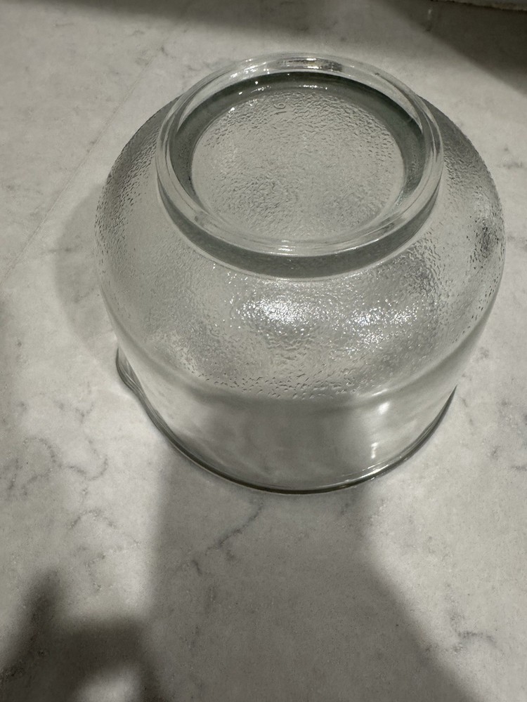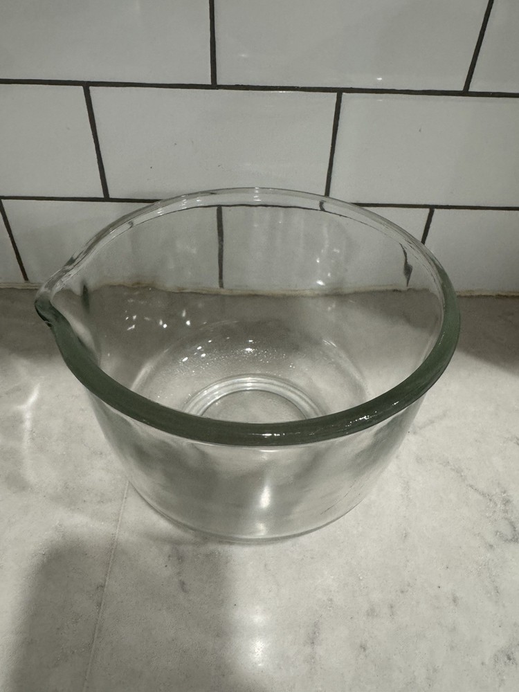 Oster Regency Kitchen Center Mixer SMALL Glass Mixing BOWL ONLY OEM 1.5 qt 6.5". This clear, glossy glass bowl is a genuine OEM component designed for use with Oster Regency Kitchen Center mixers. It has a 1.5 qt capacity and measures 6.5 inches in diameter with a height of 4 7/8 inches. This bowl is dishwasher safe and features a single setting/program with 10 speeds. It is made in the United States and comes with the small glass bowl and glass bowl components.