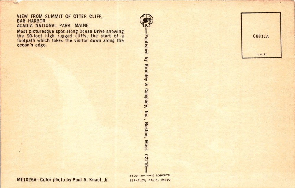 MAKE AN OFFER. THE MORE YOU BUY THE BETTER DEAL I WILL ACCEPT The postcard features a view from the summit of Otter Cliff in Acadia National Park, located in Bar Harbor, Maine. Otter Cliff is known for its 90-foot high rugged cliffs, offering a picturesque spot along Ocean Drive. The postcard mentions a footpath that starts at the cliff and takes visitors down along the ocean's edge.