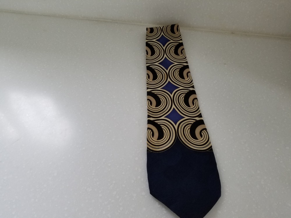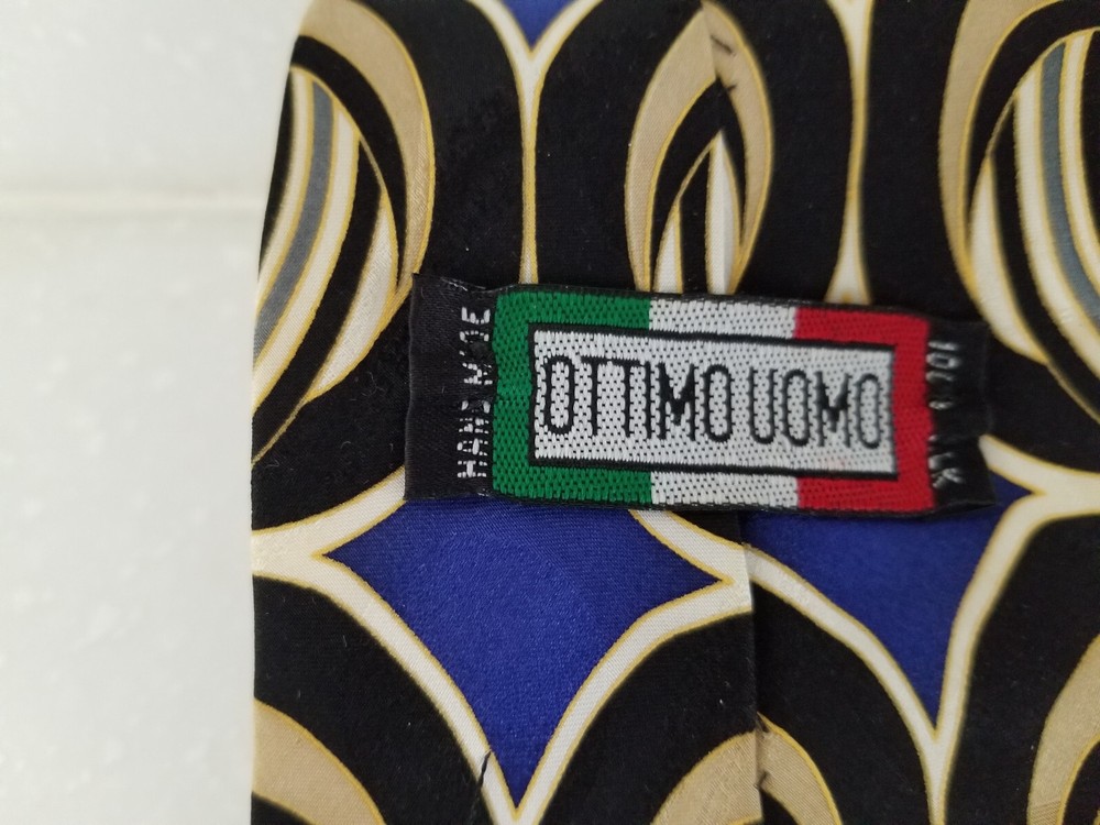 Ottimo Uomo Men's 100% Silk Handmade Necktie. Blue/beige/Black Design. 59" long and 4" at bottom. Excellent pre-owned condition with no stains or tears. Please view photos.