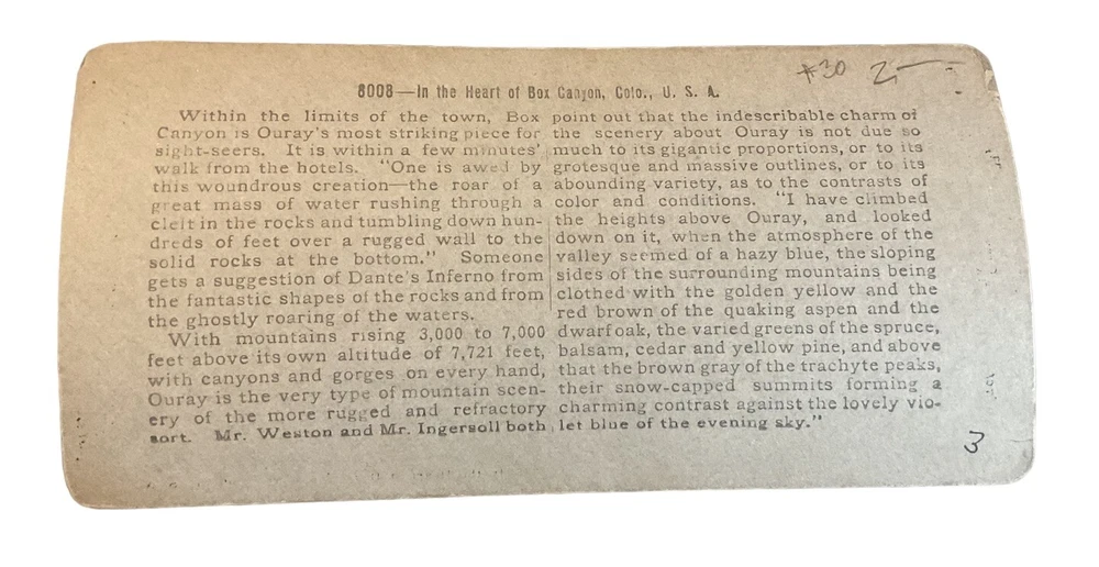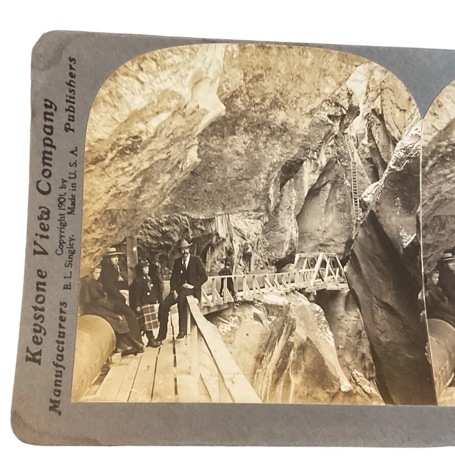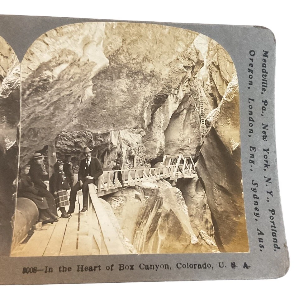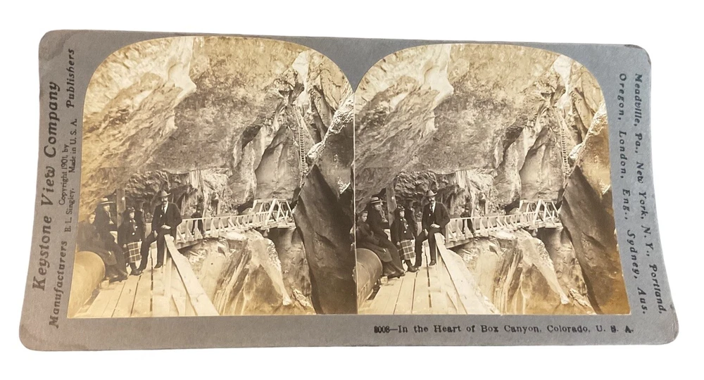 Features: NA Production Technique: NA Subject: Canyon, Colorado, Ouray Year of Production: 1910 Title: In the heart of Box Canyon, Color USA Colorado CO Brand/Publisher: Keystone View Co. Original/Licensed Reproduction: Original Type: Stereoview & Stereoscope Number of Items: 1 Time Period Manufactured: 1900-1924 Theme: Colorado