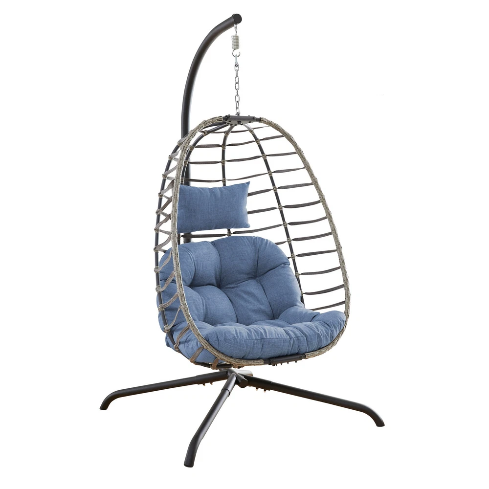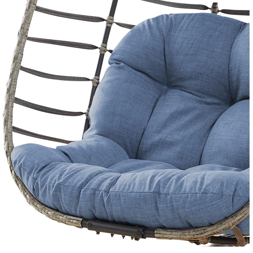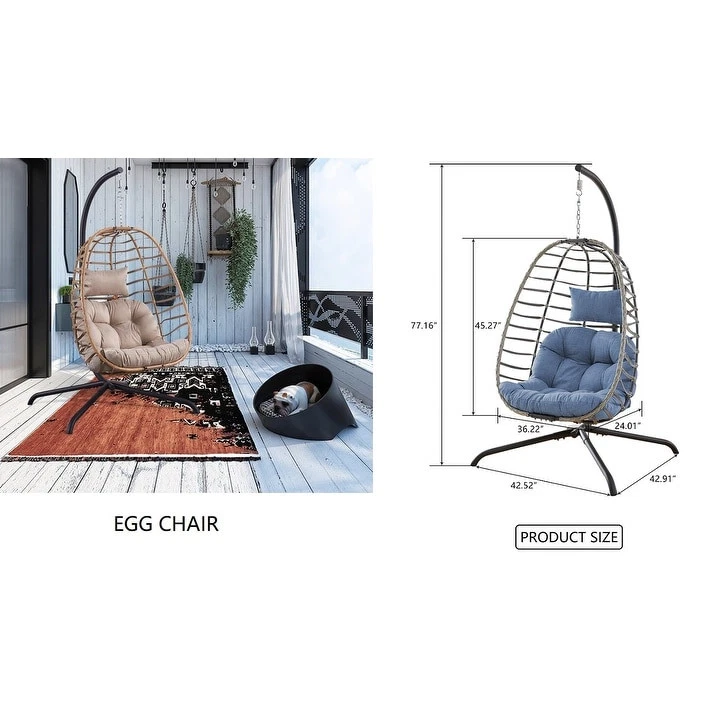 Material:Polyester, Rattan Stand Colour: Black Cushion Colour: Blue Hanging Basket Chair: 36.2"W x24 "D x45.2 "H Maximum Weight Recommendation:300 PoundsAbout this item Sturdy and ComfortableSeat and frame of egg chair is constructed of polyethylene rattan resin wicker wrapped around a iron frame for weather-resistant protection, strength and durability.Back features texling rope.Seat cushion and headrest pillow feature a polyester material and polyester fiberfill cores,sitting inside this patio egg chair will make you feel comfortable and relaxed. Large Size and Oversized CapacitySuper Large size basket chair:36.2"W x24 "D x45.2 "H;Weight Capacity 350 LBS.Gentle ergonomic curve support body perfectly,5 inches thick Premium Fluffy Cushion and headrest pillow giving you maximum Free Shipping Over $49.99* Details Outdoor Foldable PE Wicker Hanging Egg Chair with Cushion Product Description: Material:Polyester, Rattan Stand ColourBlack Cushion ColourBlue Hanging Basket Chair36.2"W x24 "D x45.2 "H Maximum Weight Recommendation:300 Pounds About this item Sturdy and ComfortableSeat and frame of egg chair is constructed of polyethylene rattan resin wicker wrapped around a iron frame for weather-resistant protection, strength and durability.Back features texling rope.Seat cushion and headrest pillow feature a polyester material and polyester fiberfill cores,sitting inside this patio egg chair will make you feel comfortable and relaxed. Large Size and Oversized CapacitySuper Large size basket chair:36.2"W x24 "D x45.2 "H;Weight Capacity 350 LBS.Gentle ergonomic curve support body perfectly,5 inches thick Premium Fluffy Cushion and headrest pillow giving you maximum comfort to lounge about. Vertical FoldableThis wicker hanging chair has a unique design.When you don't use it,you can fold it up just by loosening the two screws on the top and bottom, which can greatly save your space. Indoor/OutdoorThe hanging egg chair with stand suitable for indoor and outdoor,wonderful addition to patio,deck,garden,yard,backyard,porch,bedroom,living room.The teardrop chair is also a great choice as a gift to your family and friends. Packing List: 1×Egg Chair 1 x Stand 1×Seat Cushion 1×Head Cushion 1×Hanging Chain 1×Hardware Kit