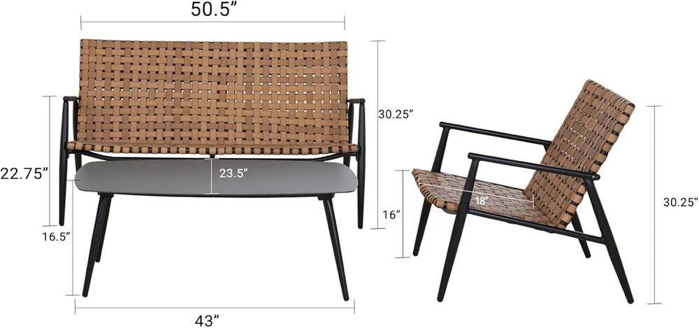 Store New Arrivals Add to Favorite View Feedback Contact 4 Pieces Outdoor Furniture Set, Leather-Look Patio Conversation Set, Vintage Brown Wicker Chairs Loveseat and 1 Coffee Table, Patio Furniture for Garden, Backyard, Porch Description Item Weight 124 Pounds Style Mid Century Modern Color Natural Brown Set Name 4-Piece Outdoor Conversation Set Material Aluminum & Wicker Item Weight 124 pounds Assembly Required Yes Shape Rectangular Package Dimensions 53 x 25 x 13 inches Product Care Instructions Wipe with Dry Cloth Size 4 Pieces Conversation Set PATIO FURNITURE: The deep-seated outdoor patio chairs and loveseat provide relaxed Adirondack-style comfort. Slop-down large seating area can effectively release spinal pressure and relieve fatigue, making you feel more comfortable sitting. Stone-look sprayed glass top coffee table is both beautiful and easy to clean LEATHER-LOOK: Weather-resistant and sturdy. Our handwoven wide faux leather wicker is ideal for the outdoor conversation set with enduring beauty and strength! It is extremely resistant to the sun, rain, heat, and cold not to crack, sag, or fade EASY TO MAINTAIN: The aluminum frame of 4-piece outdoor furniture set is pre-treated with meticulous cleaning and protective powder coating to enhance its resistance to rust, weathering, scratches, and fading RETRO DESIGN: The Mid-century Nordic-style patio furniture set features gently tapered legs, shrinkage treatment feet, and simple clean lines that would be perfect for the courtyard, porch, poolside, lawn, deck, garden, and backyard CUSTOMER SERVICE: This outdoor furniture to be free from defects in workmanship and materials, under normal residential use and conditions, for one year from the original purchase date Product description Redefine Your Outdoor Living! GRAND PATIO Outdoor Patio Furniture Set of 4 For over 20 years, we've partnered with internationally renowed designers to create collections that are equal parts luxurious and liveable- the kind that can transform your backyard into a personal oasis that plays host to life's most special moments. The video showcases the product in use. The video guides you through product setup. The video compares multiple products. The video shows the product being unpacked. Redefine Your Outdoor Living! GRAND PATIO OUTDOOR AKSEL 4 Piece Woven Retro Conversation Seating Set The accent arm chairs and loveseat are deep-seated with a lower profile, providing relaxed Adirondack-style comfort. Slop-down large seating area can effectively release spinal pressure and relieve fatigue, makes you feel more comfortable when sitting. Redefine Your Outdoor Living! GRAND PATIO OUTDOOR AKSEL Woven Retro Bistro Set of 2 Designed with comfort in mind, the backrest and seat will meet your body with a relaxed lounge style fit. The powder coated aluminum frames make this set low-maintenance and resistant to the outdoor elements of rain, heat, the sun's harmful uv rays and salty sea air. Redefine Your Outdoor Living! GRAND PATIO OUTDOOR AKSEL Woven Retro Lounge Chairs Set of 3 The tapered aluminum legs are reminiscent of the iconic mid-century Scandinavian style. Beautiful and durable faux leather featured in a wide all-weather wicker is perfect for adding an inviting indoor touch to your lawn, garden, courtyard, poolside, or balcony! Product Details All-Weather Resin Wicker UV, scratch, fade, and sag-resistant woven wicker delivers a low-maintenance leather-look. Powder Coated Aluminum Frame Provides superior rust protection, durability, scratch resistance and is lightweight for your convenience. Contoured Design Reclined seated angle is ideal for even weight distibution and joint pressure relief. Curved Glass Top The coated glass top makes it easy to clean and a great place to hold drinks, snacks, books and games. Product Specifications Add to Cart Add to Cart Add to Cart Add to Cart Customer Reviews 4.8 out of 5 stars 21 4.2 out of 5 stars 31 4.8 out of 5 stars 24 3.9 out of 5 stars 4 4.6 out of 5 stars 60 Price $399.99 $ 399 . 99 $169.99 $ 169 . 99 $219.99 $ 219 . 99 — $69.99 $ 69 . 99 Set includes Chair*2, Table*1, Loveseat*1 Chair*2 Chair*2 and Coffee Table*1 Loveseat Chair*1 wicker bench*1 Material Powder Coated Aluminum Frame Powder Coated Aluminum Frame Powder Coated Aluminum Frame Powder Coated Aluminum Frame Powder Coated Aluminum Frame Wicker All-weather Wicker All-weather Wicker All-weather Wicker All-weather Wicker All-weather Wicker Wicker Color Natural Brown Natural Brown Natural Brown Natural Brown Natural Brown Frame Color Black Black Black Black Black Weight Capacity of Each Chair 350 LBS 350 LBS 350 LBS 350 LBS 350 LBS Table ✔ ✘ ✔ ✘ ✘ 1 Year Service ✔ ✔ ✔ ✔ ✔ What is the weight limit of the chair? Each chair can hold up to 350 lbs. Is the chair waterproof? Yes, it works fine! The chair is made of rattan, waterproof and fade resistant. What is the difference between rattan and wood? This kind of rattan has a wooden appearance, and is more comfortable than the normal wood adirondack chair. Are the nuts and bolts stainless steel? Yes! The chair has been outside for a year and there is no rust. Does this kind of rattan need to be painted to protect? No. This kind of rattan rated at 2000 UV hours and resists fading for up to 3 years. ABOUT US We offer the best prices around on high quality products. Our E-store includes media such as books, movies, music and games while offering electronics, toys, sporting apparel, clothing, tools, general home, garden items and more. SHIPPING We are always working hard to ensure your package arrives as soon as possible. Please understand that some factors like weather, high postal traffic, and the performance of shipping companies are outside of our control. For shipping outside of the continental USA, we only use eBay's Global Shipping Program.The item is shipped to KY and then sent to the rest of the world. International customers are responsible for all duties and taxes. Continue to check