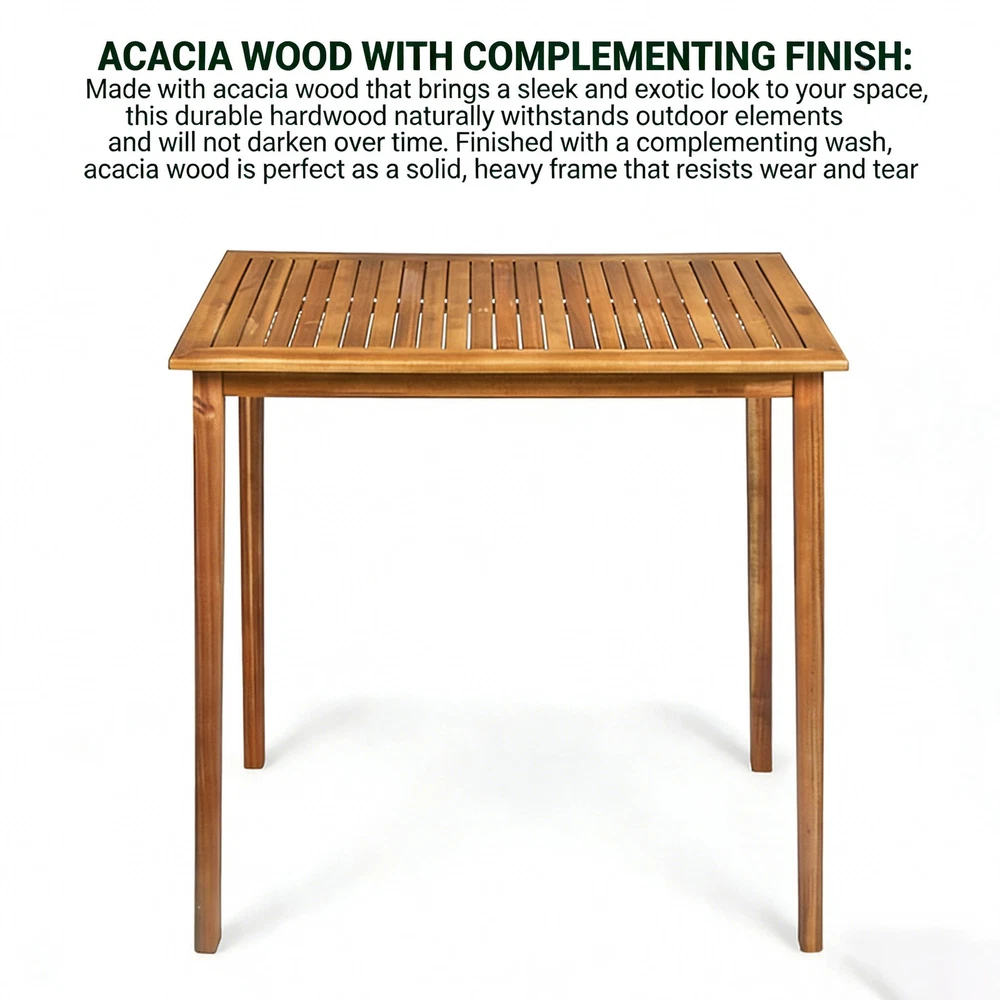 🌟 Product Highlights Timeless Minimalist Aesthetic : Boasting a clean rectangular shape and neatly arranged slatted tabletop, this bar table exudes a natural charm that highlights its smooth, refined lines. Paired with slim, tapered legs, it delivers a simplistic yet sophisticated look that complements any decor style—from modern patios to cozy kitchen nooks. Durable Acacia Wood with Teak Finish : Crafted from high-quality acacia wood, this table brings an elegant, exotic touch to your space. As a robust hardwood, it naturally stands up to outdoor elements like sun, rain, and humidity without darkening over time. The complementary teak wash enhances its natural grain while forming a protective layer, ensuring the solid, sturdy frame resists wear and tear for years. Bar Height Perfect for Versatile Use : Standing at 40 inches tall—ideal bar height—this table is a seamless addition to your outdoor patio, backyard, kitchen, or dining room. It pairs perfectly with bar stools for casual meals, cocktails, or outdoor gatherings (chairs not included). Hassle-Free Maintenance : Naturally weather-resistant to most outdoor elements, this table is designed for low upkeep. Extend its lifespan even further by covering it or storing it indoors during extreme weather conditions. Easy Assembly Included : Some assembly is required, but we've got you covered! All necessary instructions and tools are included in the package—no extra purchases needed. Set it up in minutes and start enjoying your new table. 📐 Product & Package Specifications Specification Type Details Assembled Length 44.00 inches Assembled Width 25.00 inches Assembled Height 40.00 inches Product Weight 29.76 lbs Package Length 47.00 inches Package Width 28.00 inches Package Height 6.00 inches Package Weight 35.96 lbs 🛡️ Our Promise to You We stand behind the quality of our products! Enjoy a 1-Year Warranty against manufacturing defects and a 30-Day Free Return & Exchange Policy —if you're not completely satisfied with your purchase, simply reach out to our customer service team for a hassle-free solution. Note: Chairs are not included with this bar table. For best results, clean with a damp cloth and avoid harsh chemicals.