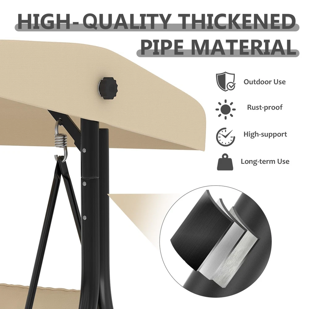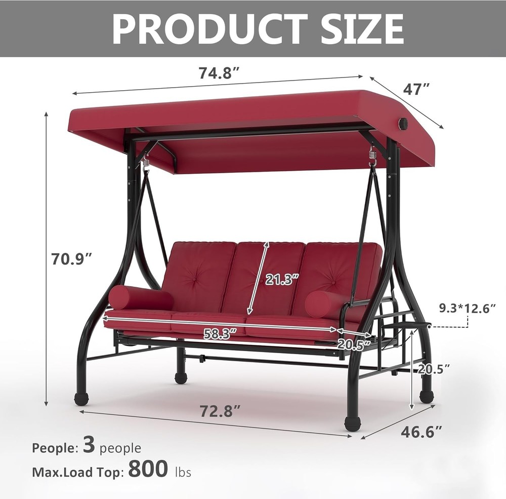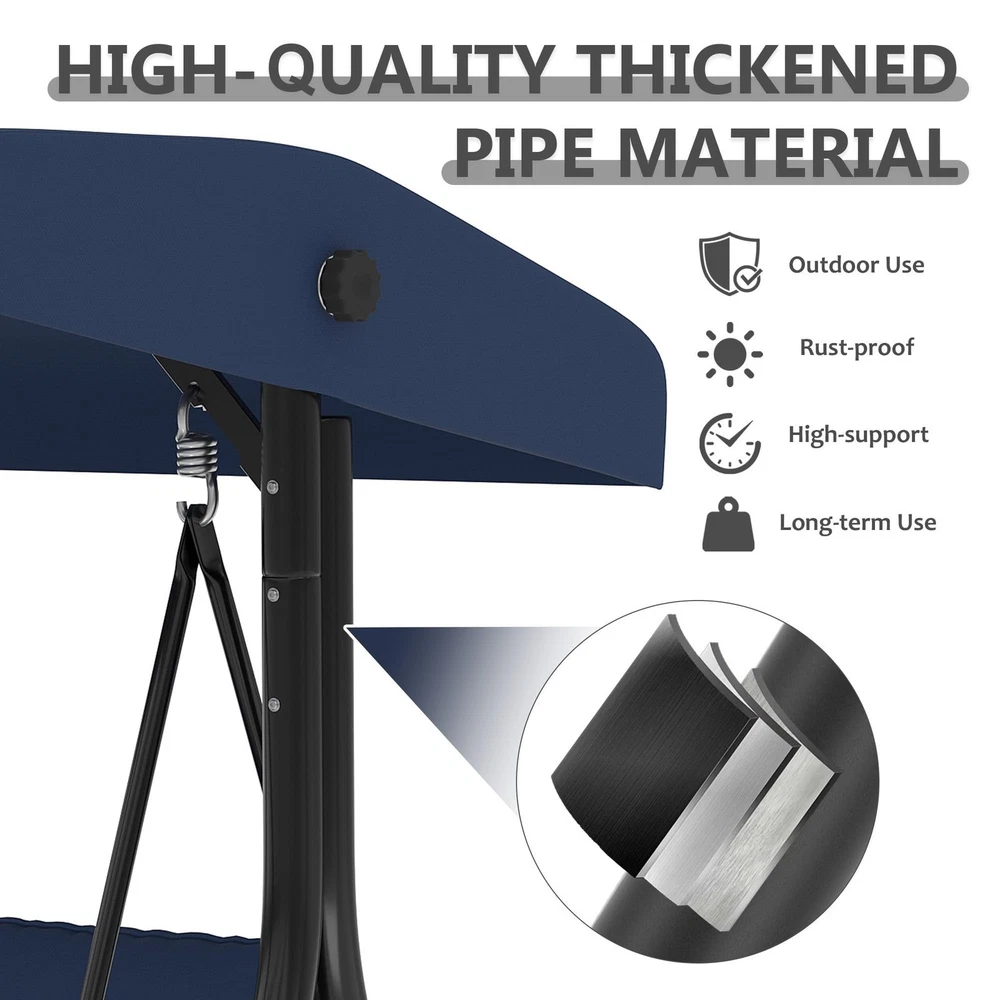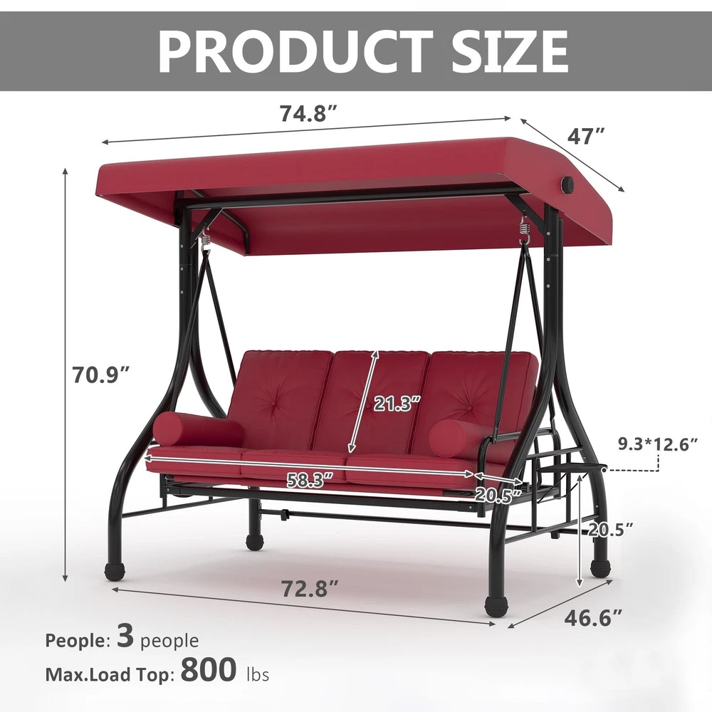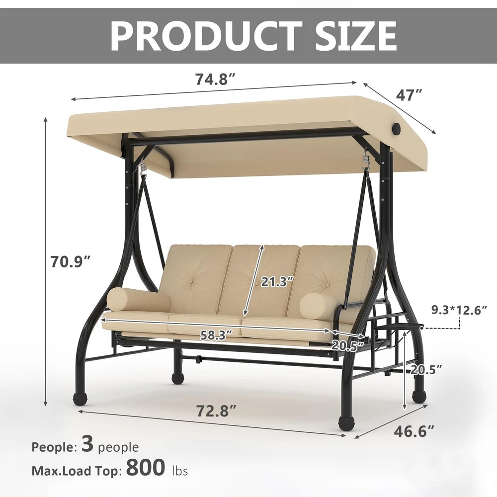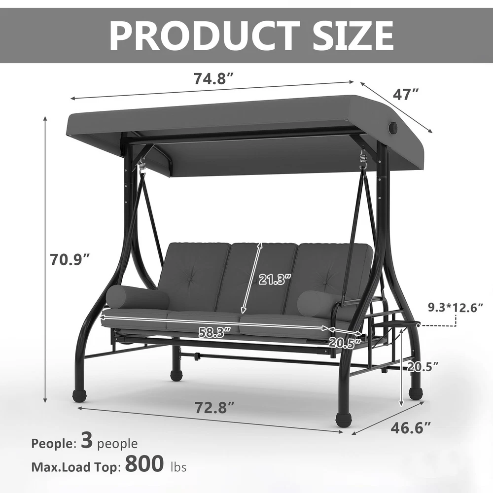 Outdoor Porch Swing with Adjustable Canopy 3-Seat Garden Patio Swing Chair ADJUSTABLE CANOPY FOR ALL-DAY SHADE:Designed with a smooth knob adjustment system, this patio swing with canopy allows you to tilt the roof to different angles for better shade throughout the day. The UV-resistant fabric helps reduce sun exposure while relaxing on your outdoor swing chair. HEAVY-DUTY METAL FRAME WITH STABLE TRIANGLE STRUCTURE:Built with thick powder-coated steel tubing and a reinforced triangular base, this porch swing with stand offers excellent stability and durability. The rust-resistant metal frame supports up to 800 lbs, making it a reliable outdoor swing for adults. DUAL CUP HOLDER TRAYS FOR CONVENIENT STORAGE:Equipped with two side trays, this patio swing chair provides space for up to four cups or small items such as phones and snacks. Enjoy drinks and conversation comfortably while relaxing on your porch swing. RECLINES UP TO 180° FOR LOUNGE-STYLE COMFORT:Designed with a flexible backrest mechanism, the seat can recline up to 180 degrees, easily transforming the outdoor porch swing into a relaxing swing bed. Ideal for reading, chatting, or simply unwinding in your patio or garden. PLUSH CUSHIONS WITH PILLOWS FOR ADDED COMFORT:Soft seat cushions combined with supportive lumbar pillows create a comfortable seating experience. The water-resistant fabric and replaceable foot pads help enhance durability, making this patio swing suitable for patios, balconies, poolside areas, and gardens. From the brand 3 Seat Heavy-duty Porch Swing 3 Seat Porch Swing Textilene Outdoor Lounge Chair Product description Payment Delivery details Returns details Feedback Payment We accept Payoneer only. All major credit cards are accepted through secure payment processor PayPal. Payment must be received within 7 business days of auction closing. If you have bought multiple items from me, you can send me one payment for all the items instead of paying for them individually. When you click the Pay Now button, eBay will automatically determine if there are other items you have won or purchased from me and will combine them for your review. NOTE: Import duties, taxes and chargers are not included in the item price or shipping charges. These charges are the buyer's responsibility. Please check with your country's customs office to determine what these additional costs will be prior to bidding buying. Delivery details 1. We will delivery out at the handing time when we receive the payment. 2. The delivery time is 3-5 business days to US by usually time.The parcel maybe delay 1-2day of the weekend.Due to the bad weather,Holidays,Hot Season ect.the parcel maybe delay,If you have any problems,mssage us,we will try our best to solve it. 3. We ship to your eBay address. Please make sure your eBay address is correct before you pay. 4. If you want to change the shipping address,message us before our send out. 5. We cannot deliver your order if your state is PR. Returns details 1. If you donot receive the items at the delivery time,the parcel has broken/missing,Please message us before you open case/return,we will try our best to solve it. 2. We offer a 30 day return policy from checkout winning date. 3. An RMA number is required for all returns. Message us for return instructions. Items Returned without a RMA number will not be processed. 4. Items defective upon receipt must be packaged in their retail packaging as if new and returned with a detailed description of the problem. 5. Return shipping fees are not refundable. We reserve the right to decline any returns if the above guidelines are not followed. Feedback If you are not satisfied with the item for any reason, please do not quick to leave negative/neutral feedback even open request and case without any communication with us. We devote ourselves making EVERY CUSTOMER in 100% Satisfactory and resolve any problem. Thank you for your understanding and recognition,we are always leave positive feedback to all our customers. Reply: All replies will be sent to your email box, if you do not get response within 24 hours (Sat. & Sun. excluded) please check your eBay My Messages in case that our emails will be filtered automatically by your settings. Brand Unbranded Item Height 70.9 in Item Length 74.8 in Item Width 46.6 in Type Armchair