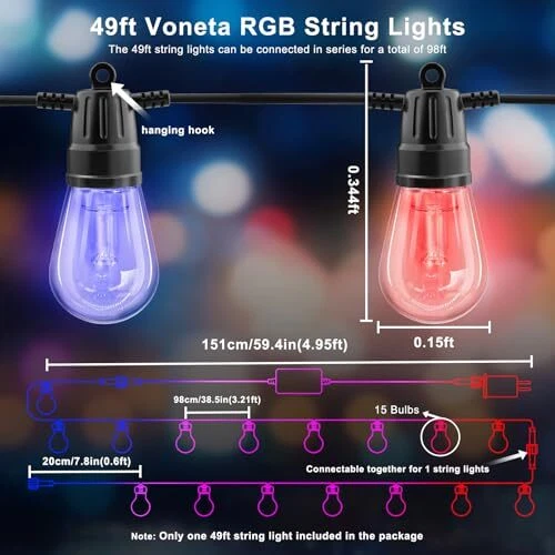 Return Policy Fast Delivery Trusted seller Outdoor RGBW String Lights, 49ft 15 Bulbs Patio Lights with Remote & APP, S14 Dimmable Color Changing IP68 Waterproof Dimmable LED Hanging Lights for Garden Yard Porch Party Product Description ?【Creative APP & Remote Control RGBW Outdoor String Lights】Customize the color of the permanent outdoor lights through the Magic Lantern APP. T are 16 million colors and 47 vibrant scene modes for you to choose from, and they can also be adjusted to warm white , you can DIY your favorite color for each bulb, suitable for a variety of scenarios use. ☔【Commercial Grade IP68 Waterproof String Lights】The RGB patio lights have 15 pieces shatterproof bulbs, This thickened PC S14 bulb is shatterproof and not easy to deform. The LED dimmable string lights adopt a fully enclosed IP68 waterproof design as a whole, and can be used in environments such as sun, wind, rain, snow, and humidity. Our Bulb composed of high-quality industrial-grade plastics, are light and safe, and have better anti-fall ability.【Note: the power adapter is not waterproof】 ?【Smart Control & Music Sync RGBW Lights】You can adjust the brightness between 0%-100% with the mobile APP, you can also set timers and schedule times to control when gazebo lights turn on/off. The smart garden lights also have a built-in microphone, which can synchronize the outdoor lights with any type of music. The party lights outdoor dance with the music, allowing you to enjoy an unparalleled immersive sound and light experience on Christmas, Halloween, and other festivals. ?【Multi-String and Easy to Install String Lights for Outside】Our 49ft RGBW hanging lights can be connected in series make outdoor color changing lights to extend up to 98ft in length, which is great for your large yard use and your need. And the 0.19"/0.016ft diameter hanging holes and included hooks allow you to easily hang your outdoor string lights on a wall, coffee shop, garden or backyard using wires, ties or screws.【Note: We only have one string lights in the package】 ?【Wide Application Indoor & Outdoor Ambient Lights】Our RGBW outdoor lights for patio provide amount of lights for deck, porch, gate, terrace, bistro, trail, restaurant, garden, tent, backyard, wedding, leisure, dinner party, Christmas, halloween decor. We provide 24 month comprehensive warranty. If you have any questions about rgb string lights outdoor, please feel free to contact us via the message box or customer service email, we will give you satisfactory solution within 24 hours. Shipping Returns Payment Shipping Shipping is FREE to all addresses other than APO/PO boxes in the lower 48 states. All our stock ships from US-based warehouses. Shipped via USPS or UPS (depending on location and package weight) Unless stated otherwise, all orders will ship within 24-72 hours of your payment being processed. Check our feedback to see the great reviews of FAST shipping we offer. Returns Seller does not accept returns Payment We currently accept payment via eBay managed payments only. Once payment is cleared, we will dispatch your shipment within 1-3 business days. Please refer to the "Shipping" tab for more information regarding shipping speed to your destination.