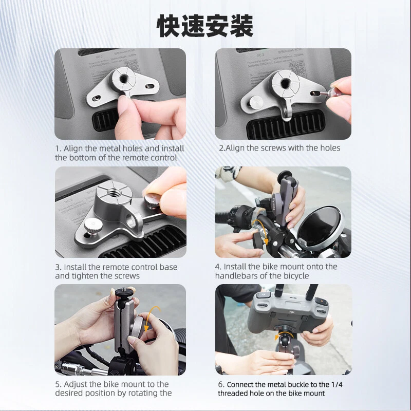 Product Description If you have any questions, please contact customer service first, do not open disputes easily, thank you! Feature: 1.Aluminum alloy base specially designed for DJI RC/RC 2. 2.Dual ball head design, more flexible, meet more angle adjustment. 3. Clamps to any 0.78 to 1.96in (2 to 5cm) diameter tubes. 4.The metal clip has two screw holes, which are compatible with RC/ RC2 remote controllers with screens. 5.1.Attached to aluminum alloy spacer to connect to DJI RC/RC2 remotes. Can be attached directly to cameras with screw holes. Complimentary adapter, you can connect /OSMO Pocket 3 / Action 4 and other cameras 6.Can be stored in a carrying case, explosion-proof box, original packaging, etc. Specification: Material: Aluminum alloy+ABS Applicable models: For RC/RC2 Remote Control(other models are not applicable, please check your remote control model before purchase) Color: Black+Silver Net weight:9.21oz(263.3g) Packaging includes: Cycling Mount*1 Sankwa Adaptor*1 1/4 adapter*1 Long screw*1 Hand screw*2 Metal buckle*1 Instructions manual*1 Note: 1.Does not include Sports camera, 2.Transition: 1cm=10mm=0.39inch, 3.Please allow 1-3mm error due to manual measurement. please make sure you do not mind before ordering, 4.Due to the difference between different monitors, the picture may not reflect the actual color of the item,please make sure you do not mind before ordering, Thank you! About Us We accept all payments authorized by eBay. powered by On Aug 8, 2024 at 00:31:45 PDT, seller added the following information: