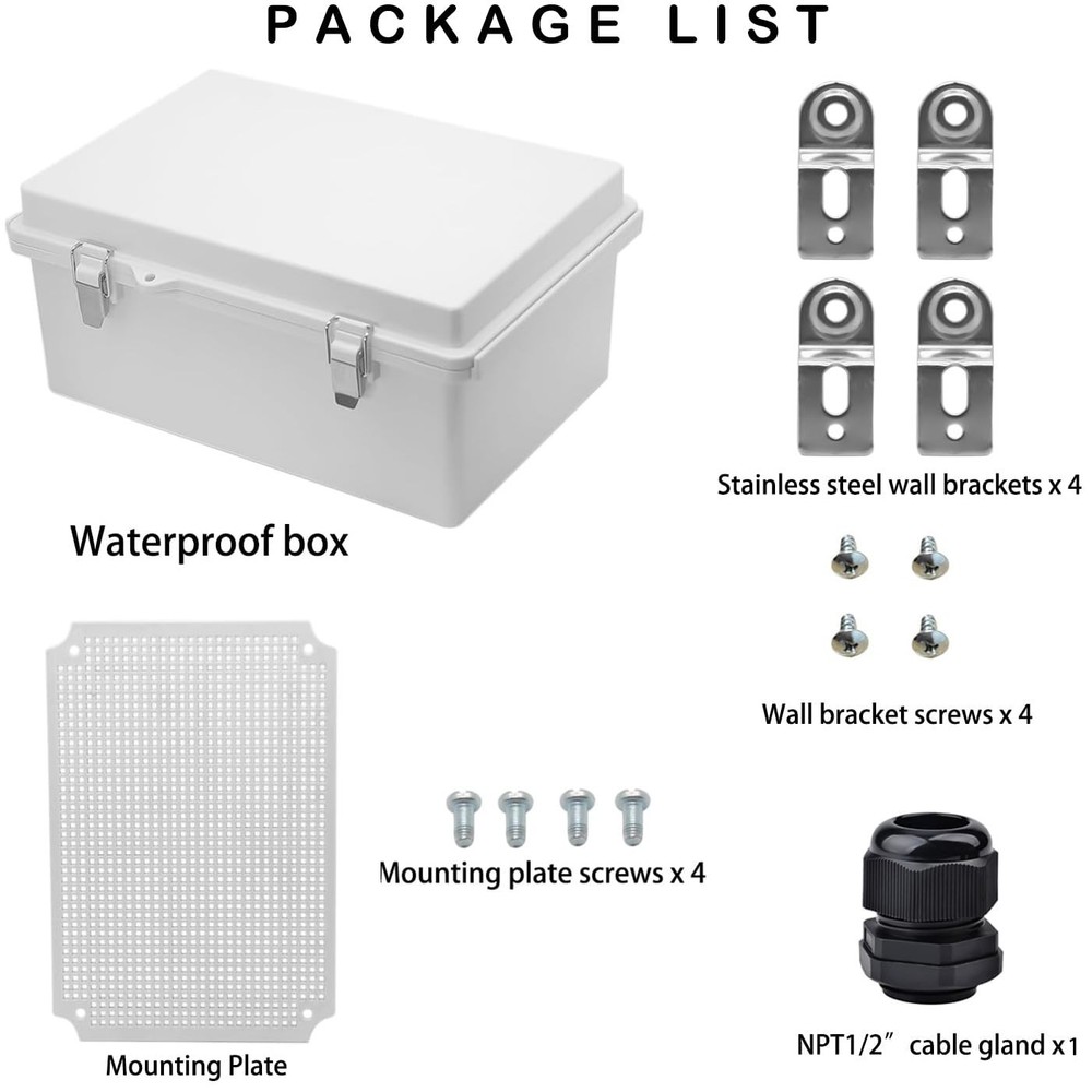 Outdoor Waterproof Electrical Junction Box – Weatherproof IP67 ABS Plastic Enclosure 11.1" x 7.5" x 5.5" Product Details: Outdoor waterproof electrical box with mounting plate for easy installation Includes 4 stainless steel wall brackets for versatile mounting options 1/2" NPT cable glands included for secure wire connections Black seal gasket with stainless steel latches provides dust and water protection IP67 rated: dust-tight and protected against moisture, even under jetting water Made of durable ABS plastic with impact resistance for long-lasting outdoor use Can be drilled and customized without cracking for DIY projects Ideal for switches, routers, WiFi extenders, power supplies, pump controllers, and more Perfect for home, workshop, or outdoor project applications