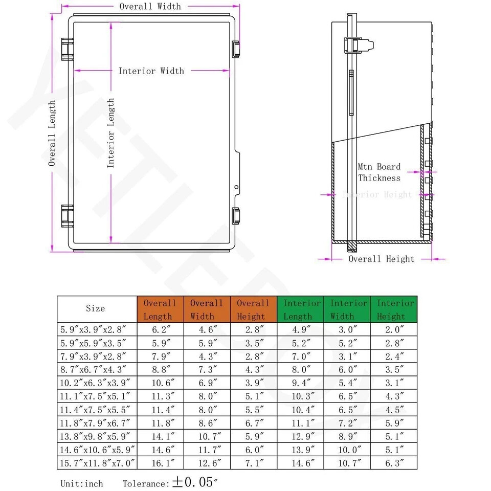 BRAND NEW: Waterproof Electrical Box, IP67 Junction Box Stainless Steel Latch Hinged Grey Cover Project Enclosure with Wall Bracket 11.1"x7.5"x5.5" Material Acrylonitrile Butadiene Styrene Color Grey Installation Type Wall-Mounted Manufacturer YETLEBOX About this item [Easy to Customize and Install]:The outdoor waterproof electrical box includes mounting plate that allow you to mount your board or device in the project box easily. Also come with 4 stainless steel wall brackets can be used to hang the junction box on walls.when you need to connect wires you can use 1/2" NPT cable glands are included .This junction box can be drilled and shaped easily without cracking,helping you customize any projects effortlessly. [Stainless Steel Latches and Outdoor Use]:This weatherproof outdoor box with black seal gasket and 304 stainless steel latches,sturdy and durable,protecting against water and dust infiltration,great for use in outdoor environments. [IP67 Grade]:IP67 waterproof grade, which means dust-tight and protected from moisture challenges up to jetting water, keep all your electrical equipment Safe & Dry even in harsh environments. [More Sturdy]:Made of high quality ABS plastic which has longer serve time and superior in impact resistance. Sturdy junction box can offer well protection for your projects in outdoor. [Versatile Application]:This outdoor enclosure is made of ABS plastic,receives WiFi signals well, Great for switch,router, wifi extender, power supply,pump controller, home DIY projects, and etc.This versatility gives you more flexibility to DIY. THANK YOU.