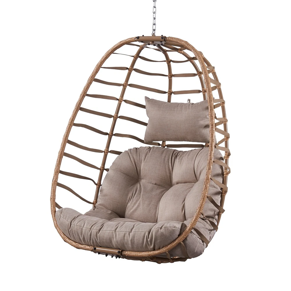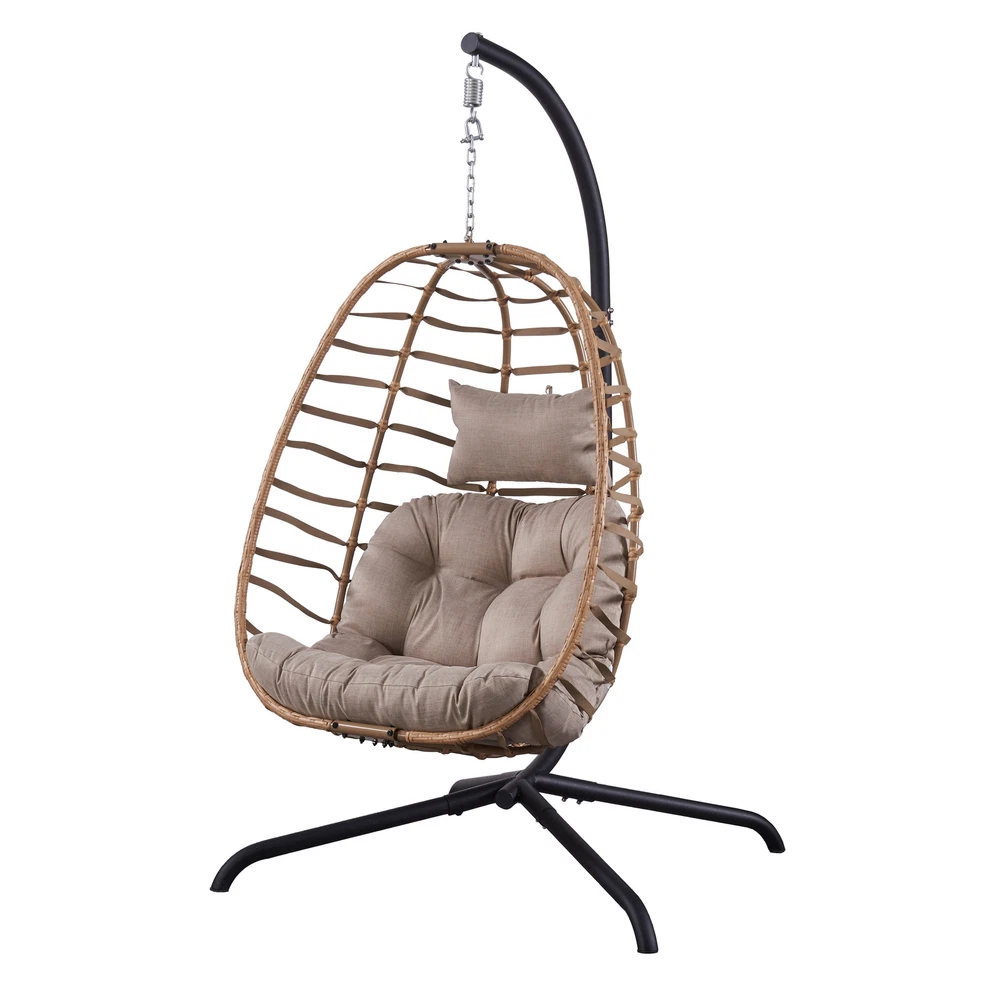 Material:Polyester, Rattan Stand Colour: Black Cushion Colour: Brown Egg Chair Size: 36.2"W x24 "D x45.2 "H Cushion Size: 43.5"W x5 "D x33.5 "H Head Cushion Size:17.5"W x 10"H Maximum Weight Recommendation:300 PoundsAbout this item Sturdy and ComfortableSeat and frame of egg chair is constructed of polyethylene rattan resin wicker wrapped around a iron frame for weather-resistant protection, strength and durability.Back features texling rope.Seat cushion and headrest pillow feature a polyester material and polyester fiberfill cores,sitting inside this patio egg chair will make you feel comfortable and relaxed. Large Size and Oversized CapacitySuper Large size basket chair:36.2"W x24 "D x45.2 "H;Weight Capacity 350 LBS.Gentle ergonomic curve support body perfectly,5 inches thick Free Shipping Over $49.99* Details Outdoor Wicker Egg Hanging Basket Swing Chair Product Description: Material:Polyester, Rattan Stand ColourBlack Cushion ColourBrown Egg Chair Size36.2"W x24 "D x45.2 "H Cushion Size43.5"W x5 "D x33.5 "H Head Cushion Size:17.5"W x 10"H Maximum Weight Recommendation:300 Pounds About this item Sturdy and ComfortableSeat and frame of egg chair is constructed of polyethylene rattan resin wicker wrapped around a iron frame for weather-resistant protection, strength and durability.Back features texling rope.Seat cushion and headrest pillow feature a polyester material and polyester fiberfill cores,sitting inside this patio egg chair will make you feel comfortable and relaxed. Large Size and Oversized CapacitySuper Large size basket chair:36.2"W x24 "D x45.2 "H;Weight Capacity 350 LBS.Gentle ergonomic curve support body perfectly,5 inches thick Premium Fluffy Cushion and headrest pillow giving you maximum comfort to lounge about. Vertical FoldableThis wicker hanging chair has a unique design.When you don't use it,you can fold it up just by loosening the two screws on the top and bottom, which can greatly save your space. Indoor/OutdoorThe hanging egg chair with stand suitable for indoor and outdoor,wonderful addition to patio,deck,garden,yard,backyard,porch,bedroom,living room.The teardrop chair is also a great choice as a gift to your family and friends. Packing List: 1×Egg Chair 1 x Stand 1×Seat Cushion 1×Head Cushion 1×Hanging Chain 1×Hardware Kit