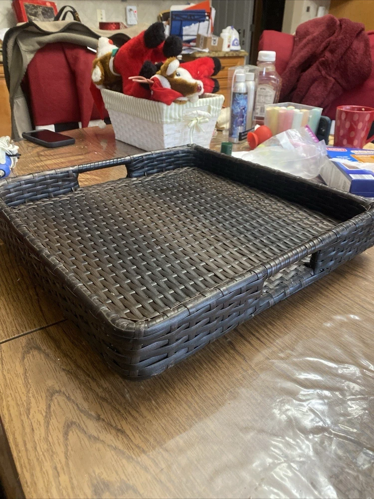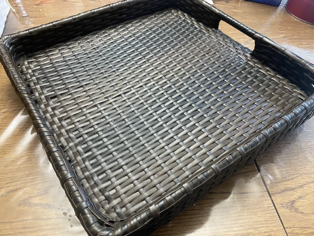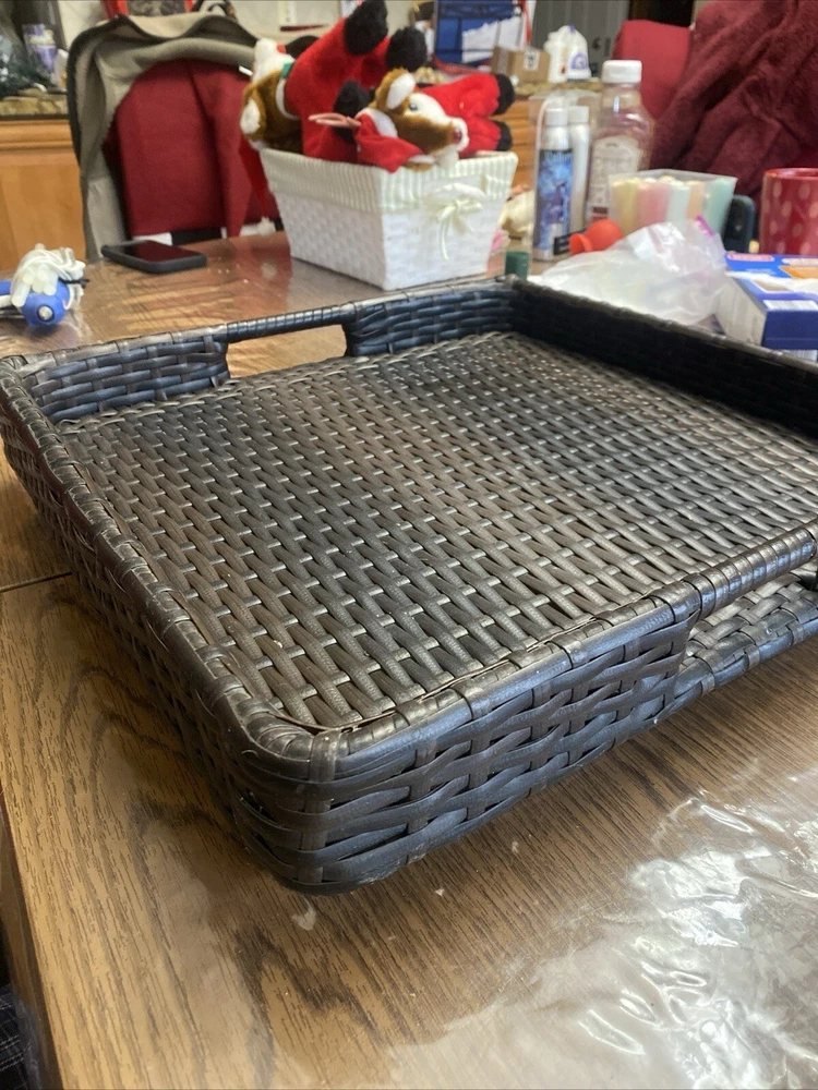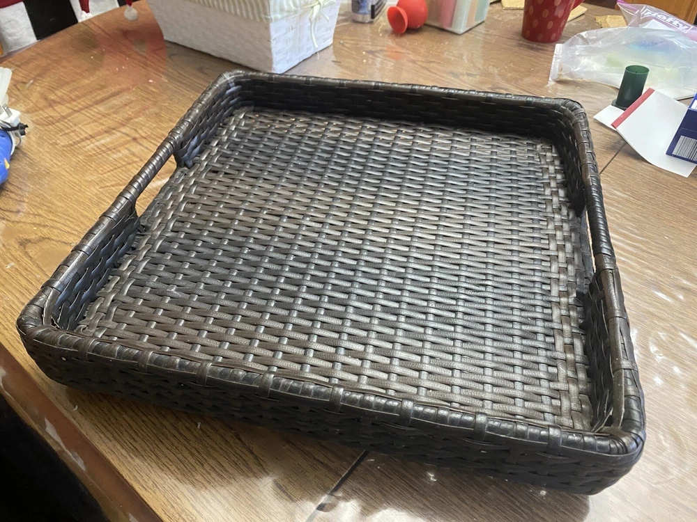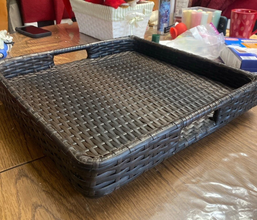 Outdoor/Indoor Hand Woven PE Rattan Large Serving Tray W/ Handles & Pedestal. Condition is Used. Shipped with USPS First Class.