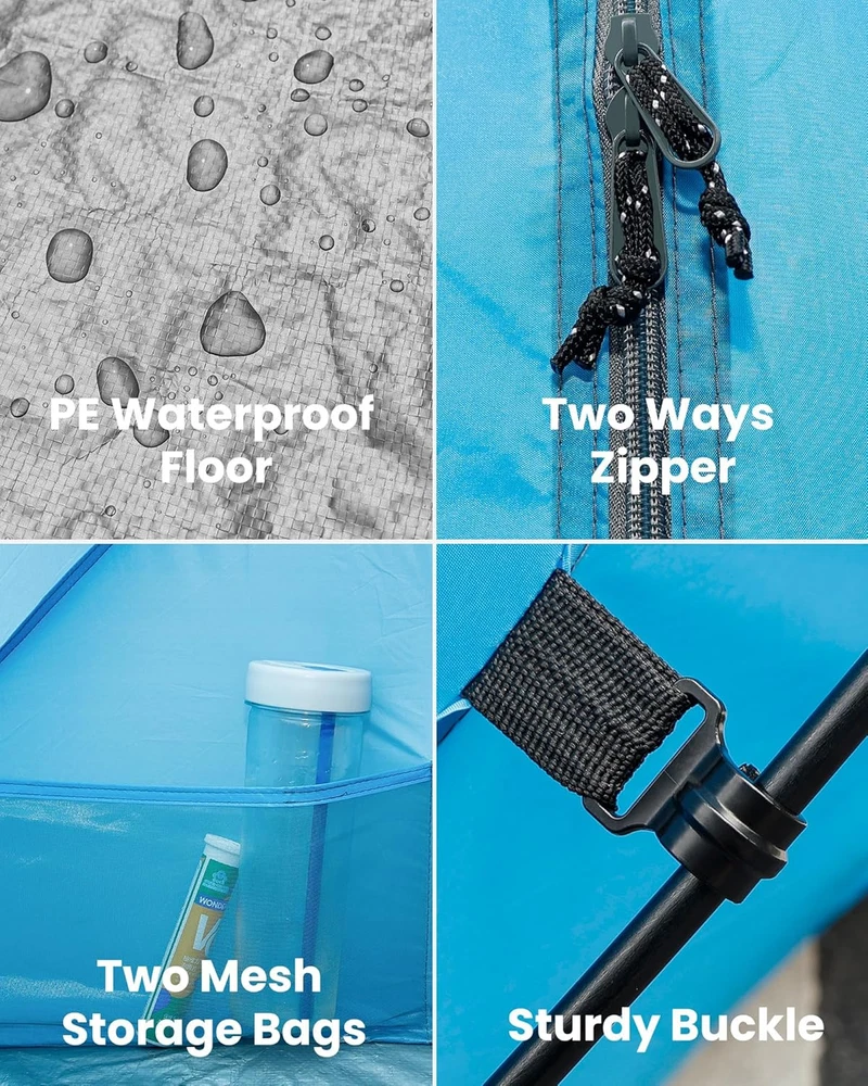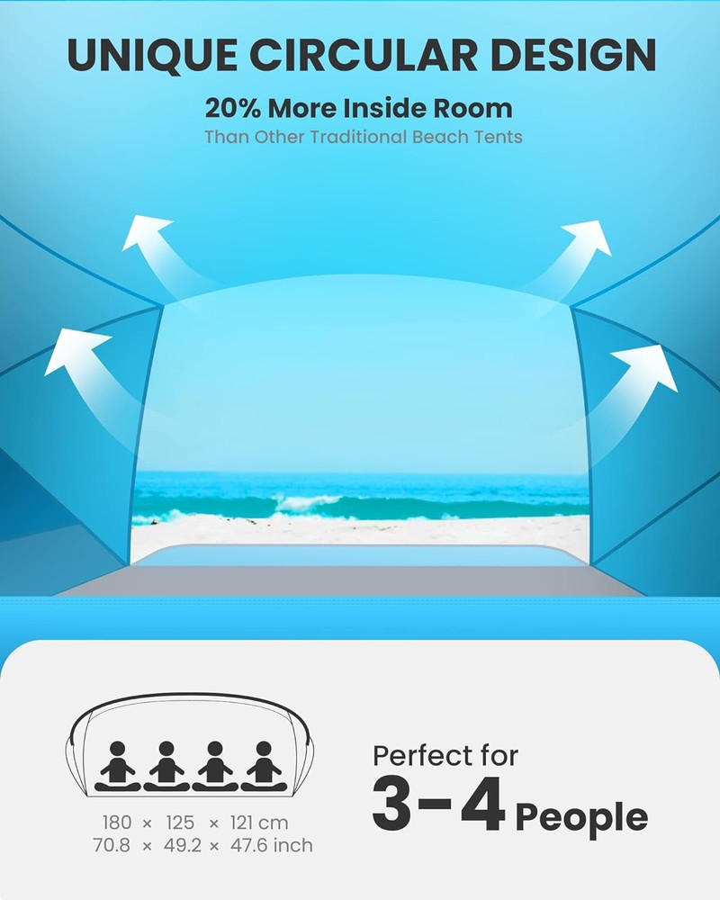 OutdoorMaster Beach Tent for 3-4 Person - Easy Setup and Portable Blue Product Details Brand: OutdoorMaster Material: Polyester Color: Blue Item Weight: 2.42 Kilograms Recommended Uses For Product: beach Product Dimensions: 71"L x 49.2"W x 47.6"H Ultraviolet Light Protection: Yes Frame Material: Fiberglass Closure Type: Zipper Water Resistance Level: Waterproof Pole Material Type: Fiberglass Coverage: UV Protection Assembly Required: No Item Package Dimensions L x W x H: 16.3 x 6.61 x 6.38 inches Package Weight: 2.4 Kilograms Item Dimensions LxWxH: 71 x 49.2 x 47.6 inches Brand Name: OutdoorMaster Model Name: beach tent Manufacturer: OutdoorMaster Part Number: 803940 Style: Portable Sport Type: Camping Brand: OutdoorMaster Material: Polyester Color: Blue Item Weight: 2.42 Kilograms Recommended Uses For Product: beach Spacious Interior For Whole Family: The unique circular design of the tent allows for a 20% increase in capacity compared to the regular triangular design. OutdoorMaster beach tent enough room for 2 adults and 1/2 kids to sit in the inside. Ideal for family car camping or camping site Upgraded & Durable Design: We increased the thickness of the fiberglass frame from 7.0mm (market standard) to 8.0MM, will be safer, more durable and rust free, which support tent stably stand by itself and keeps shape after long time use Easy Set Up & Carry: Setting up fast within minutes. Our beach tent sun shade is much easier to fold than other beach tents. It could fold down to a travel size of 16.77 x 7.8 x 6.24 inches, lightweight and easy to fold down with a compact carrying bag for easy travel and storage UPF 50+ Protection & Weather Proof: Our beach tent is made of premium 210T sun-proof material coated polyester, it can effectively block heat and 98.5% of the harmful UV rays. Rated 4000mm PU coating, this beach tent is completely weather proof, ensuring you stay dry even during rain or light snow Versatile Design: Our tent for beach built-in zippered door offers privacy to change into dry clothes. The extended front floor provides extra room for more activities. The sun shade with ample mesh panels allow views and enhances cross-ventilation to help manage condensation