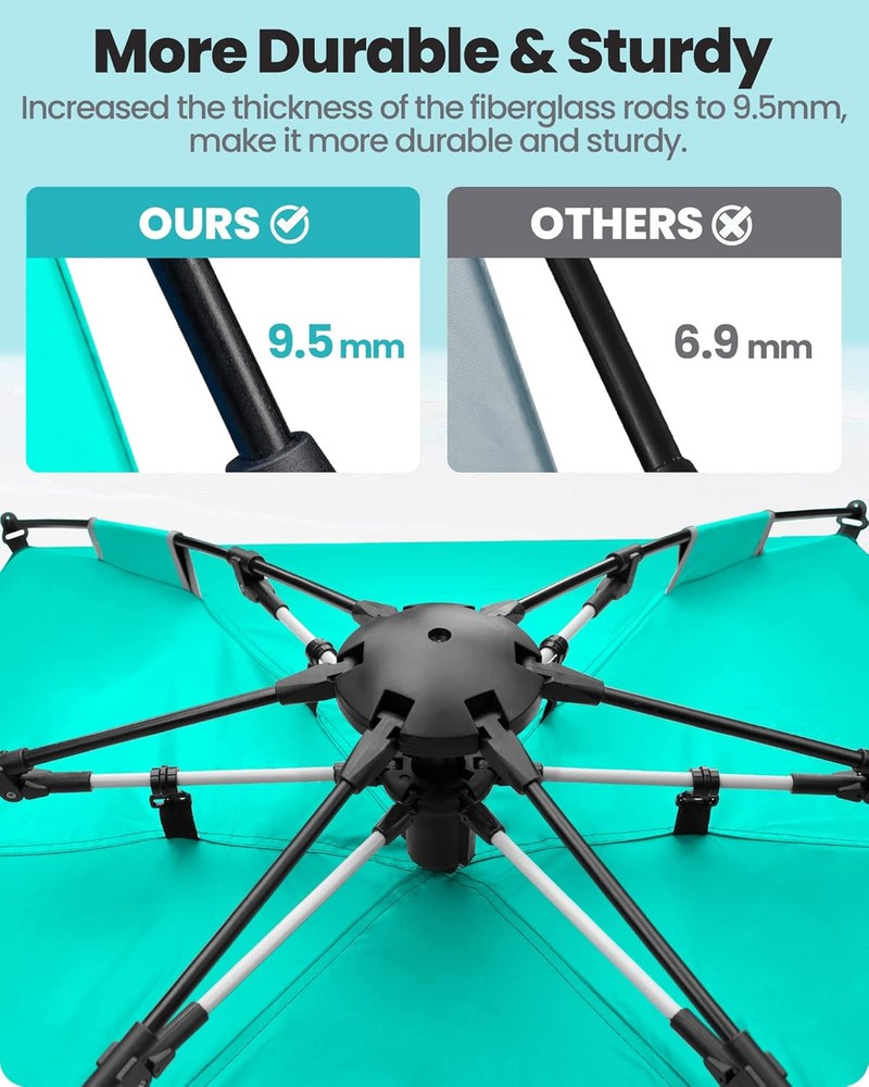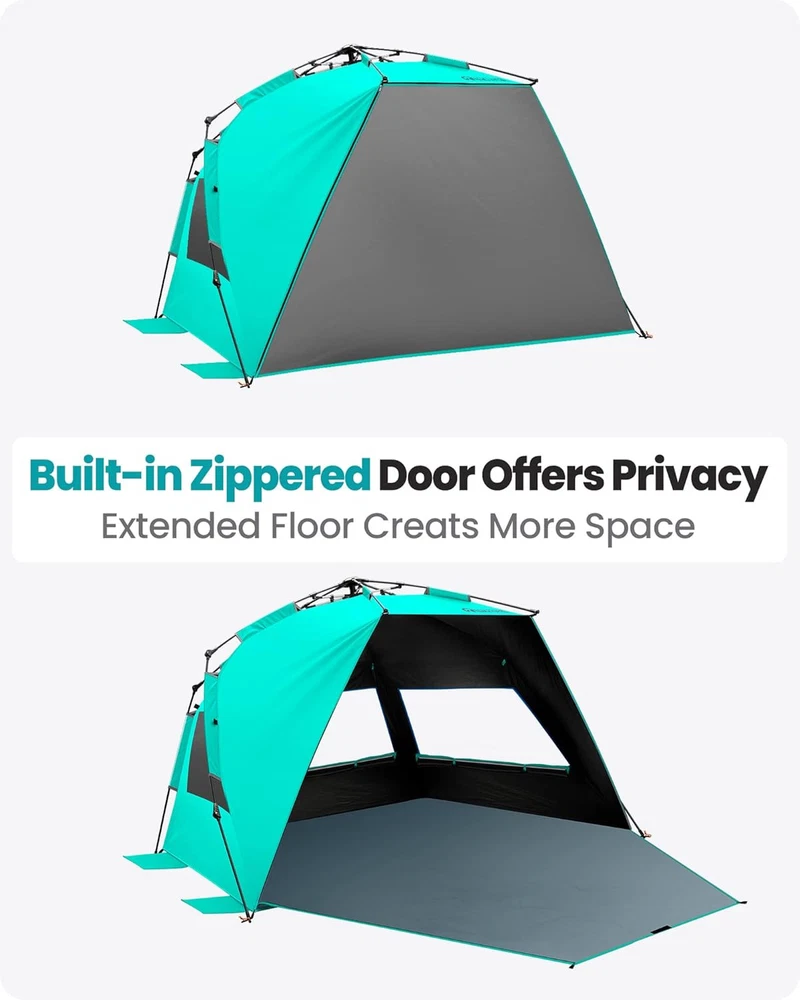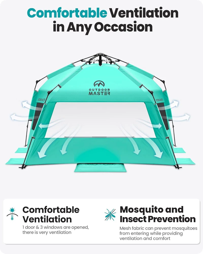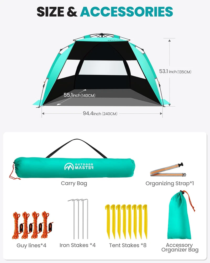 OutdoorMaster Beach Tent with Blackout Shelter Technology, Portable Green Product Details Brand: OutdoorMaster Material: 190T Spring Asia Textile Color: Green Item Weight: 8.5 Pounds Recommended Uses For Product: Beach, Camping & Other Outdoor Activities Product Dimensions: 94.4"L x 55.1"W x 53.1"H Ultraviolet Light Protection: BLOCKING 99.95% OF UVA and UVB RAYS (UPF 50+), ELIMINATES 95% SUNLIGHT Frame Material: Alloy Steel Closure Type: Zipper Water Resistance Level: Waterproof Pole Material Type: Metal Coverage: Waterproof 190T Spring Asia Textile with Blackout Shelter Technology and UV Protection Number of Guylines: 4 Assembly Required: No Item Package Dimensions L x W x H: 39.1 x 9.5 x 8.3 inches Package Weight: 4.45 Kilograms Item Dimensions LxWxH: 94.4 x 55 x 53 inches Brand Name: OutdoorMaster Model Name: beach tent Manufacturer: OutdoorMaster Part Number: 803838 Style: Portable Brand: OutdoorMaster Material: 190T Spring Asia Textile Color: Green Item Weight: 8.5 Pounds Recommended Uses For Product: Beach, Camping & Other Outdoor Activities Blackout Shelter Technology: Our Instant Shade Blackout Shelter is different from others on the market as it not only blocking 99.95% of UVA and UVB rays (UPF 50+), also eliminates 95% sunlight to protect your skin and objects for a more comfortable rest anytime of day 9.5MM Thickened Rods & 190T Material: We increased the thickness of the rods from 8.0mm (market standard) to 9.5MM and made with 190T Spring Asia Textile, this beach tent sun shelter is more rugged than other lower ones thus handle the wind firmly and stable without breaking or tearing Spacious Interior For 4 Person Tent: With the dimension of 94.4 x 55.1 x 53.1 inch, OutdoorMaster beach tent pop up shade enough room in the XL beach tent for 2 adults and 2 kids to sit in the inside. Ideal for family car camping or camping site Versatile Design: Our tent for beach built-in zippered door offers privacy to change into dry clothes. The extended front floor provides extra room for more activities. overhead Mesh pockets make it possible to store valuables Ventilation & Visibility: The pop up sun shade with ample mesh panels allow views and enhances cross-ventilation to help manage condensation. The beach tents sun shelter 4-5 person has 1 large mesh door, 3 large screen panels, which boost the airflow and keep the bugs out Portable & Easy To Carry: This sun beach tent attached 4 sand pockets, comes with 4 Iron stakes, 8 plastic stakes & 4 guy lines strings to support extra stability, completely portable once set up with the carry bag