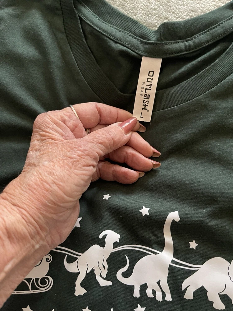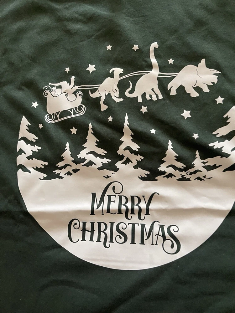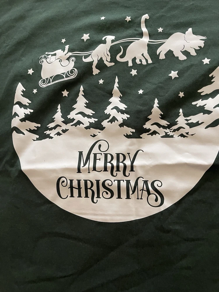 Bring some unique charm to your Christmas decor with this Outlast Weat NWOT Hunter Green Sz L Santa short sleeve tee shirt (new was $23). The Santa is depicted in a sleigh with three dinosaurs as reindeer, making it a perfect addition to your holiday collection. The shirt is made of 100% cotton and features an embossed decal of Santa and sleigh as a night scene in the sky. This NWOT unisex is perfect for those who love to have unique and eye-catching clothing. It measures 29 inches in length from top of shoulder to hem; 20.5” under armpit / chest area side to side; 22” side to side at hem. The shirt is very cute and funny! Ships fast! Thanks for Looking!