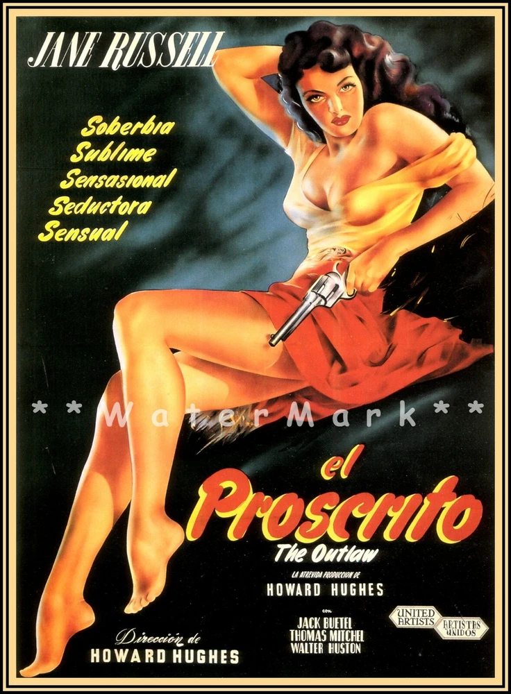 El Proscrito 1943 with Jane Russell The Outlaw Spanish Version Western legends Pat Garrett, Doc Holliday and Billy the Kid are played against each other over the law and the attentions of vivacious country vixen Rio McDonald. "The Outlaw" was the most controversial film made during the 1940s. The film wasn't even finished being shot when trouble started. The PCA (Production Code Authority) wouldn't give approval to the script until changes were made. Howard Hawks, the film's original director, left the project and Howard Hughes had to take over the shooting. When Joseph Breen at the PCA finally saw a rough cut of the film, he labeled it salacious for the number of overt shots of Jane Russell's breasts and cleavage Vintage Poster Print Retro Style Restored Art ***We offer Free US Postage or Reduced Postage for Canada & Worldwide. **No charges for additional prints worldwide. ***These are not framed or stretched or mounted NOTE:**Delivery dates shown are only "Suggested" Order Early To Avoid Post Delay Dramas **Read Please: The print looks best with a nice mat (passe - partout or passepartout ) and frame. These prints are the exact proportion as the original and will not be stretched to fit the paper or canvas...this would cause a distorted print The image will be the exact aspect ratio as per the original poster, so there might be more white on the top and bottom, or side to side. Options available..use the drop-down menu * Watermark will not be on your image. *Cloth Canvas an artist canvas used also in museums and art galleries *Photo Gloss Paper is a high-quality Professional Photo paper *Matte Photo Paper is a g oo d solution if you do not want a Gloss, then this paper is good for that option. But be aware that colors will not be a bright as with the Luster for example, o ther papers are coated that helps colors. The Matte will mute the colors a bit. *Luster Photo Paper this photo paper is neither glossy or mat. Glossy paper has a smooth texture, luster paper is slightly textured. This option is a g reat choice for something in between Metallic, Photo Gloss and Matte *Metallic Pearlescent Photo Paper is a very high-quality paper with a Pearlescent sheen, a glossy finish, and unique metallic appearance, these prints have extra visual interest and depth. This paper uses a combination of film laminate layers that produce striking, dimensional, lasting images on an ultra-bright background. The effect is sometimes described as "chrome on paper." This is NOT a metal plaque, it is a photo paper This poster print will be shipped in a sturdy container. We will ship usually within 24 business hours of payment, except for weekends or US Holidays If there is a question, please do contact me All is done to send you the best quality poster image. Don't forget to check out the Sales. There is a great Buy 3 Get 1 Free Offer!! Shipped with no extra postage..Worldwide! There are a variety of reasons why the images on your monitors don't match each other. The simplest is that each monitor is different; even monitors with the same model won't have colors that match up perfectly We are located, print and ship only from the USA The art is not AI generated, these are restored prints from originals There are a variety of reasons why the images on your monitors don't match each other. The simplest is that each monitor is different; even monitors with exactly the same model won't have colors that match up perfectly