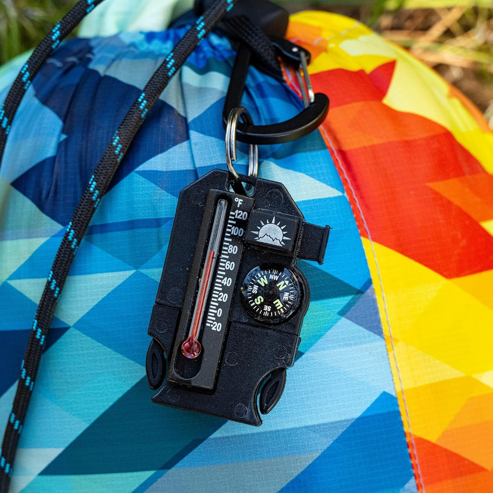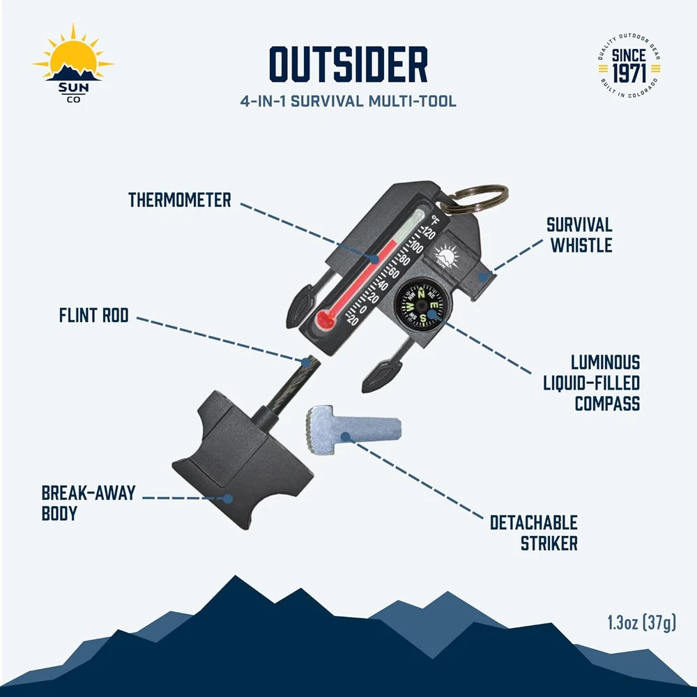 LUMINOUS COMPASS - Easy-to-read luminous button compass keeps you on course, even in low-light conditions. Perfect for hiking, camping, hunting, or any other situation where reliable tactical gear is essential. SURVIVAL WHISTLE - One of the must-have accessories for survivalists. This mini whistle creates big sound. CUSHION MOUNTED THERMOMETER - Reads temperature down to a chilly -20 degrees Fahrenheit. An essential piece of equipment for the outdoors. FIRE STARTER - Outsider pulls apart to reveal waterproof flint rod and removable steel striker tools. A handy piece of equipment for any emergency. KEYRING INCLUDED - Use the key ring to easily clip these four gadgets to your jacket, backpack, carabiner, or keychain for quick access. A full survival kit in a portable, ultralight key chain. Product Description About Sun Company Since 1971, Sun Company has been family-owned and operated with the goal of making the outdoors safer, and more accessible for all. For over 50 years, we have been designing and building "simply intelligent" outdoor tools and instruments from our headquarters in Colorado. Outsider - 4-in-1 Survival Multi-Tool Designed and Final-Assembled in the USA Don’t go anywhere without this pocket-sized wonder. Includes four important outdoor tools in one: luminous, easy-to-read compass, survival whistle, cushion-mounted thermometer, and flint rod & striker for starting fires. Metal parts detach from Outsider for the most precise compass readings. Use on a keychain for easy access. Shows temperature in Fahrenheit. Luminous, liquid-filled compass Cushion-mounted thermometer Survival whistle Fire starting flint rod and scraper
