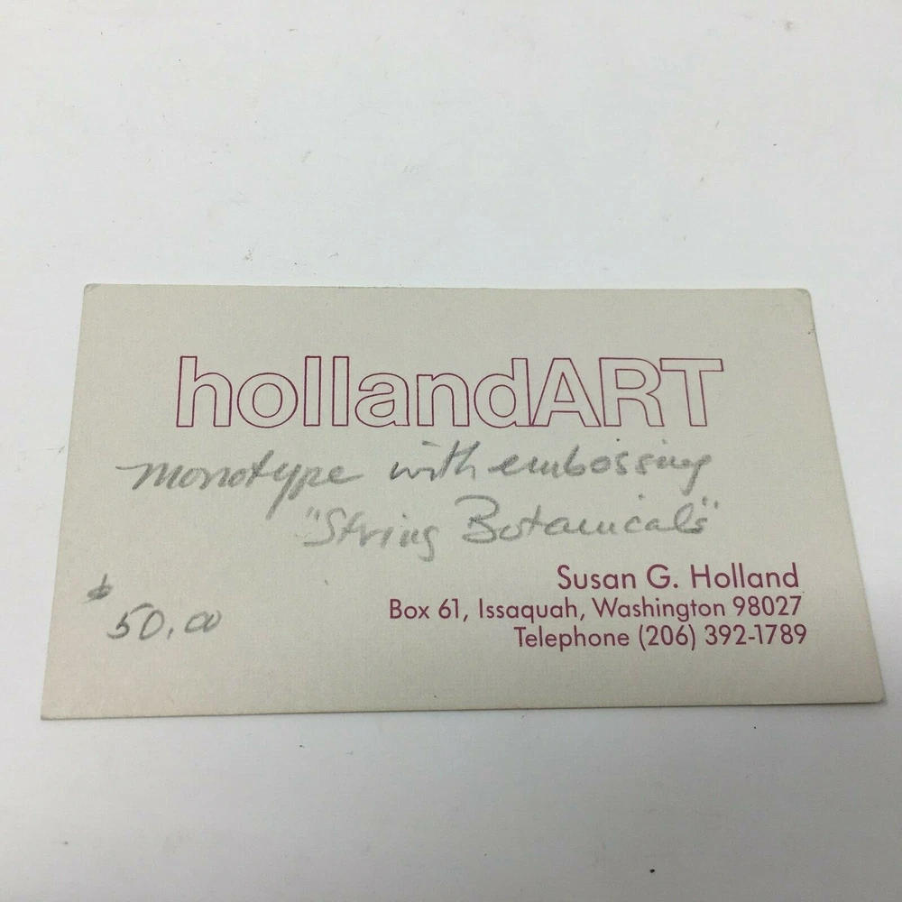 Vintage Small Original Artwork==NW Artist Susan Holland created this single piece work in 1994. It has remained in the original packaging until removed for these photographs. Then gently wrapped and stored in climate controlled conditions. This 8x10 matted piece approx 5x7 -unmatted. (matting included in purchase. A Wonderful Flower Print Monotype With Embossing "String Botanicals" Signed and personalized by the artist -Sent quickly and carefully -west coast USA Seller.Back of matting has a small blemish. last pic.Sent quickly and carefully -west coast USA Seller. You certainly know more about this item than I do. The universe brought you here for a reason. Give it a go. Thanks, Sally fine print- ebay rules and regulations