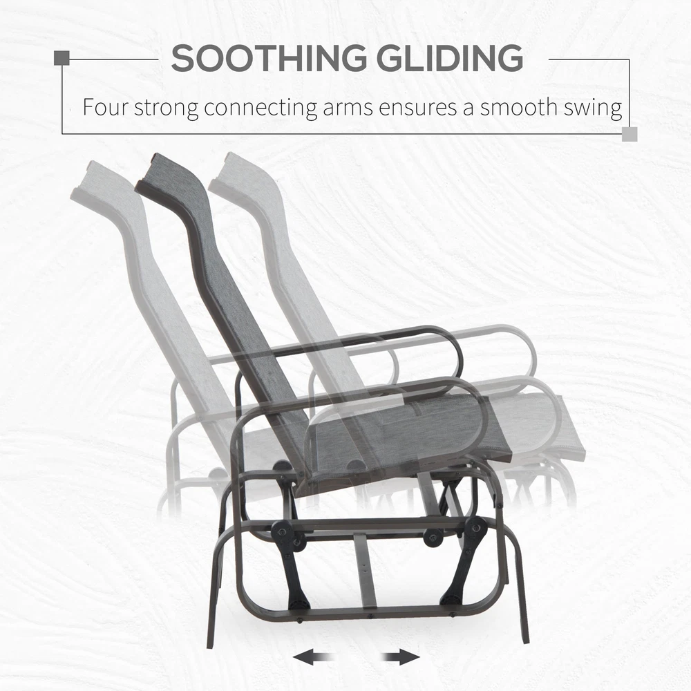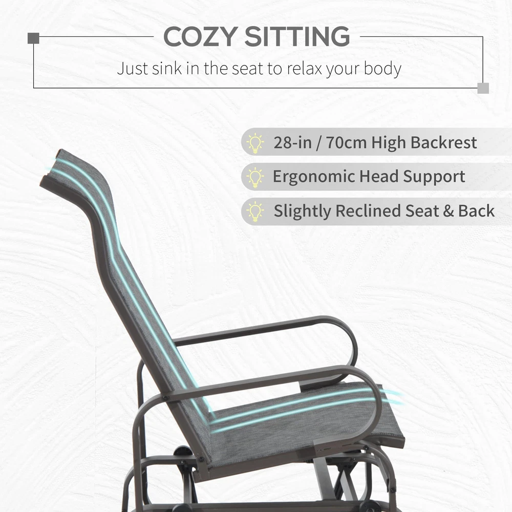 Specifications Place of Origin #originPlace# Main Color Brown Main Material Steel Dangerous Goods #dangerFlag# Dimensions & Weights Assembled Length (in.) 23.50 Assembled Width (in.) 28.75 Assembled Height (in.) 41.25 Weight (lbs) 22.00 Product Features Cozy Glider Chair: Our single-person outdoor glider features a 28-inch-high backrest and ergonomically protruding neck support, providing your upper body extra comfort. Smooth Rocker: The smooth rocking mechanism on our patio glider swings you quietly through the breeze. With metal treated to be heat and wear-resistant, our rocker offers outdoor comfort season after season. Mesh Fabric: Our outdoor glider chair is built with breathable sling fabric that keeps you cool in the summer heat by letting in the wind. It's water resistant and quick to dry, too, meaning you won't have a long wait after rain. Lightweight: If you prefer to read a book in the shade or take a nap in the sun, our glider chairs can adapt. A versatile outdoor seating option, our glider chairs are easy to carry with a thoughtful, lightweight build. Heavy Duty: The strength of thick steel allows the frame of our porch glider to support up to 352 lbs. of weight without issue. Description