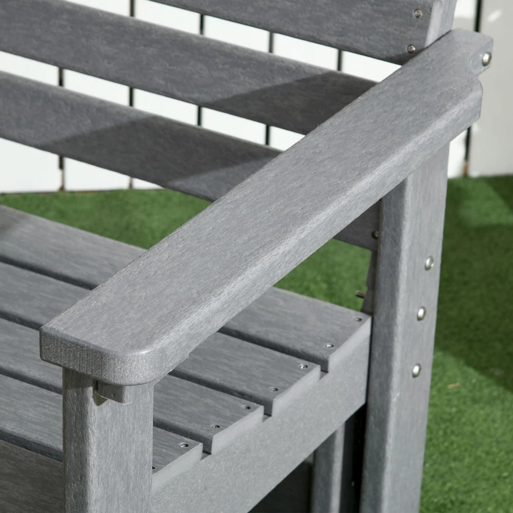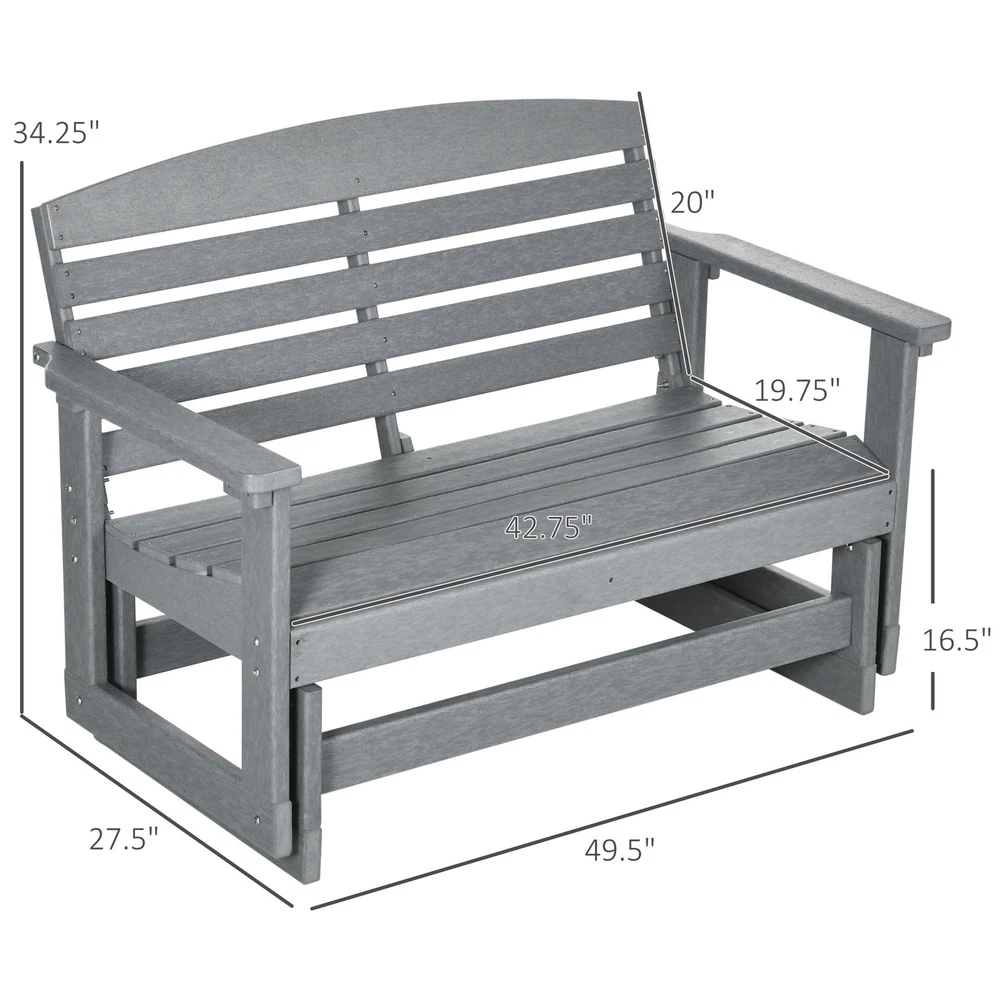 Specifications Place of Origin #originPlace# Main Color Gray Main Material HDPE Dangerous Goods #dangerFlag# Dimensions & Weights Assembled Length (in.) 49.50 Assembled Width (in.) 28.75 Assembled Height (in.) 34.25 Weight (lbs) 59.40 Product Features Outdoor Glider Bench: Our loveseat patio bench has a gliding mechanism built-in so you can gently rock back and forth from 0-45°. Sway through the breeze comfortably, drinking your morning coffee, catching up with a friend, or read while you enjoy the fresh air. A Comfortable Patio Bench: Our outdoor glider bench features a high rise backrest, two form fitting armrests, and fully slatted surface to keep you comfortable. A slatted design allows wind to pass through, providing a seat that stays cool in the summer sun, and drains away the rain, so it's ready when you need it. Traditional Look: The slatted surface also helps make our outdoor glider bench an excellent centerpiece. Providing rustic farmhouse flair to the porch, patio, or almost anywhere, it has form and function with a style that's easy on the eyes. Sometimes all it takes is the small things to bring us back to fond memories. With a classic look, glide back to the comforts of simpler times. Outdoor Ready: Our outdoor glider bench was made with materials selected with outdoor in mind. Made of weatherproof High-Density Polyethylene (HDPE), it provides a bench that won't crack, splinter, or breakdown from outdoor elements. Approximately 30,000 milk jugs per hour are recycled into HDPE all-weather lumber. After your furniture is built, all the material left over from the manufacturing process is sent back to the HDPE recycling plant to be made into lumber again. Loveseat Patio Glider Bench Info: Overall Dimensions: 49.5' W x 28.75' D x 34.25' H. Weight Capacity: 528 lbs. Assembly required. Description