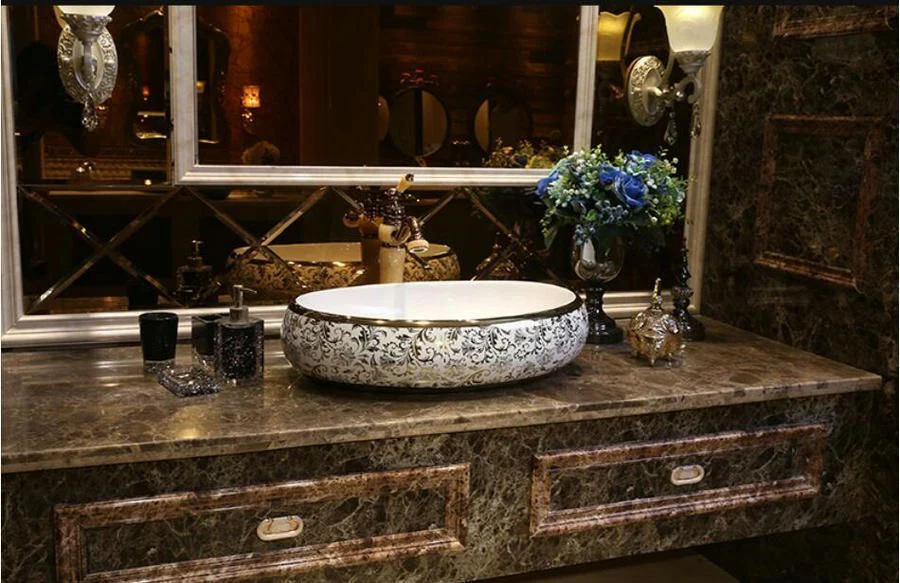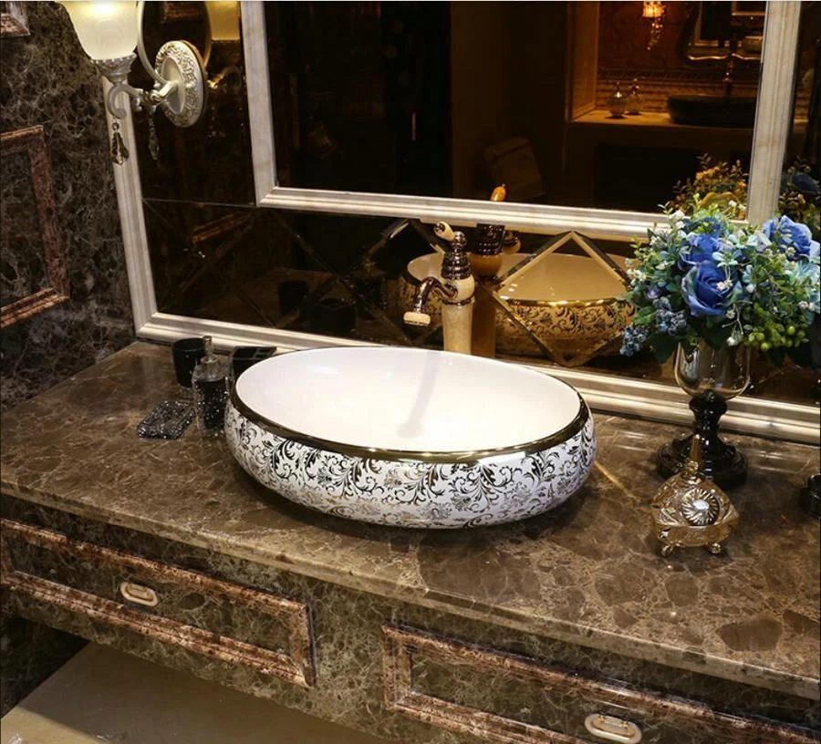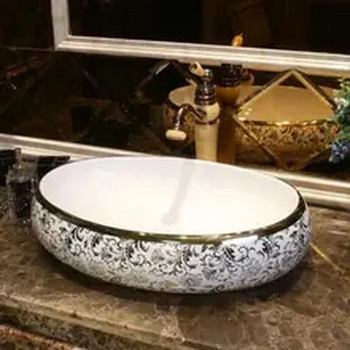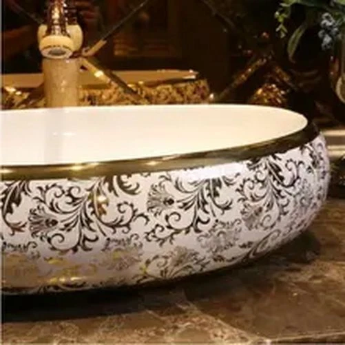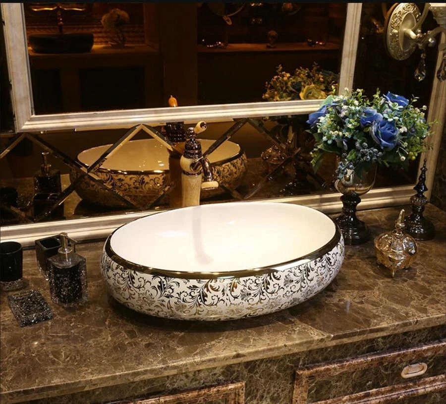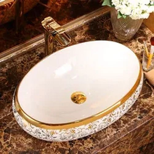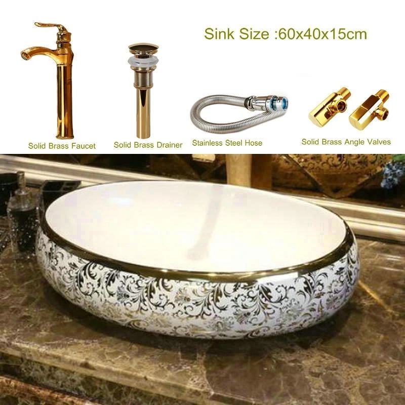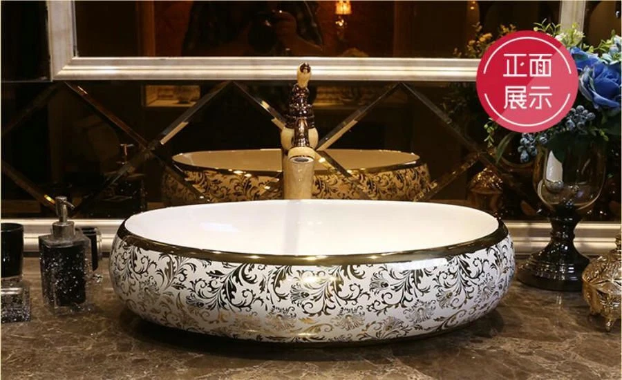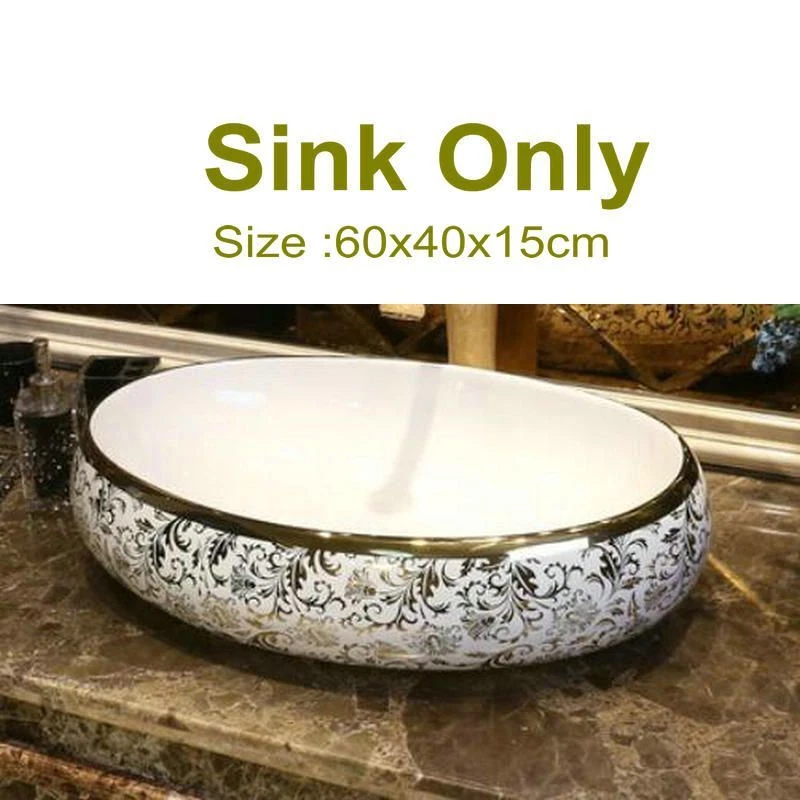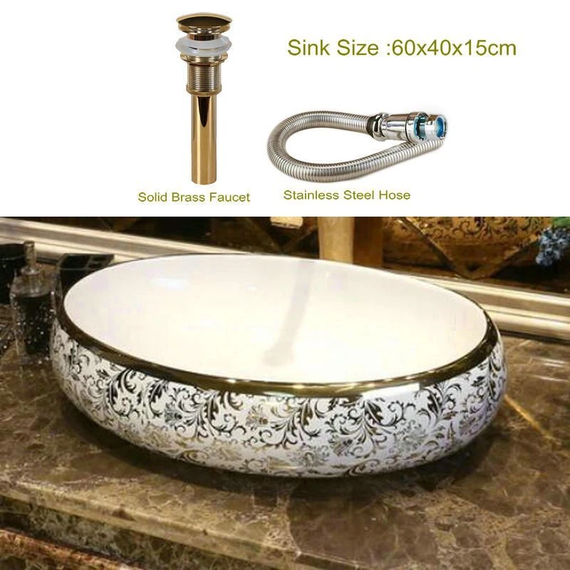 Oval Countertop Wash Basin Mosaic Design Ceramic Bathroom Vessel Sink 60x40x14cm Processing: Mosaic Gold Special Application: Bathroom Sink Type: Countertop Sinks Capacity: 12L Faucet Mount; No Hole, Single Hole Basin Shape: Oval Material: Ceramic Brand Name: Unbranded Origin: Mainland China Size: 60x40x14cm Package Include: 1 x Countertop Sinks