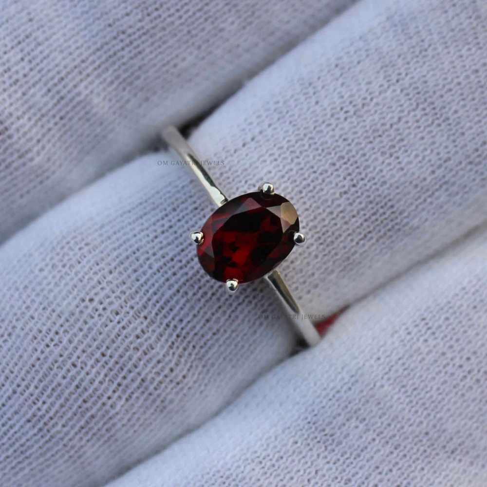 This is a handmade 925 sterling silver ring with a prong setting. The main stone is a natural eye-clean oval cut red garnet, measuring 9 mm in length and 7 mm in width, with a depth of 2 mm. The band width is 2 mm. The ring is antique, vintage, and stackable, with a bohemian and nature theme. It is perfect for various occasions such as engagement, wedding, anniversary, birthday, Valentine's Day, and Christmas. The ring is customizable, and the seller offers a warranty. Oval Cut Red Garnet Ring 925 Sterling Silver Handmade Minimalist Ring for Her Item: Ring Gemstone: Garnet Stone Shape: Red Stone Size: 7x9mm Stone Category: Faceted Metal: 925 Sterling Silver