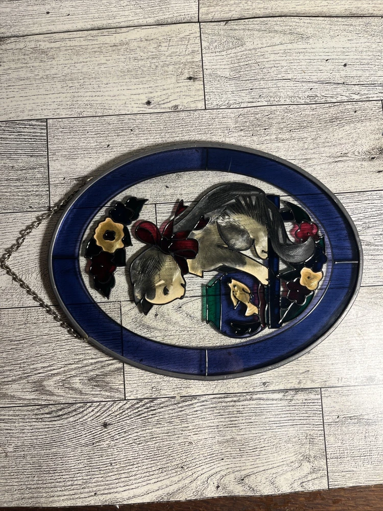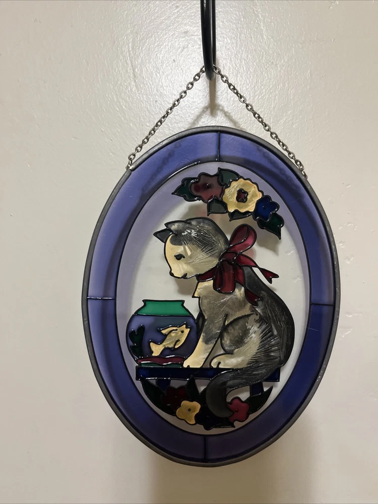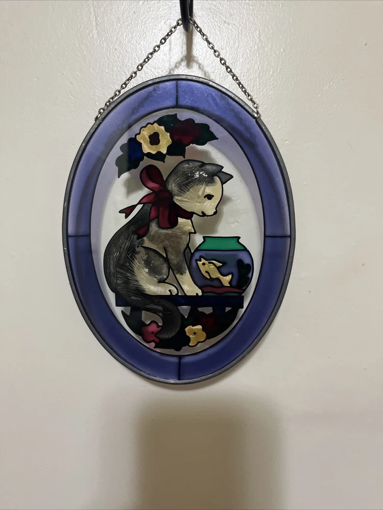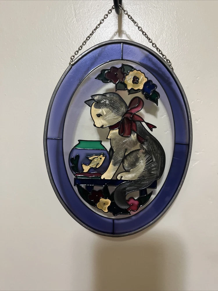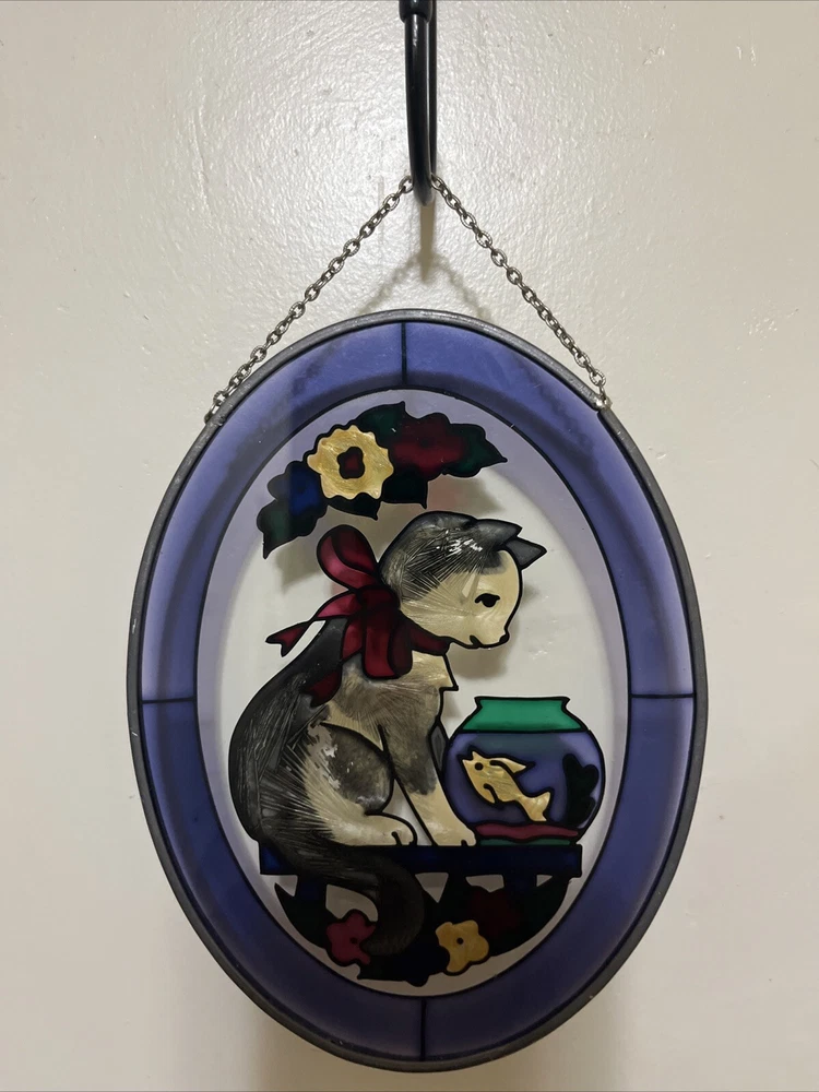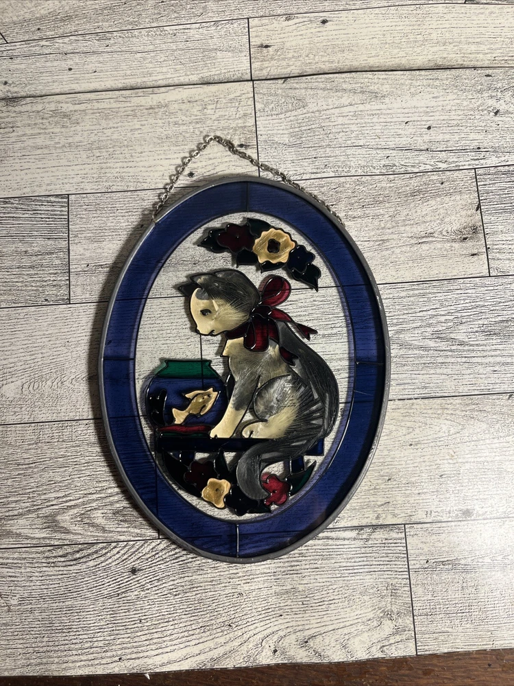 Very Good Condition! Beautiful & Vibrant Colors Add a touch of charm to any room with this beautiful oval-shaped stained glass window/wall decor. Featuring a cute cat and fish design, this piece is perfect for adults who love to add a touch of whimsy to their home decor. The multicolor glass and metal materials give it a unique and eye-catching finish that is sure to brighten up any space. Measuring approximately 8.5” in height, this window/wall decor is versatile enough to be hung in any room. The intricate cat and fish design is sure to delight anyone who sees it, making it a great addition to any home decor collection.