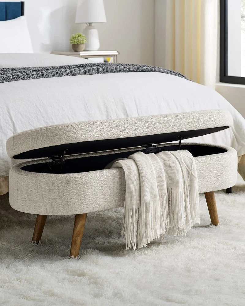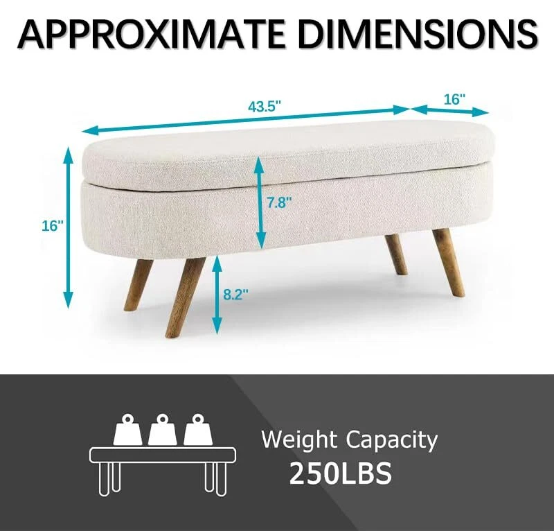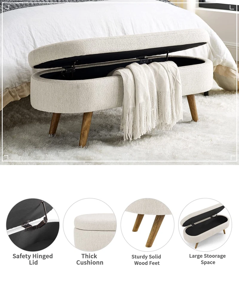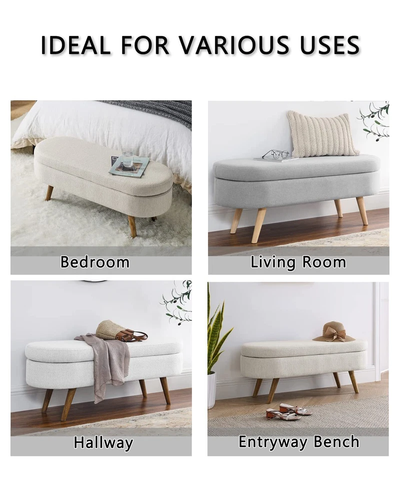 【Large Storage Capacity】 - Measuring 43.5''Lx16''Wx16''H, this bench has ample storage space to accommodate your clothes, shoes, bags, or other stuff, helping keep your room organized and clean. 【Humanized Design】 - This ottoman is handmade by skilled furniture craftsmen, with four feet overhanging to ensure easy cleaning and cleaning, and the storage function increases practicality. We offer you a variety of different color designs that you can match to your liking. 【Aesthetic Decor】 Upholstered Bench brings an elegant, feeling to your living room, bedroom or entryway.Whether you place it at the end of your bed, in an entryway, or in the living room, you’ll find this bench is a perfect fit and the ultimate finishing touch for just about any space. 【Sturdy build】Quality materials, including sturdy rubber wood legs , a seat covered in soft, fluffy fabric, and premium foam, ensure that this bench will not only add a touch of elegance to your home's design but also provide a comfortable place to sit. 【 Easy Assembly 】To enjoy our bed stool, just connect four footstools and come with instructions. Follow these instructions to assemble it, it's simple and convenient.