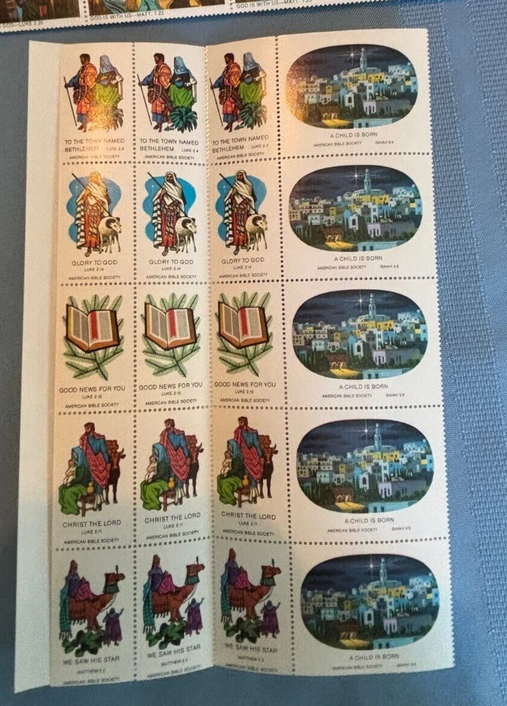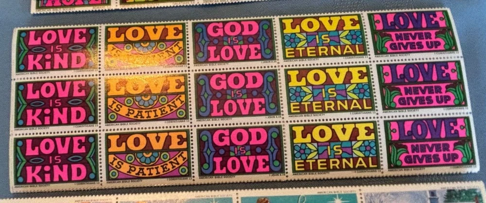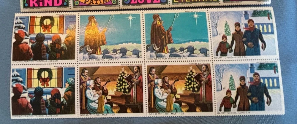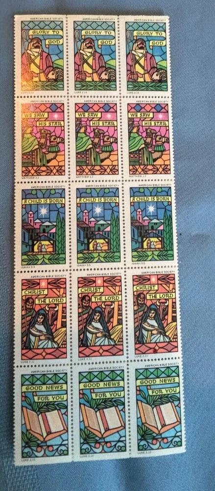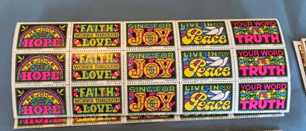 This is a lot of over 300 UNUSED vintage American Bible Society seals or stamps. These are from the late 60s and 1970 and 1971. The neon colored ones are not dated. A lot are full sheets. All in good condition. Please check the shipping fee to your area, using the shipping calculator on this listing. Returns accepted within 30 days of purchase. Please contact me before returning. I strive for 5 star ratings & will do my best to make my customers happy!
