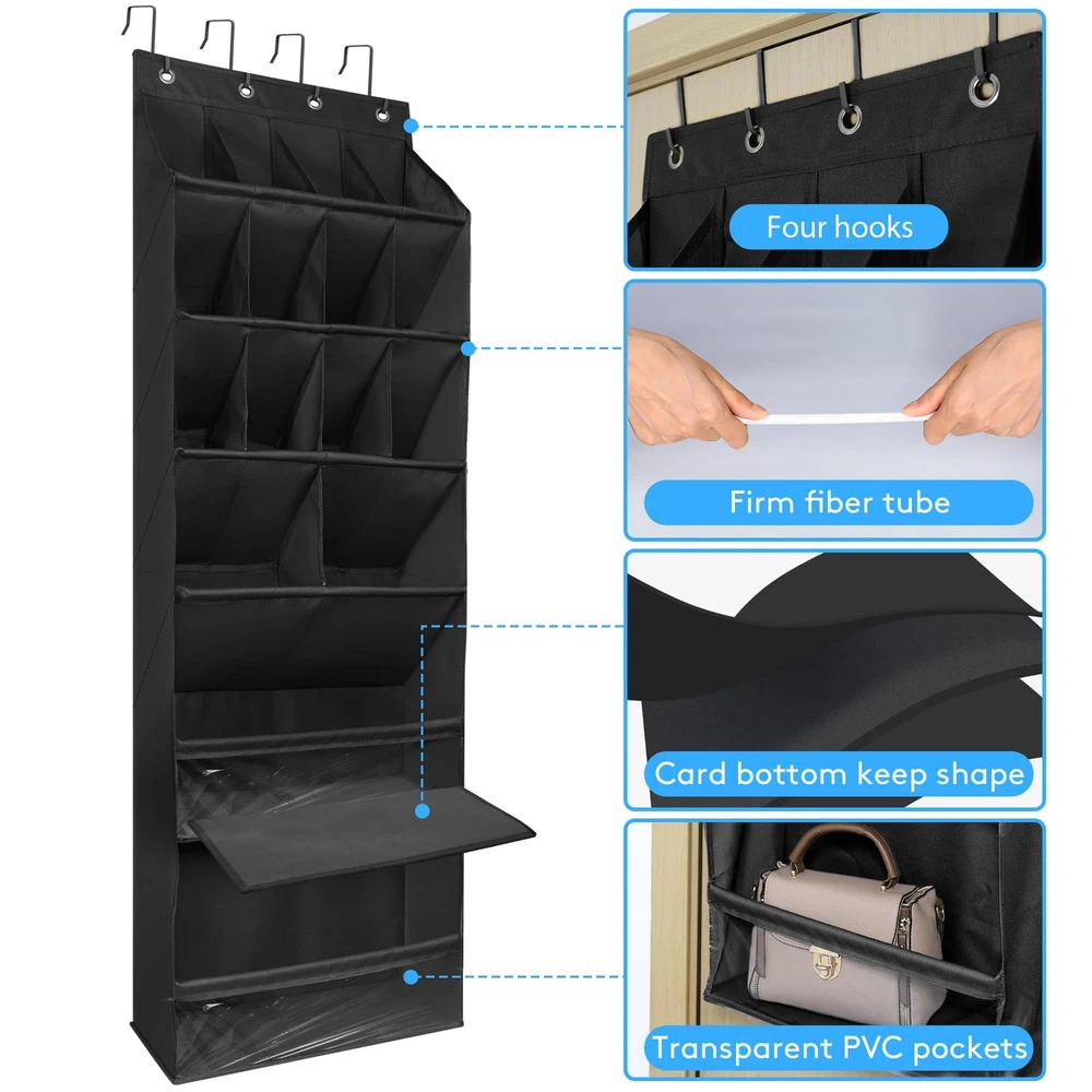 6-Layer Large Deep Pocket for More Space: Each over the door shoe organizer measures 16.5"W x 6.5"D x 57"H. This door shoe rack can easily hold size 10-20 shoes, such as kids shoes, flipflops, women high heals and men's boots, etc. Tilt pockets design keeps store and access items more easily. Especially fit for closet door, narrow door, skinny utility door, dorm and RV. Sturdy and Durable Material: This hanging shoe organizer made of premium and thickened oxford fabric which much more durable and tear resistance than traditional non-woven or mesh pockets. Each layer is supported by strong fiber tubes, aviod deformation and enhance the stability of the shoe holder which can hold up 45 lbs. 3 Size Pockets Design: Each over door shoe organizer total has 16 pockets, contains 12 medium pockets, 2 large pockets and 2 huge pockets. Three different size pockets can meet more home storage needs. Fit storing most tape of shoes, such as house slippers, sandals, platform wedges, running shoes, sneakers and baby shoes etc. Also good for small items like bag, water cup, umbrella, hat, glove, scarf, helmets, towels and diapers, etc. 4 Sturdy Hooks & Easy to Use: Each door shoe organizer has 4 heavy duty grommets and 4 removeable metal hooks which fit most standard door between 1.35" to 1.57" thick, easy to install on the door and don't need any tools. The 16.5“ wide hanging shoe rack suitable for most door of closets, bathroom, bedroom, baby or kid room, pantry room, laundry room, playroom, college, etc. Versatile Use: This shoe organizer over the door not only store shoes efficiently, but also be widely used for storing family daliy priority items such as baby arce, toys, kitchen supplies, beauty items, cleaning supplies, toiletry items, pet supplies, crafting supplies, digital products or tools etc. It can also be hung over the door or mounted on the wall, greatly save your space.