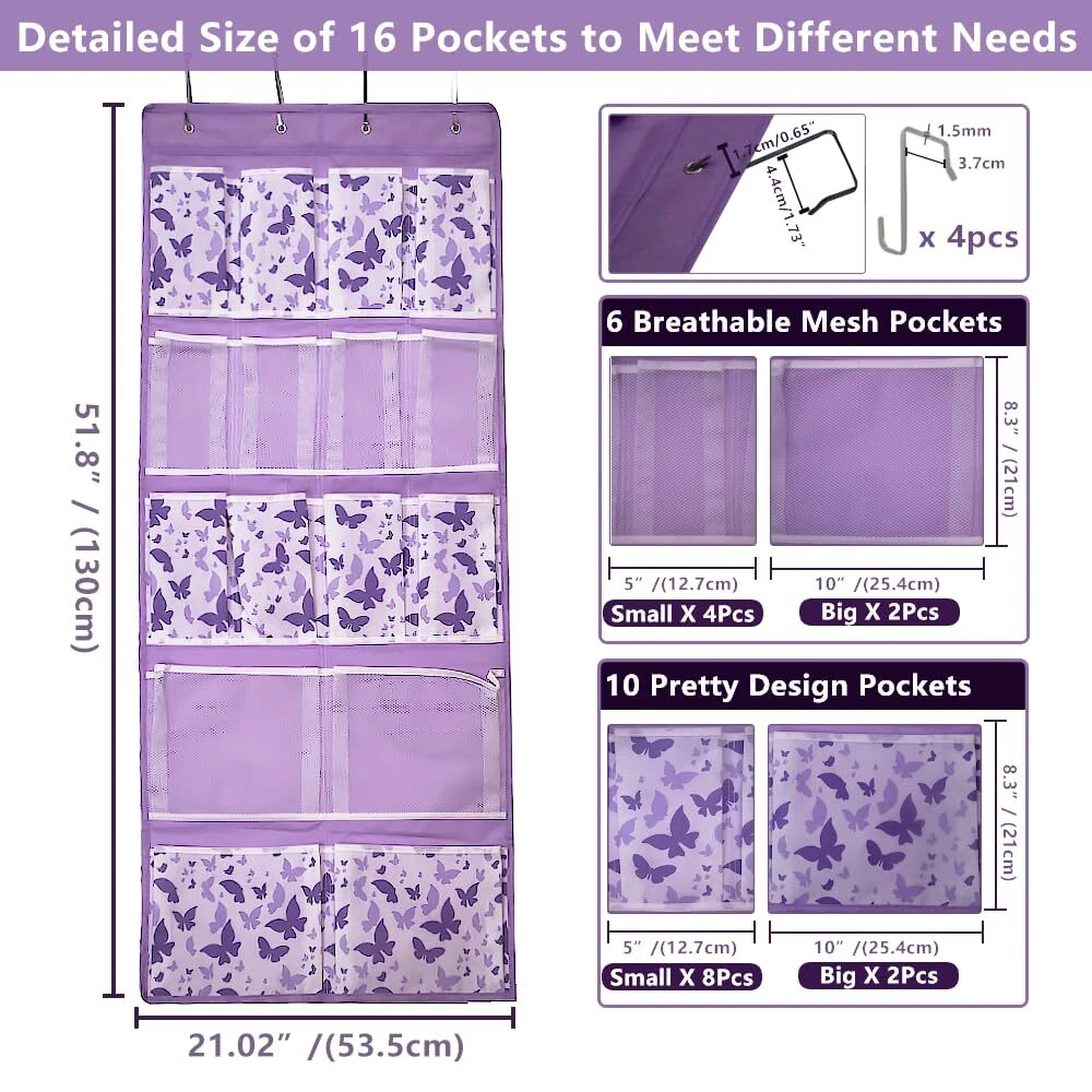 Multi-function 4 Kinds of Pockets Hanging Storage Organizer for Anywhere You Need the Storage Helper ♥Please read the size carefully first to confirm whether it meets your needs! Specifications: Product size: Overall Dimensions:20.87"L x 61.42"W / 53cm x 156cm 12 Small Pockets Size:4.72"L x 8.66"W / 12.7cm x 21cm 4 Big Pockets Size:10.24"L x 8.66"W / 25.4cm x 21cm Material: Main Fabric: Durable non woven fabric Pocket: 10 Nylon mesh +6 Fabric bag with pattern Number of pockets : 16 pockets Color:Purple 【Versatile Hanging Organizer with 4 types of Pockets 】 hanging storage holder has total 16 storage pockets,which designed to efficiently store and display.With its 4 kinds pockets,hanging storage organizer offers ample space to meet your different storage needs to hold shoes,socks,hat,underwear,etc... 【10/16 of Pockets with Stylish Purple Butterfly Design】: Over the door organizer has 10 fabric pockets,8 small and 2 large, effectively protects privacy well.Adds a view of elegance to any room with its chic design. It not only helps you stay organized but also serves as a stylish decoration for your room or closet. 【6/16 are Convenient Mesh Pockets】 The hanging storage organiser features 2 size net pockets, 4 small and 2 large, providing a visible and organized storage solution. No more mess or misplaced items! 【Practical and Space-Saving】Equipped with durable metal hooks,hanging pocket can be easily hung on doors, in closets, or any convenient location.Maximize your storage space with hanging storage organiser.Compact design allows you to efficiently utilize vertical space, keeping items within reach while saving valuable space. 【Considerate Size Design- FIT MOST DOOR】12 Small Pockets: 4.72"L x 8.66"W; 4 Big Pockets: 10.24"L x 8.66"W. Outline Dimensions: 21"L x 51.8"W / 53cm x 130cm. Suitable for most doors and perfect for multiple purposes in different scenarios,useful for Hang it in entryway,pantry, closet,bedroom, storeroom,bathroom,dorm,nursery room travel RV, etc... ♥Please check carefully whether the size conforms to your storage needs!!