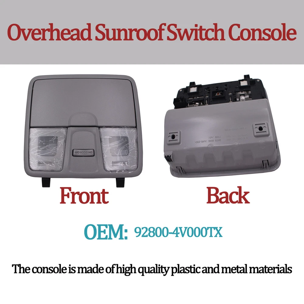 Specification Name: Overhead Console Material: ABS+Metal Colours: Grey Installation: Original replacement Suitable for: for Hyundai Elantra 13-17, OEM: 92800-4V000TX Features:Experience the convenience of an overhead console for your vehicle with the overhead console. This overhead console comes equipped with a sunroof switch, as well as a reading lamp, offering the perfect blend of practicality and convenience. Upgrade your vehicle with this overhead console today for a safer and smarter driving experience. Package Include: 1x Overhead Console Notes. 1.Please make sure your car model is compatible with this product to ensure a perfect match. 2.If you are not sure about the item, please contact us before purchase to avoid unnecessary returns, thanks!