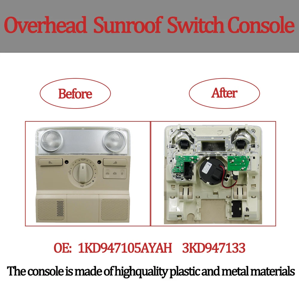 **Specification** Name: Overhead Console Material: ABS+Metal Colours: Beige、Black、Grey Installation: Original replacement Suitable for: for VW GOLF / GTI 2006-2013 MK5 MK6 for VW RABBIT 2006-2009 for VW JETTA 2006-2015 for VW PASSAT 2006-2015 for VW CC 2009-2015 for VW SCIROCCO 2009-2015 for VW GOLF PLUS 2005-2014 for VW TOURAN 2011-2015 for VW TIGUAN 2008-2015 for VW BEETLE 2012-2015 for SKODA OCTAVIA 2013-2015 for SKODA SUPERB 2008-2015 for SKODA YETI 2010-2015 for SEAT ALHAMBRA 2011-2015 for SEAT LEON 2013-2015 **Features** Experience the convenience of an overhead console for your vehicle with the overhead console. This overhead console comes equipped with a sunroof switch, as well as a reading lamp, offering the perfect blend of practicality and convenience. Upgrade your vehicle with this overhead console today for a safer and smarter driving experience. Package Include: 1x Overhead Console Notes. 1.Please make sure your car model is compatible with this product to ensure a perfect match. 2.If you are not sure about the item, please contact us before purchase to avoid unnecessary returns, thanks!