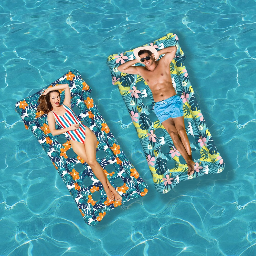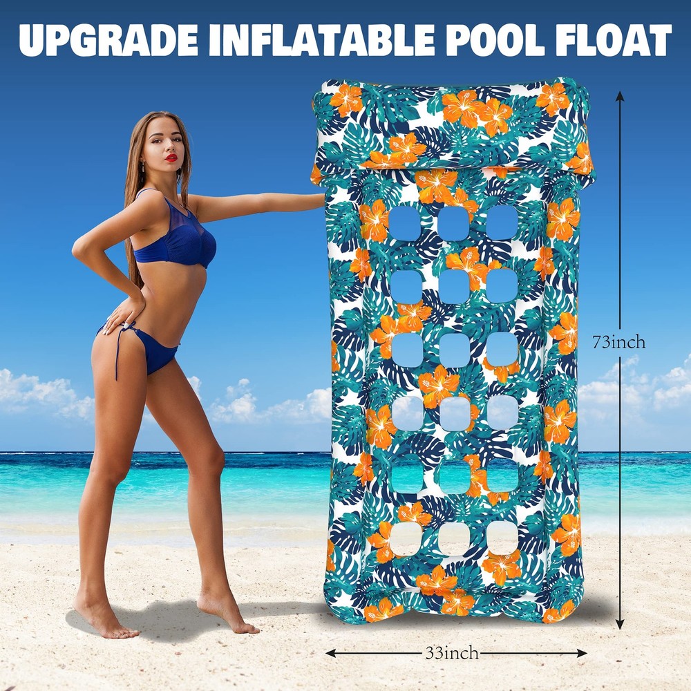 is dedicated to providing quality seasonal equipment to meet the needs of water party pool lake beach recreation vacation enthusiasts everywhere. Please feel free to message us with any questions! UNIQUE Design: The outside of the air chamber is covered with lots of holes to keep you cool, making it great for sun tanning. More comfortable and cooler than other ordinary plastic non-breathable loungers. Feature Weight capacity: up to 250 lbs. Large size for adult: 73" x 33" Holes design: more coolingComfortable and dries off fast for storage. Easy and quickly inflated with 2 fast valves(headrest and body). When inflating the pool rafts & inflatable ride-ons, please use the large valve inside to inflate the float to near full capacity at first, then cover the inner valve and use the small valve on the outside for additional inflation (note: if the float appears uneven in the process of inflation, such as C-shaped, please do not worry, this is due to uneven force, you can lightly pat the float and appropriate pressure) If you have any questions, please feel free to leave us a message through "Seller". Ultimate Comfort Tanning Pool Floats: This 2 pack luxury pool float lounger makes you feel like lying on a soft bed in the pool, sunbathing, the ultimate in comfort and enjoyment this summer. Perfect for the pool party, sea, beach, lake, river and summer vacation. Oversized and Heavy Duty Pool Floaties: The size of the pool floaties for adults is 73" x 33"(Fully inflated), Weight capacity of the rafts for pool adults is up to 250 lbs, it is comfortable, lightweight and wide enough to make you stable lie on without falling off. Muti-Hole Design: The pool hammock is covered with lots of hole, which allows water to flow through the internal holes to keep you cool, making adult pool float lounger great for sun tanning. Portable Desgin: The fabulous adult floats for pool work well in water, make your pool time more fun. Easy and quickly inflated with 2 fast valves(headrest and body). Dry off fast for easy storage. You can take it for your outdoor travel conveniently. Keep Cooling & Balance: The holes of beach floats design keeps you balanced to avoid falling over into the water and allow water touch your skin. Plus the inner contour chamber inflatabales are made of premium vinyl material, more sturdy and durable.