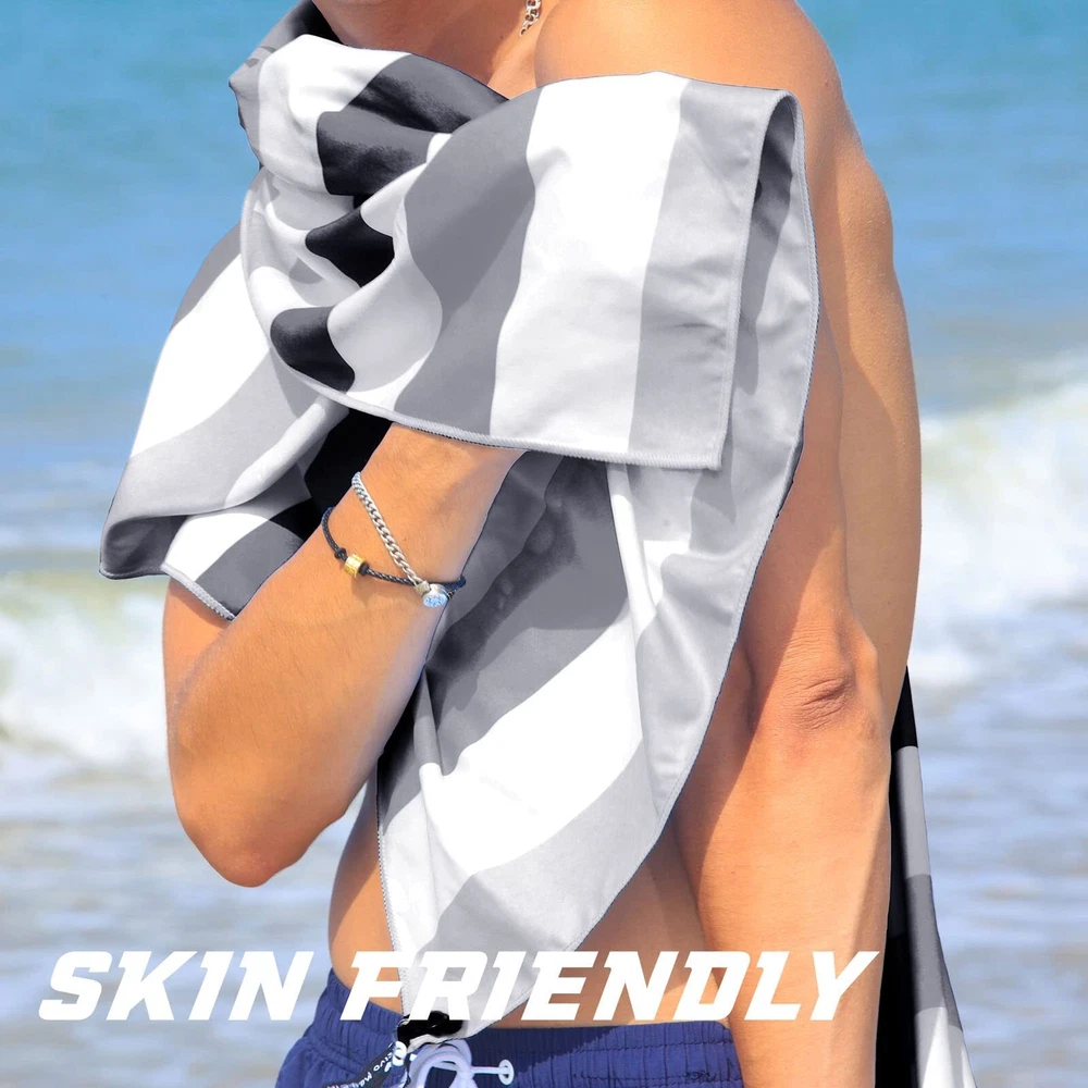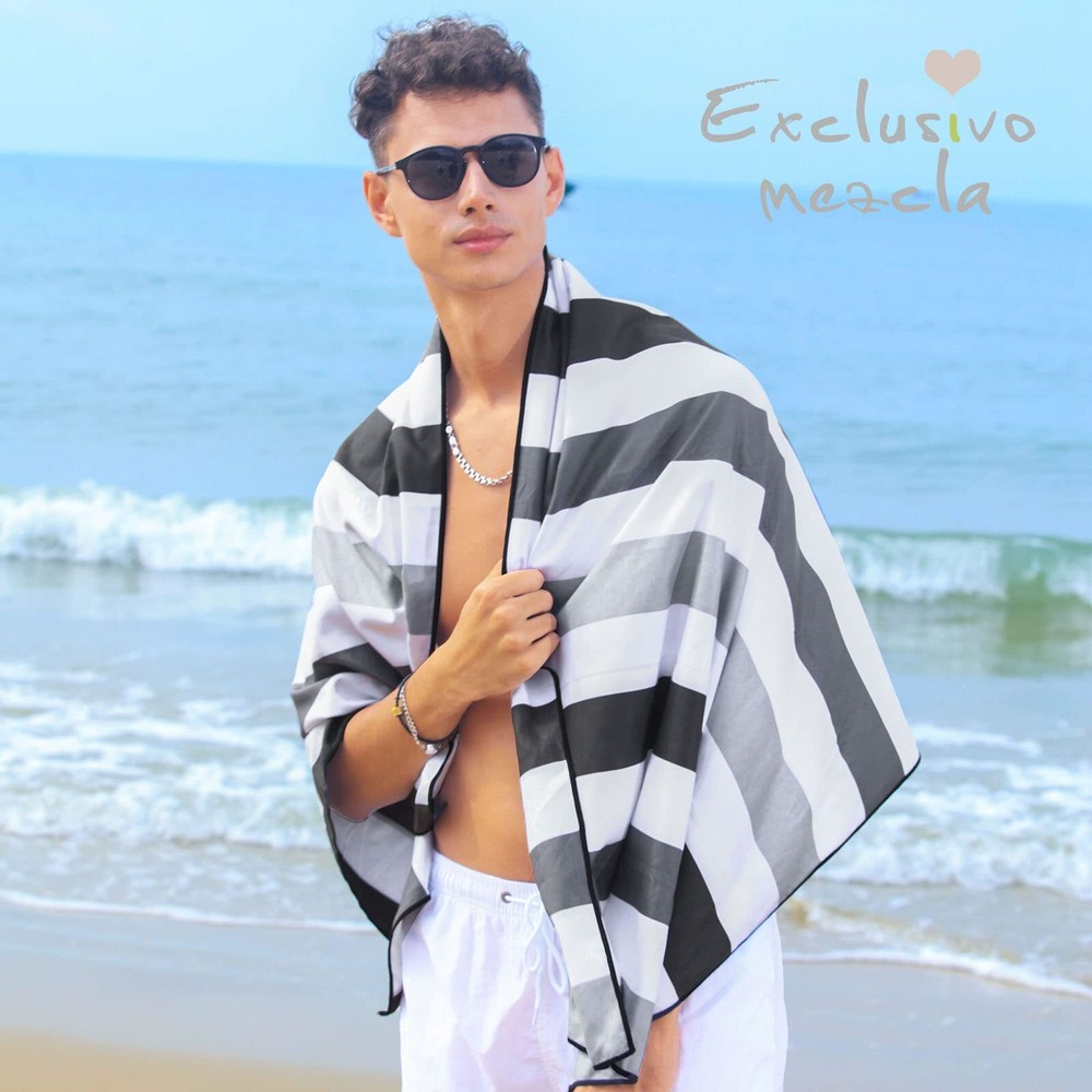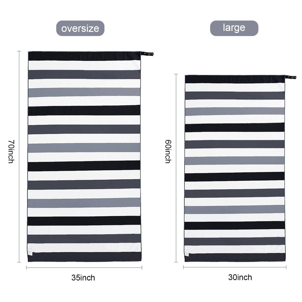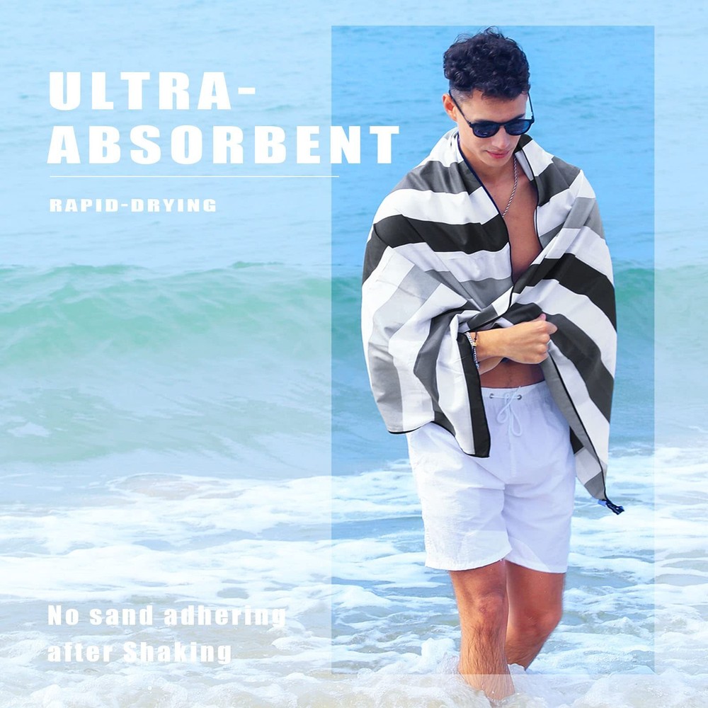 This beach towel is a game-changer! The oversized 35x70 inch size gives plenty of room to lounge, and the microfiber material dries incredibly fast while staying soft and sand-resistant. The lightweight fabric makes it easy to pack, and the included bag is super handy. Love the bold black stripe design—it looks stylish and holds up well after multiple washes. Perfect for beach days, poolside hangs, or even yoga. Highly recommend for anyone who wants a durable, practical, and stylish towel!