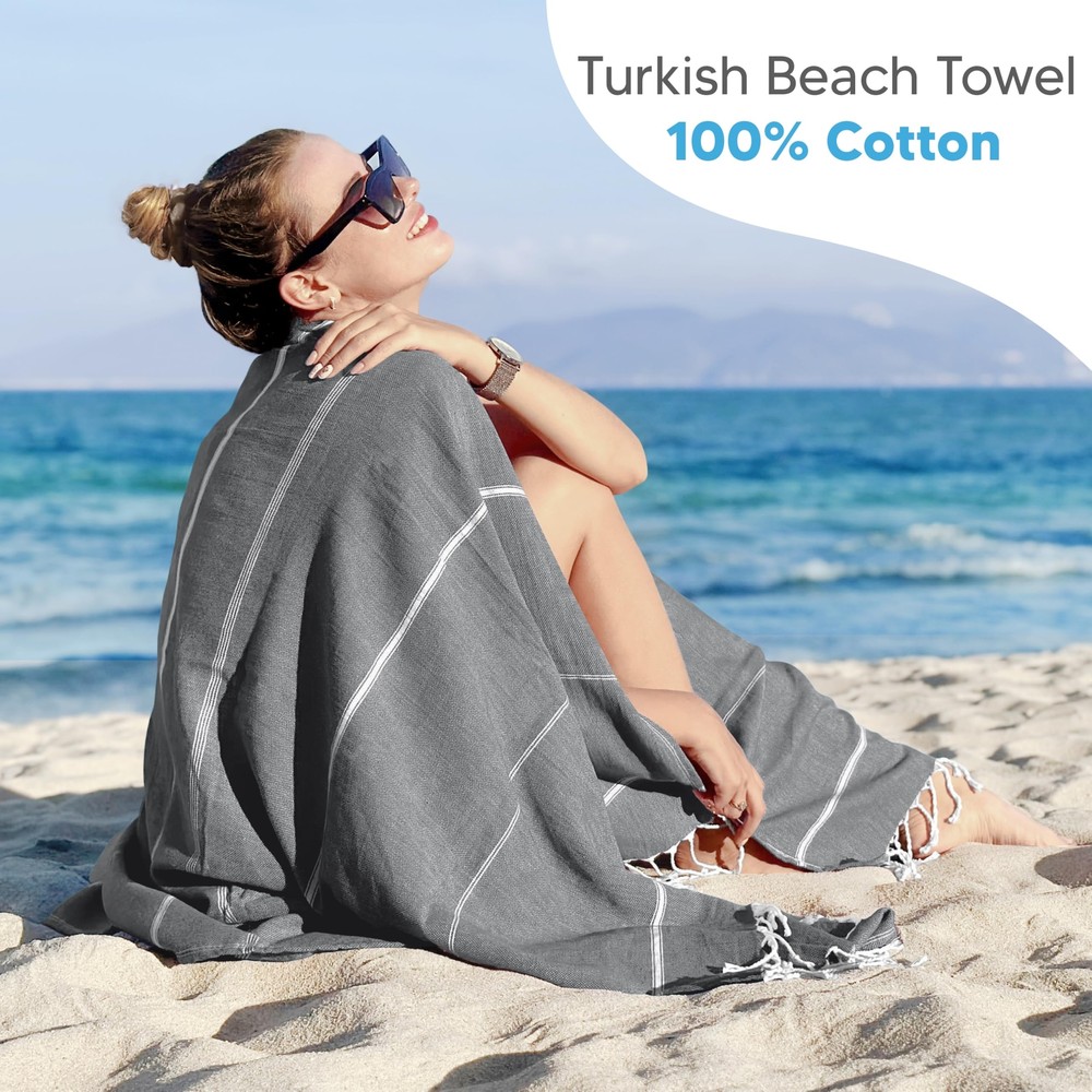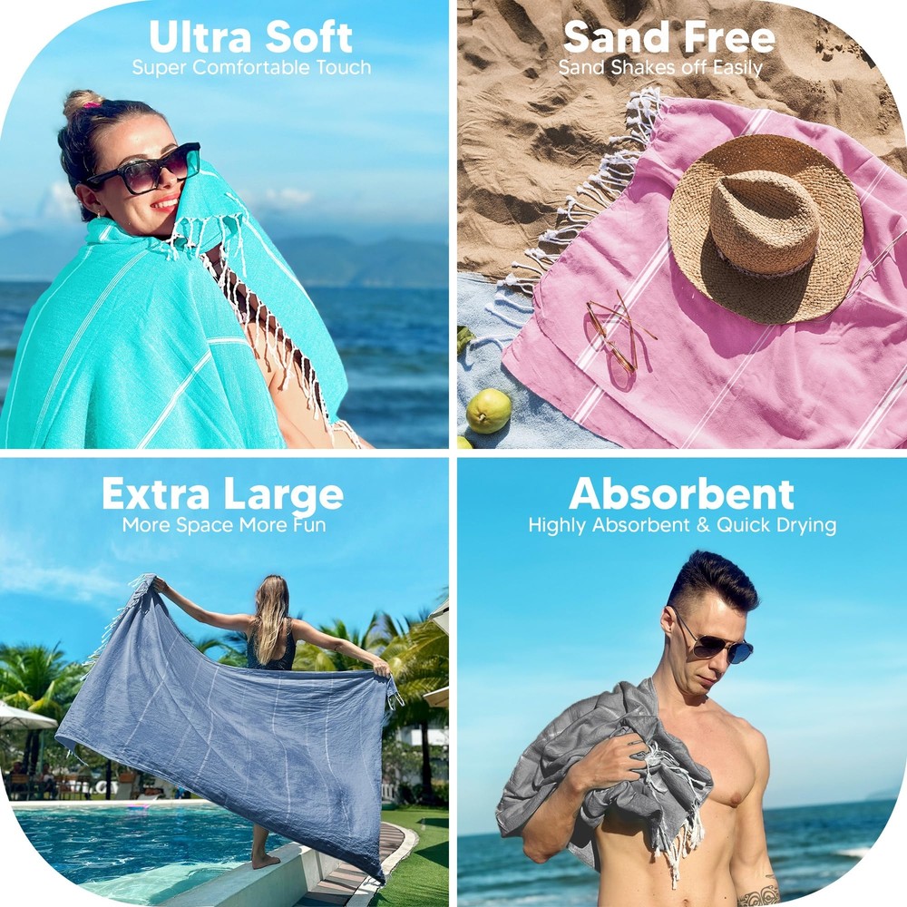 Pack of 4 Turkish Beach Towel, 40x72 Inches, Oversized 100% Cotton Sand Free Lightweight, Quick-Dry Beach Blanket, Extra Large Bath Towels for Travel and Pool (Grey, Aqua, Pink, Navy) PACK OF 4 - The set of 4 Turkish Beach Towels measuring 40 x 72 inches each. They are super convenient to use and provide maximum absorbency. LUXURIOUS QUALITY - Crafted with 100% premium cotton fabric, the large beach towel is designed to soak up more water and is quick to dry. Our lavish towels will leave you with a fresh feeling all day. STYLISH, SOFT & COMPACT - Streamline your summer with our quick dry beach towels, as they make an elegant addition to any setting. The towels are acutely soft in touch, super handy and portable. IMMENSELY PRACTICAL - The sand free beach towel is highly functional, rolls up neatly to fit in your bag or closet. Perfectly suitable for bathroom use, beach, spa, pool, gym, yoga, travel, camping and other versatile preferences. CARE GUIDE - It is recommended to machine wash the towel before use and line dry for best results. Pack of 4 Turkish Beach Towel, 40x72 Inches, Oversized 100% Cotton Sand Free Lightweight, Quick-Dry Beach Blanket, Extra Large Bath Towels for Travel and Pool (Grey, Aqua, Pink, Navy) Shipping We offer FREE shipping on all orders! We ship within Three business days of payment, usually sooner. We use a selection of shipping services such as UPS, FedEx, USPS etc. We only ship to the lower 48 states, no APO/FPO addresses or PO Boxes allowed. Local pickups and combined shipping options are not provided at this time. Return You can return a product for up to 30 days from the date you purchased it. Any product you return must be in the same condition you received it and in the original packaging. Please keep the receipt. Payment We accept payment by any of the following methods: PayPal Please pay as soon as possible after winning an auction, as that will allow us to post your item to you sooner! Feedback Customer satisfaction is very important to us. If you have any problem with your order, please contact us and we will do our best to make you satisfied. Contact Us If you have any queries, please contact us via ebay. We usually respond within 24 hours on weekdays. Please visit our eBay store to check out other items for sale! Thank you for shopping at our store.