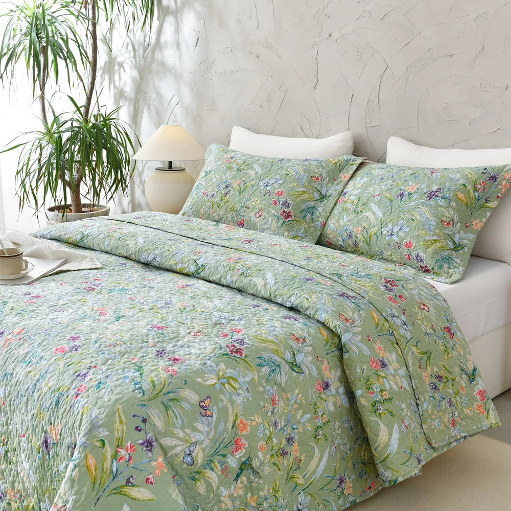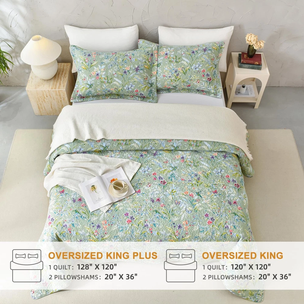 【3pcs cotton quilt Bedding Set 】summer floral quilted bedspread includes;1pc shabby vintage quilt/coverlet and matching 2pcs embroidered cotton quilted pillowshams that will transform your bed into a lavish and inviting sanctuary.Pair it with other bedding items to create a cohesive look in your room.With its stunning colorful color and intricate design. 【3pcs Cotton Oversized King Quilt Bedspread Set 】oversized quilts for king bed includes:1pc floral quilt bedspread/coverlet (128 x 120inches) and 2pcs matching flower printed cotton quilted pillowshams (20 x 36 inches) that will transform your bed into a lavish and inviting sanctuary.Pair it with other bedding items to create a cohesive look in your room. 【Exquisite Printed Pattern Design】This gorgeous and stylish floral pattern design, featured in our 100% cotton quilted bedspread set oversized and shabby elegant floral bedding, showcases a three-dimensional, fluffy, and elegant appearance.it adds an extra touch of refinement and comfort to your home decor. 【High Quality Super Soft Cotton Material】Made from 100% softest cotton outer fabric and super soft breathable cotton fill.our extra wide 100% cotton california king size quilts bedding bedspread coverlet ensures maximum breathability for a comfortable sleep.With precision stitching and enhanced durability,this cotton floral shabby vintage chic bedding set is resistant to wear and tear,making it great for adding a touch of luxury to your bedding. 【Upgrade your bed】 Use it as your primary cotton quilted bedding,layer it over your duvet or comforter,or snuggle up with it on your favorite chair or sofa.Our floral flower printed pattern 100% cotton quilted bedspread is sure to provide you with ultimate comfort and style. 【Easy Care & Excellent Service】Our high-quality cotton quilt extra large king bedding set is designed with your convenience in mind.It's easy to care for with machine washable features in cold water,gentle cycle,and tumble dry on low heat to remove wrinkles.