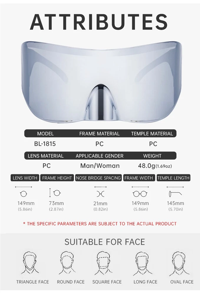 SPECIFICATIONS Department Name : ADULT Feature 1 : Shades for Women/Men Feature 2 : Y2k Punk Sunglasses Feature 3 : Retro 2000's Sunglasses Feature 4 : Sports Sunglasses Feature 5 : Steampunk Sunglasses Feature 6 : Wrap Around Sunglasses Feature 7 : Do Dropshipping Feature 8 : Wholesale Sunglasses Feature : Free Shipping Item Package : With screwdriver Brand Name : KIM7KIM Model Number : BL-1815 Frame Material : Plastic Lenses Material : Polycarbonate Place Of Origin : China (mainland) Lenses Optical Attribute : UV400 Lenses Optical Attribute : Gradient Hign-concerned Chemical : None Applicable Scenarios : casual Element type : Trendy and fashionable Product Type : Fashion Sunglasses Origin : Mainland China Gender : WOMEN Certification : CE Item Type : EYEWEAR Eyewear Type : Sunglasses Style type : PUNK Lens Width : 149mm Lens Height : 73mm Choice : yes semi_Choice : yes