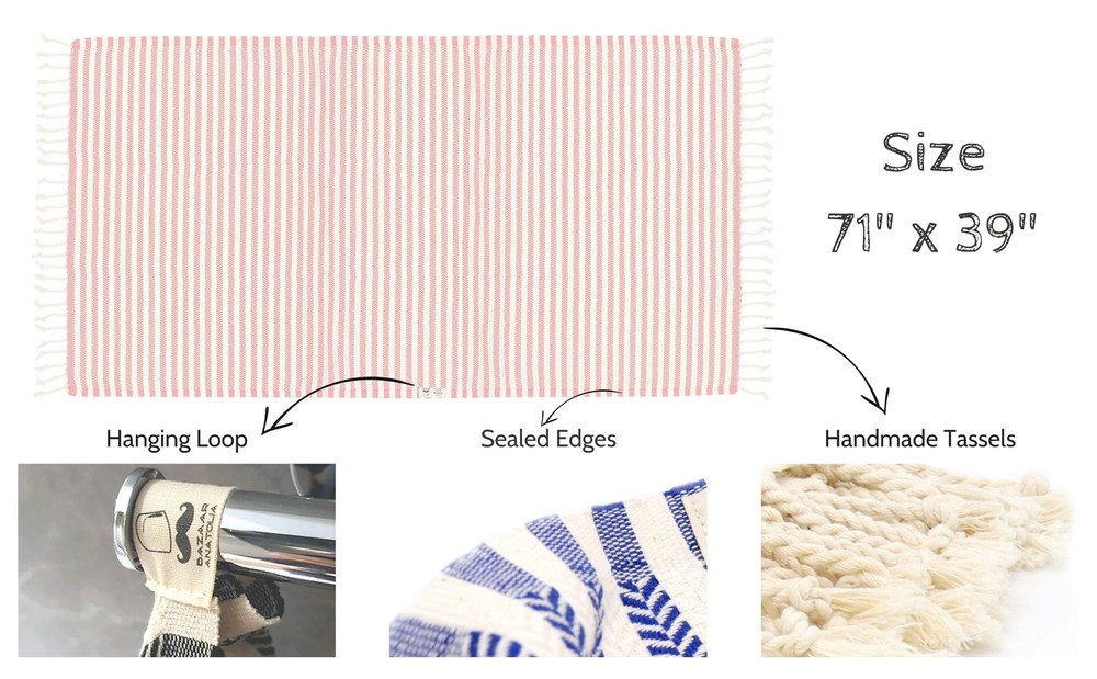Turkish Beach Towel 100% Cotton Bath Towels Oversized Quick Dry Pink Picnic Blanket Decor Sheets Bathroom Towels Sand Free Camping Blanket 71x39 inches - Arpa Pink Sustainable: Turkish beach towels are minimalist as it takes up little space and versatile. Reduce water and energy consumption with easy wash and quick dry light pink striped towel. Practical: Quick dry beach towels are oversized but super convenient to pack and carry. Say goodbye to heavy damp towels with sand on your bag. Sand free pink picnic blanket dries very quickly. Dries even when the sun is behind the cloud. Turkish towels are the best beach accessories for vacation must haves. High Quality: Each towel is carefully checked and packed by our teams. Turkish towels are soft and absorbent with 100% cotton yarns. Our towels becomes softer and absorbent after several washes. Also OEKO-TEX Certified yarns guarantees that our beach towels are free of harmful chemicals and perfectly safe for human use. Versatile: There are many ways to use Turkish Beach Towel. You can use the turkish towel as a scarf on the outside, shawl on the terminal, travel blanket on an airplane, oversized beach towel when you get off the plane and go to the beach. Quite useful as a travel beach towel. Or you can use as a bathroom towels, yoga mat towel, pool towel or a throw blanket in your house. Oversized Beach Towel: 71x39" (size without tassels) Turkish beach towels are oversized, extra large but easy to carry and takes up less space. KTUN 850030610683 Made in Turkiye Turkish Beach Towels, striped light pink 100% Cotton, Color: pink Size: 71x39" (excluding tassels) Weight: 15 oz (420 grams) per towel Description: Crafted in Turkey, these towels are woven by craftsmen using hand looms. Made from pure 100% cotton yarns, they are naturally dyed and reduce water and energy consumption with easy wash and quick dry. Versatile and decorative, they take up little space and include a 100% cotton hanging loop. The product tag is crafted from cardboard. Quick-dry beach towel absorbs water quickly and dries even when the sun is behind the cloud. Becomes soft and absorbent after several washes. Uses: Ideal for beach, bath, travel, yoga, picnic, and more. Can be used as a scarf, shawl, travel blanket, beach towel, white and pink throw blanket, decor, boho bath towels, bath sheets, gym towel, oversized beach towel, quick dry towel, yoga blanket, yoga mat towel, picnic blanket, woven blanket, camping blanket, sand-free beach towel. Shipping We offer FREE shipping on all orders! We ship within Three business days of payment, usually sooner. We use a selection of shipping services such as UPS, FedEx, USPS etc. We only ship to the lower 48 states, no APO/FPO addresses or PO Boxes allowed. Local pickups and combined shipping options are not provided at this time. Return You can return a product for up to 30 days from the date you purchased it. Any product you return must be in the same condition you received it and in the original packaging. Please keep the receipt. Payment We accept payment by any of the following methods: PayPal Please pay as soon as possible after winning an auction, as that will allow us to post your item to you sooner! Feedback Customer satisfaction is very important to us. If you have any problem with your order, please contact us and we will do our best to make you satisfied. Contact Us If you have any queries, please contact us via ebay. We usually respond within 24 hours on weekdays. Please visit our eBay store to check out other items for sale! Thank you for shopping at our store.