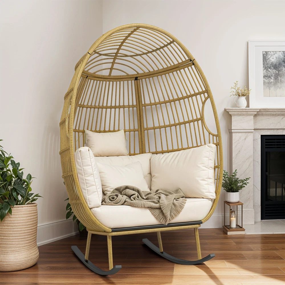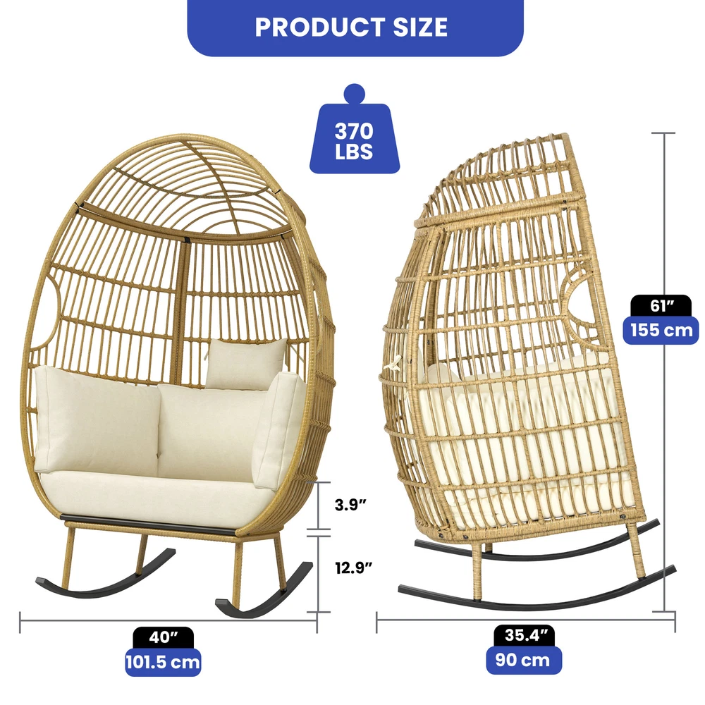 Oversized Rattan Rocking Egg Chair Indoor Wicker Basket Chair Lounger w/ Cushion Product Description NOTE: Professional Installation Would Be Highly Recommended. Description : 1. Color: Beige 2. Material: Rattan, Wicker, Metal 3. Maximum Weight Capacity: 370 lbs 4. Room Type: Family Room, Entertainment Room, Reading Nook, Sunroom, Garden, Patio, Backyard, Outdoor, Courtyard, Deck, and Poolside 5. Features: Thick Comfortable Soft Cushions, Breathable Fabric, Thick & Strong Wicker, Rust-Resistant Metal, Cushion Strap, Removable Cover, UV Protected, Weatherproof, Waterproof, Easy to Assemble, Easy to Clean, Protective Foot Pads. Features: 1. Comfortable Outdoor Seating: This outdoor chair features a user-friendly armrest and a cloud-soft cushion for unparalleled comfort, alongside a sturdy rocking base that enhances stability and adds a gentle motion, perfect for relaxing. Each detail is designed to provide both comfort and durability, ensuring that this chair can be a cozy retreat in any outdoor setting. 2. Superior Wicker Durability: Crafted with thick and strong wicker, this outdoor chair is designed to withstand all weather conditions without unraveling, ensuring long-lasting durability and reliability compared to other materials. Its robust construction offers both aesthetic appeal and practical functionality , making it a superior choice for any outdoor setting. 3. Versatile Seating Solutions: This versatile chair is designed for both indoor and outdoor use , seamlessly integrating with any space from a cozy bedroom to a sunlit patio or a tranquil courtyard. Its robust design ensures durability and comfort, making it an ideal choice for enhancing any area with a stylish seating option. 4. Spacious Comfort: This robust wicker chair supports up to 370 pounds and measures 61 inches in height, ensuring a spacious and durable seating solution for a variety of settings. Its dimensions include a comfortable width of 40 inches and a depth of 35.4 inches, making it an ideal choice for both compact and expansive areas. Dimensions: 1. Chair Dimension: 40" W x 35.4" D x 61" H Package Included: 1. 1 x Rocking Egg Chair 2. 1 x Cushion Set 3. 1 x Instruction Manual Note: 1. During assembly, do not tighten screws until all holes are aligned. 2. Confirm the appropriate furniture size for your needs prior to purchase. 3. There may be a slight color discrepancy between the product as seen on your monitor versus in real life. 4. Do not expose the product to extreme sunlight. To extend product lifetime, cover item when not in use. 5. Contact us immediately if any components are missing or damaged upon arrival. Our customer service team will resolve your issue right away. 6. Protect cushions from rain. The inner sponge is NOT waterproof. To extend product lifetime, cover when not in use. 7. The product may be dispatched separately into 2 packages, may not arrive simultaneously. Shipping 1. Normally the item will be dispatched within 1 business day if payment is cleared before 12 pm PST. 2. Please verify the correct shipping address in your PayPal account before making the payment. We only dispatch the item to the address that is sent to us at the time of checkout. 3. We don't ship to Hawaii, Alaska, Puerto Rico, APO/FPO/PO Boxes. 4. We don't provide local pick-up service. 5. Normally we will use USPS, UPS, FedEx & LTL to dispatch items. Payment 1. We accept PayPal and credit card. 2. We will ship to the confirmed Paypal shipping address that is provided with the payment only. Return 1. 30 days Money Back Guarantee. 2. Please contact our customer service to receive a RMA form first if want to return the item. 3. All returned items MUST in new condition with the original package. Contact If has any problem, please contact us by sending an ebay message. Our customer service will resolve the problem as soon as possible. On Dec 26, 2024 at 00:13:03 PST, seller added the following information:
