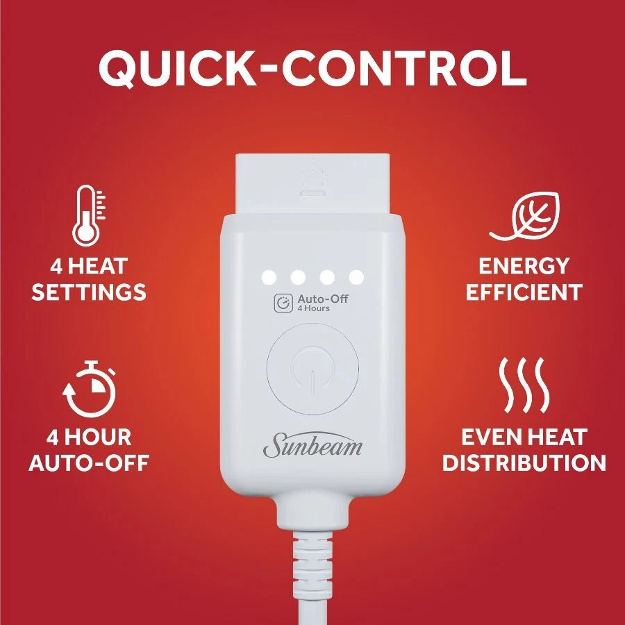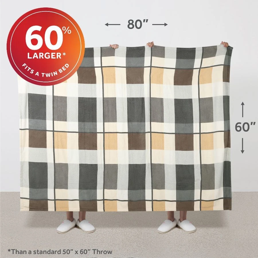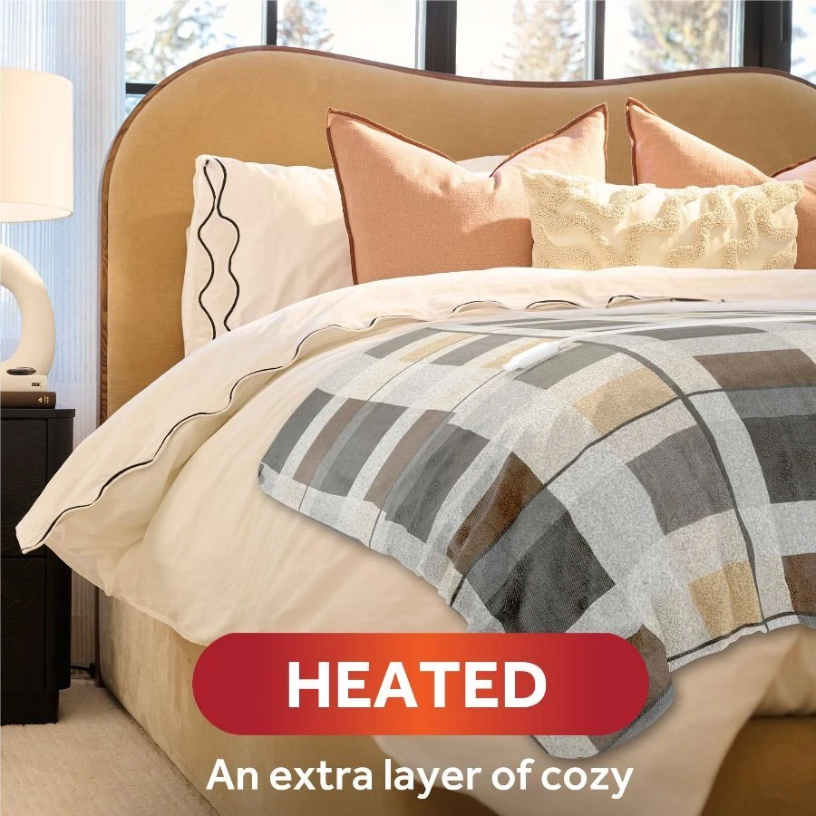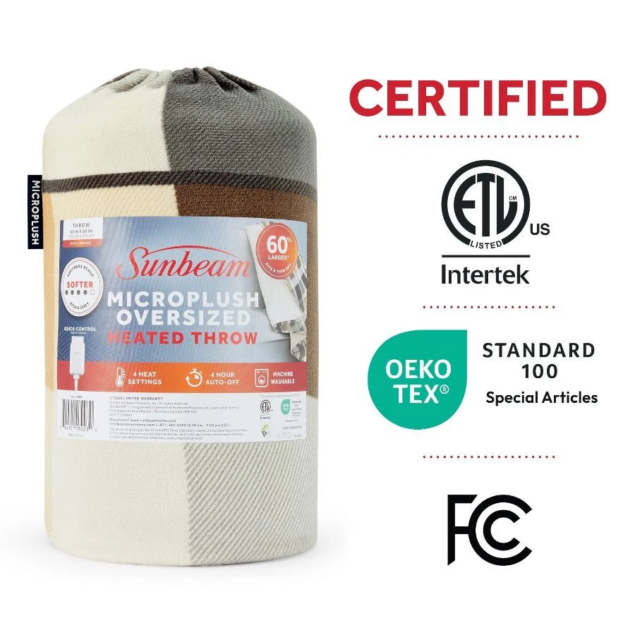 Sunbeam Oversized Neutral Plaid Microplush Heated Throw wraps you in ultimate comfort, perfect for those chilly cold nights. Indulge yourself with its rich and cozy fabric to keep you toasty and comfortable while you unwind. The stylish 60" x 80" electric blanket makes a great accessory while relaxing on the couch, bed or your favourite chair and the neutral plaid pattern complements any décor. This throw features an easy-to-use push-button controller with 4 adjustable heat settings, so you can find your perfect temperature. The 4-hour auto shut-off function ensures added peace of mind. Premium heated wires are equipped with advanced technology to ensure continuous even heat distribution. When ready to clean, simply detach the controller from the throw and place in the washing machine and dryer for easy care, stays silky soft wash after wash. Sunbeam is an American brand trusted for over 125 years in electric home appliances. All Sunbeam electric bedding products are ETL certified. On Dec 26, 2024 at 18:46:49 PST, seller added the following information: