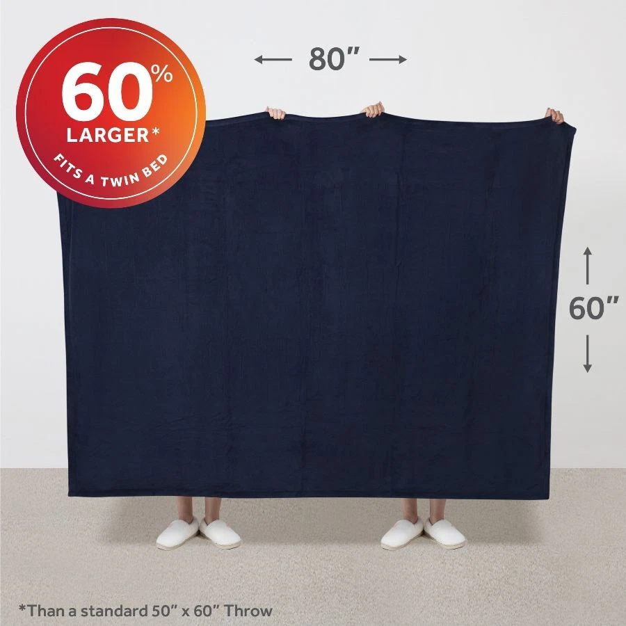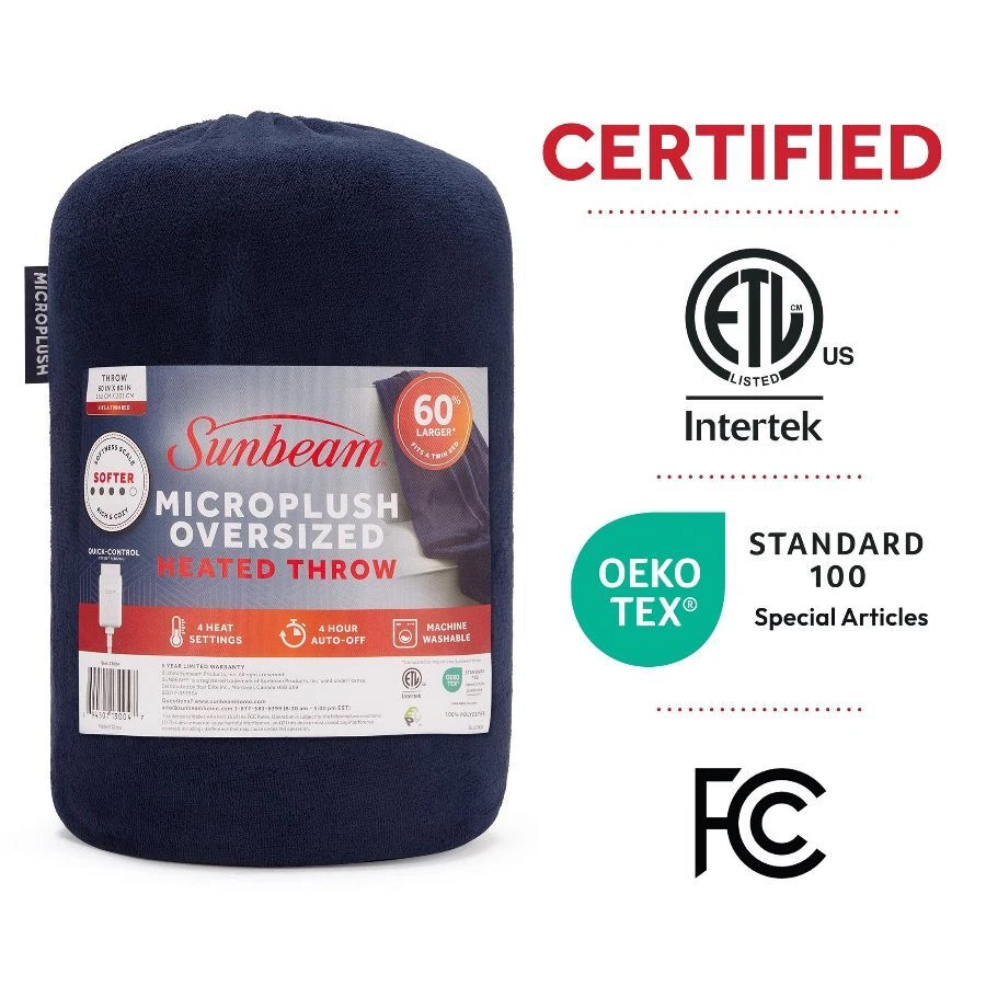 Sunbeam Oversized Poseidon Microplush Heated Throw wraps you in ultimate comfort, perfect for those chilly cold nights. Indulge yourself with its rich and cozy fabric to keep you toasty and comfortable while you unwind. The stylish 60" x 80" electric blanket makes a great accessory while relaxing on the couch, bed or your favourite chair and the poseidon color complements any décor. This throw features an easy-to-use push-button controller with 4 adjustable heat settings, so you can find your perfect temperature. The 4-hour auto shut-off function ensures added peace of mind. Premium heated wires are equipped with advanced technology to ensure continuous even heat distribution. When ready to clean, simply detach the controller from the throw and place in the washing machine and dryer for easy care, stays silky soft wash after wash. Sunbeam is an American brand trusted for over 125 years in electric home appliances. All Sunbeam electric bedding products are ETL certified. On Dec 26, 2024 at 18:52:11 PST, seller added the following information: