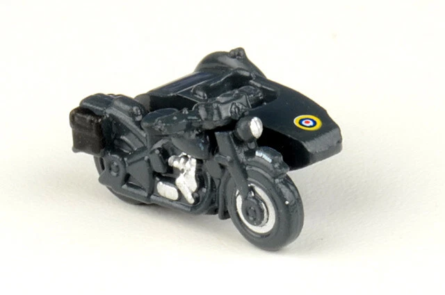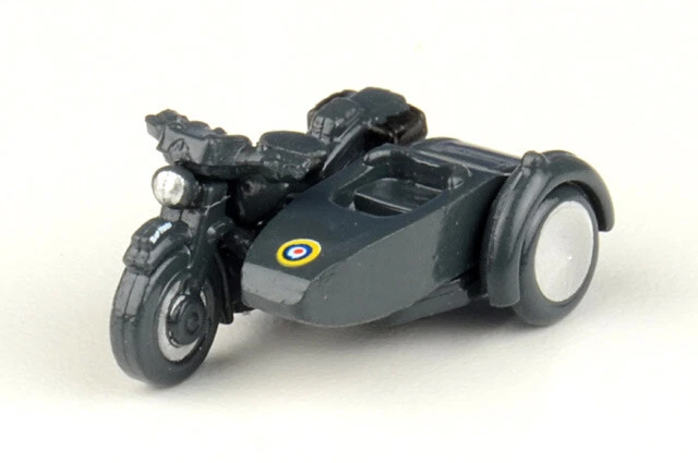 Welcome to The Collector's Outlet! M20 Motorcycle w/Sidecar RAF 1/148 scale Model by Oxford Diecast Measures 0.6" long by 0.5" wide Diecast Metal and Plastic Brand new in original box Thank you!