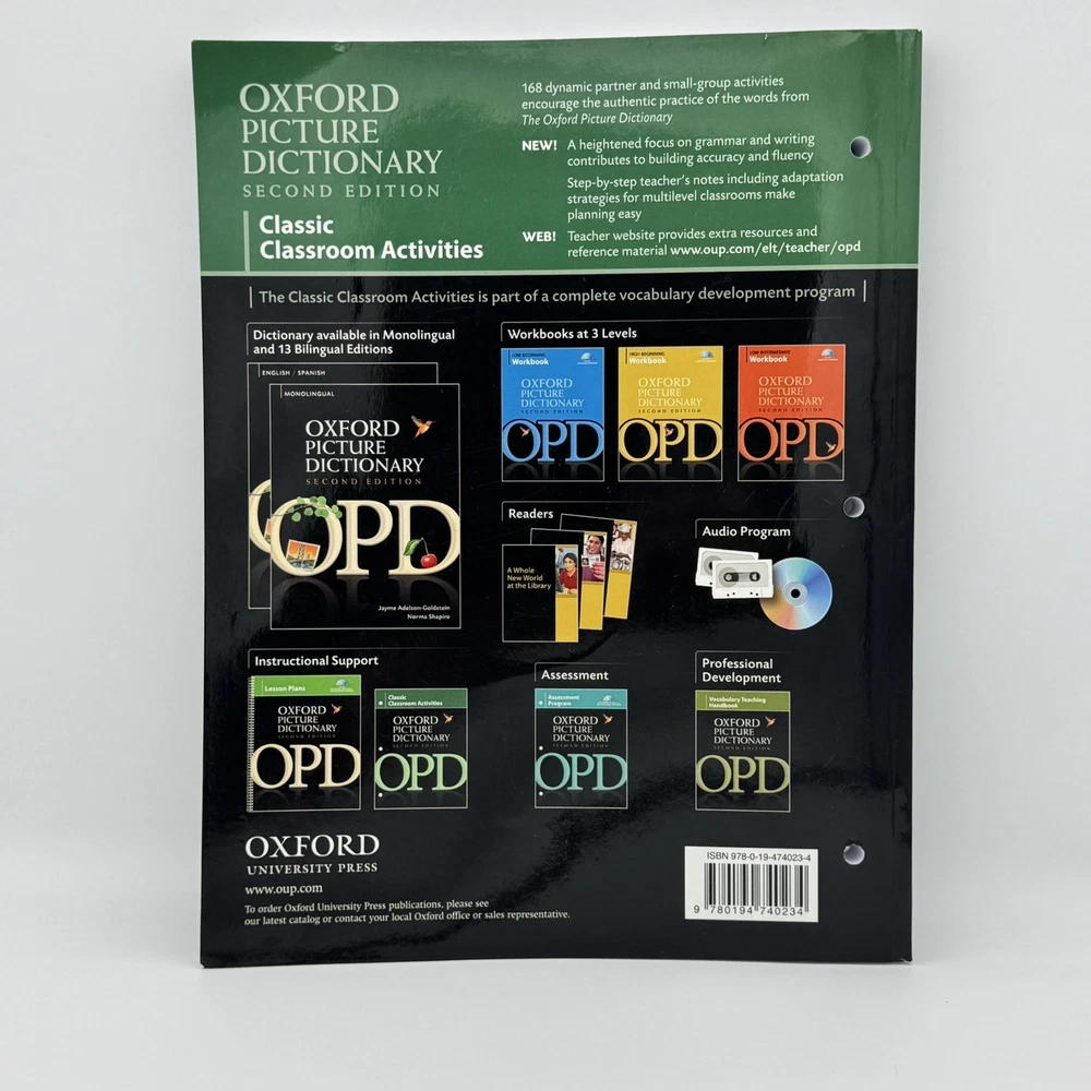 Oxford Picture Dictionary 2nd Edition Classic Classroom Activities: Teacher Resource 168 dynamic partner and small-group activities encourage the authentic practice of the words from The Oxford Picture Dictionary NEW! A heightened focus on grammar and writing contributes to building accuracy and fluency Step-by-step teacher's notes including adaptation strategies for multilevel classrooms make planning easy One page has been removed for making copies but is included and available for use. Other wise, very good preloved condition. ---------------- Smoke-free home. Items stored in cool, dry space. Please see photos for best description of the item’s condition. All photos are of the actual item listed for sale. We do our best to provide proper photos and descriptions of the items to insure there are no surprises once received. We will ship your item within 1-2 business days of purchase. Mailed via Media Mail with USPS - Free Shipping for buyer! Thank you for shopping Declutteringo!