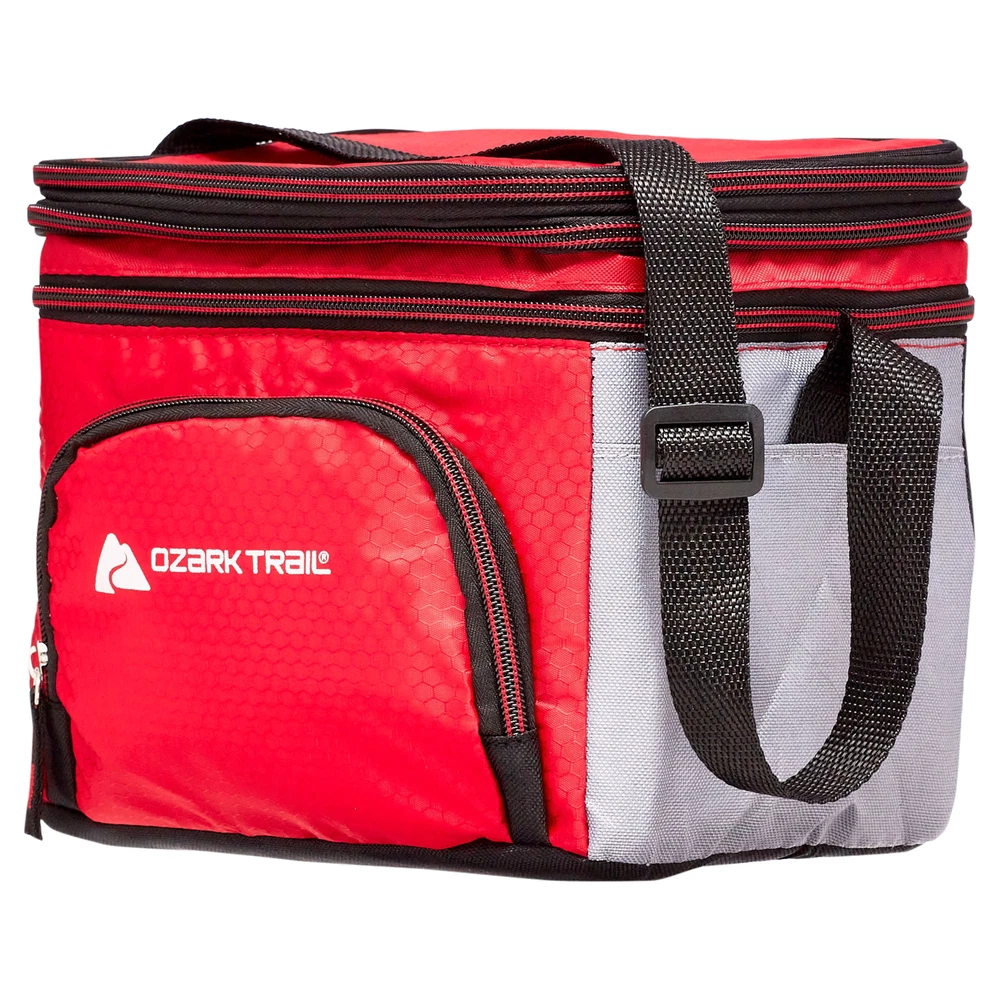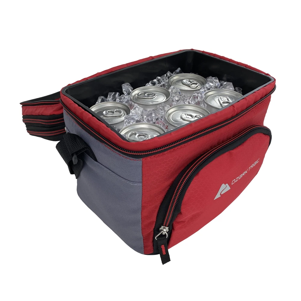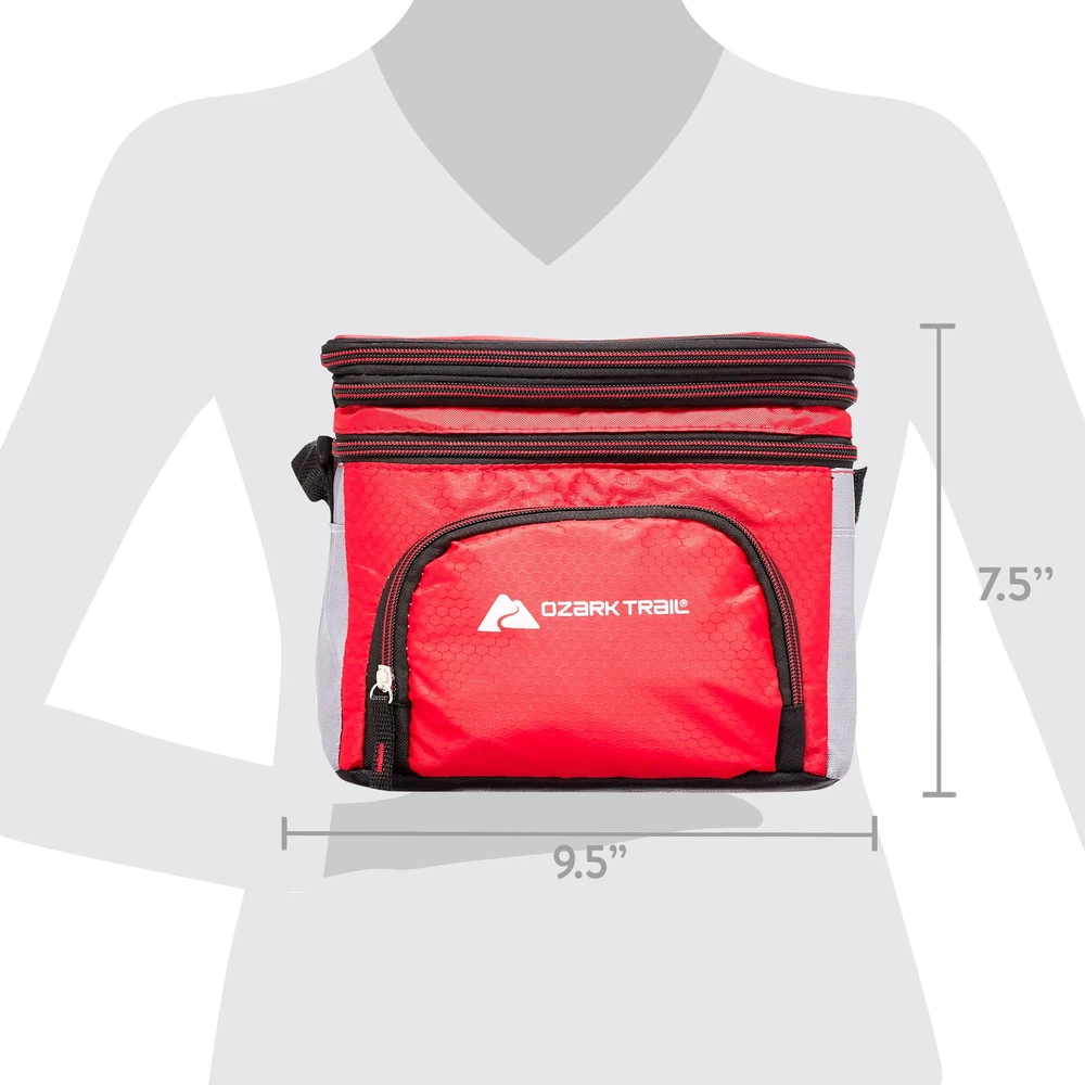 Keep your food and beverages cool with this handy Ozark Trail 6-cans soft-sided cooler with a removable hardliner. It features an easy-to-use front zipper pocket for additional storage. The shoulder strap adjusts to different lengths to make it easy to carry. This cooler also comes equipped with a removable, easy-to-clean hardliner and showcases the Ozark Trail logo on the front. It cans be useful while camping, hiking, tailgating, or spending the day at the beach. Make your next purchase the correct and affordable one. Stock up with this affordable 6 cans cooler today. Adventure is where memories are made, whether it's campouts in the back yard with the kids, Saturdays at the river with friends, or a week in the wilderness alone. Ozark Trail 6 cans Soft Sided Cooler, Red Soft-sided Cooler convenient size allows for 6 cans + ice capacity. 3" Expandable top dry storage compartment. The hard liner cans be easily removed and cleaned. The front zipper pocket is great for storing small accessories. Fully adjustable shoulder strap. Product Dimensions: 9.5"W x 7"D x 8"H