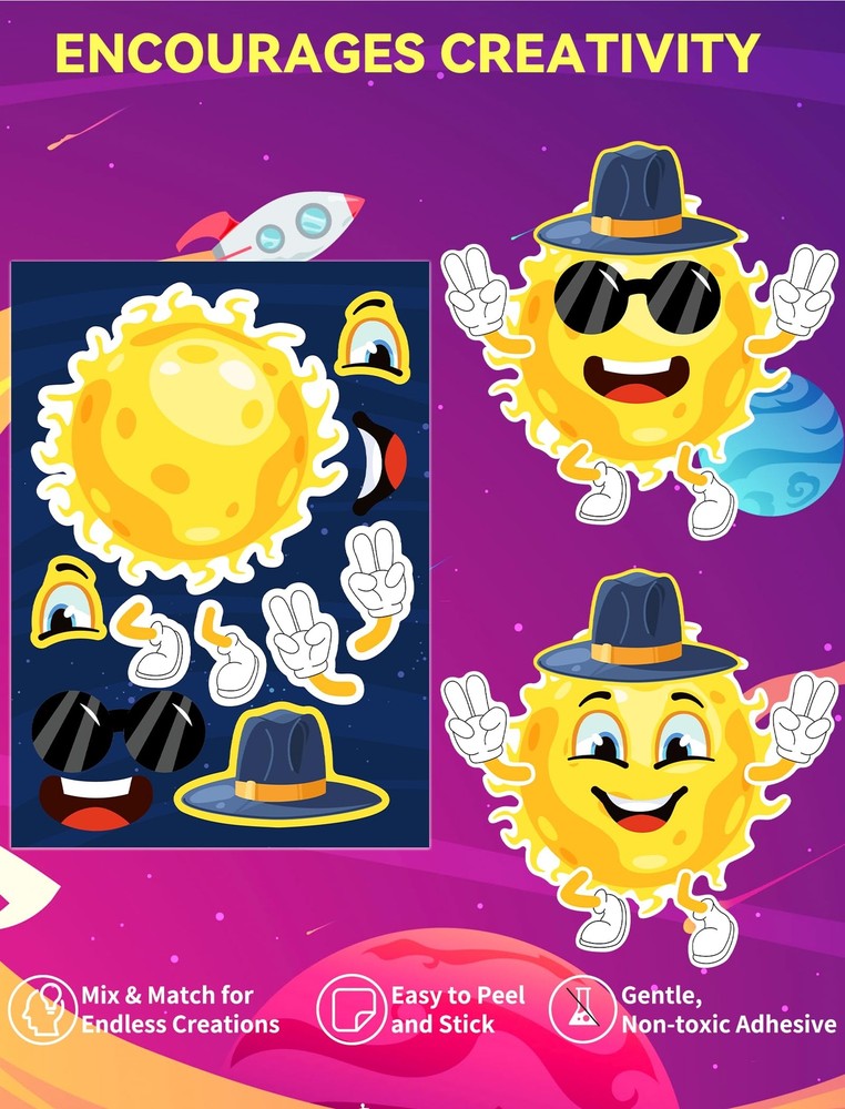 Ozepao 36 Pcs Outer Space Make-A-Face Sticker Sheets | Mix & Match Space Party Favors for Kids | Space Party Decorations, Crafts & Activities 👽Children's Space Sticker Set: Featuring cute cartoon planets, aliens, astronauts, rockets, and other outer space elements, this set offers rich expressions that allow children to immerse themselves in the joy of exploring the outer space world. (12 Designs, 3 Each) 🚀Eco-friendly & HD Printing: Crafted from high-quality vinyl with a glossy finish, these stickers are bright and colorful. 🌕Reusable:These stickers boast water resistance, sun protection, and fade resistance. The self-adhesive back ensures easy application and residue-free removal. 🚀Easy to Use: Our space stickers can be effortlessly attached to any smooth surface, including gift bags, scrapbooks, luggage, book bags, tables, and crafts. ☀️Versatile: Our adorable Universe stickers serve as engaging educational tools for kids to learn about space.They make perfect birthday gifts, party favors, or additions to fun classroom activities, offering kids the opportunity to create their own alien, astronaut, planet, or spaceship masterpieces! 👽Children's Space Sticker Set: Featuring cute cartoon planets, aliens, astronauts, rockets, and other outer space elements, this set offers rich expressions that allow children to immerse themselves in the joy of exploring the outer space world. (12 Designs, 3 Each) 🚀Eco-friendly & HD Printing: Crafted from high-quality vinyl with a glossy finish, these stickers are bright and colorful. 🌕Reusable:These stickers boast water resistance, sun protection, and fade resistance. The self-adhesive back ensures easy application and residue-free removal. 🚀Easy to Use: Our space stickers can be effortlessly attached to any smooth surface, including gift bags, scrapbooks, luggage, book bags, tables, and crafts. ☀️Versatile: Our adorable Universe stickers serve as engaging educational tools for kids to learn about space.They make perfect birthday gifts, party favors, or additions to fun classroom activities, offering kids the opportunity to create their own alien, astronaut, planet, or spaceship masterpieces! Shipping from the USA All of our products are shipped from the USA, ensuring quick delivery to your destination. Payment We offer the following payment methods: PayPal, credit card, bank transfer, and eBay's secure payment system. Free Shipping & Free Returns Shipping within the USA is FREE. Additionally, any return is absolutely free for you. Risk-Free Purchase You have the option to return an item within 30 days without any justification. We cover the return shipping costs! Fast Shipping We ship immediately upon receipt of payment. Generally, the package is delivered within 2-3 days in the USA. If it takes longer, we will contact you. Quality and Costs Made in Europe, USA, China No customs fees or additional charges Total satisfaction guarantee Invoice with declared VAT available upon request in .pdf format Feedback Your feedback is very important to us. After you pay for your purchase, you will automatically receive positive feedback from us.