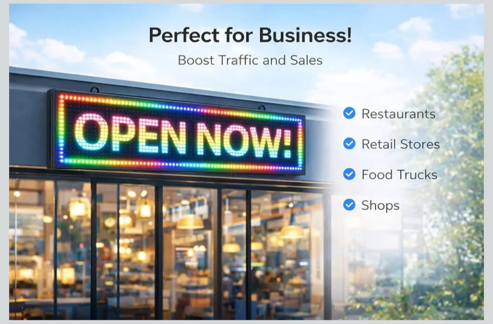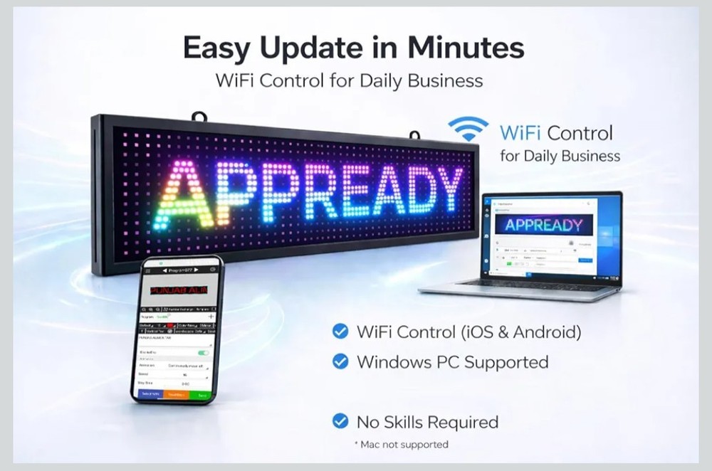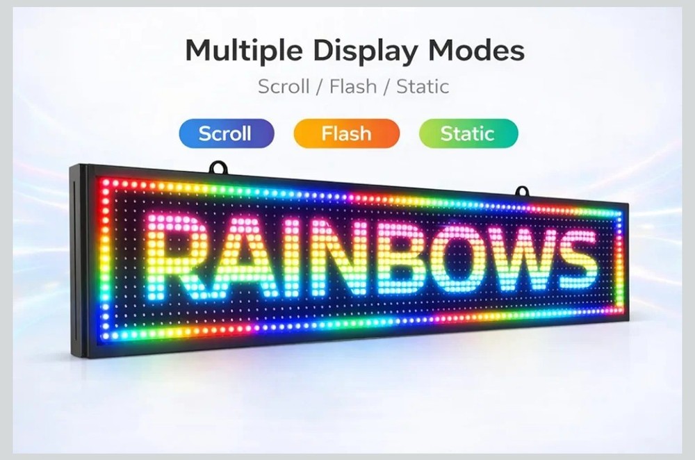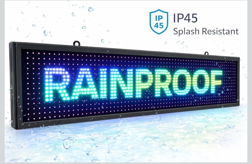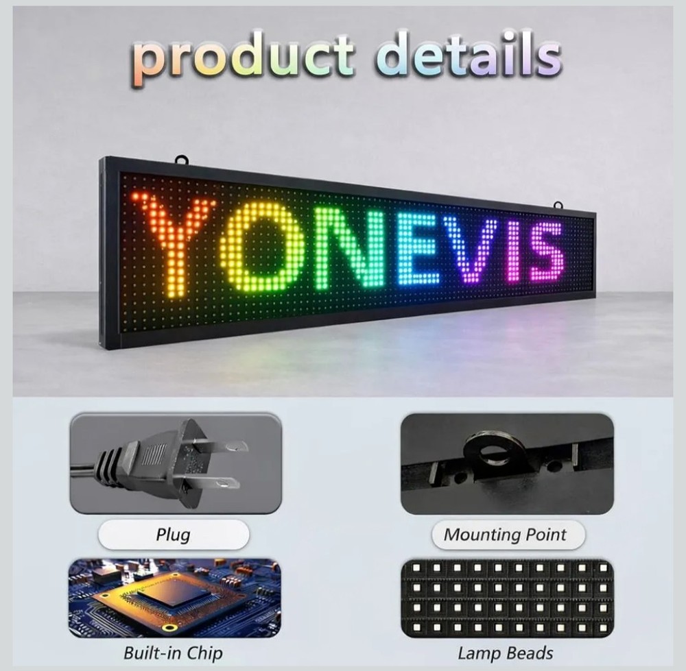 P10 Programmable Scrolling LED Sign 39"x8" Outdoor IP45, WiFi Controlled High Brightness Digital LED Text Display for Business Storefront Advertising. Amazon lists this sign for $115.99+ Programmable LED Text Sign 39"×8" P10 LED scrolling sign, ideal for displaying custom text messages for business advertising. Bright & Eye-Catching Display High-brightness RGB LED pixels ensure clear visibility day and night, even from a distance. Outdoor Waterproof Design waterproof aluminum frame, suitable for indoor and outdoor storefront use. Easy WiFi Control Update text wirelessly via WiFi using mobile app or Windows PC (no internet required). Commercial Grade & Reliable Long lifespan LED modules, stable performance for shops, restaurants, and stores.