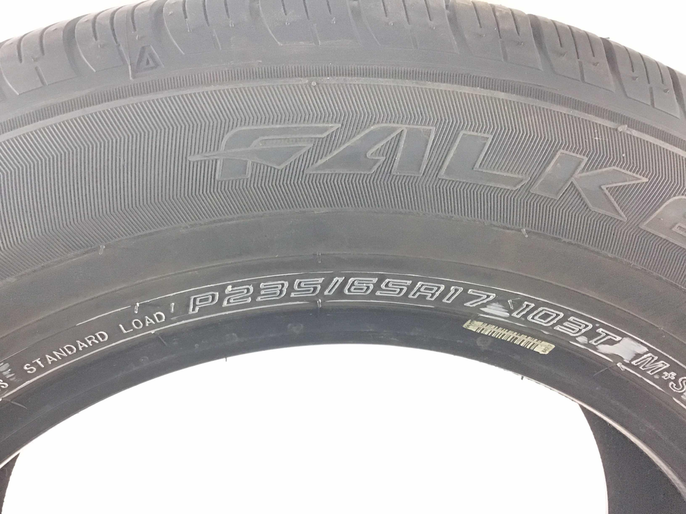 itemTitle Champtires is not an authorized Falken dealer. The manufacturer warranty does not apply. P235/65R17 Falken Ziex ZE001A A/S 103 T Used 8/32nds About Champtires Since 2009, Champtires has sold new and the best used tires to drivers across the U.S. Champtires fully inspects – visually and by air-testing – all tires. Some tires have been repaired using an industry-standard plug-patch combination that will last the lifetime of the tire. Champtires will not repair a tire’s sidewall. Tires cannot be returned for having repairs. If you have a question about whether a tire has been repaired or not, send us a message on eBay prior to making a purchase. Tread depths are accurately measured. If you have questions about manufacture dates (DOTs), please also send us a message before placing an order. About our Tires Champtires sources only the highest quality used tires. All tires go through a three-step inspection process, which involves a visual inspection, air-testing and a final check before shipping. Tread depths are accurately measured. Some tires have been repaired using an industry-standard plug-patch combination that will last the lifetime of the tire. Champtires will not repair a tire’s sidewall. Tires cannot be returned for having repairs. If you have a question about whether a tire has been repaired or not, please send us a message. If you have a questions about a tire’s manufacture date, please send us a message as we would be happy to provide the DOT. Customer Service If you have any questions about our tires, including repair status or manufacture date, please send us a message through eBay. All messages will be answered within 24 hours, most often within a few hours. Shipping Details We ship using FedEx Ground to the continental 48 states. Your tires will leave our facilities within one business day. Return Policy Tires can be returned within 30 days if they were inaccurately described or damaged. Please send a message with any return requests. Disclaimer Limitation of Damages: Under no circumstances, including negligence, shall Champtires be liable for any direct, indirect, incidental, special, punitive, or consequential damages that may result from the use or inability to use any product(s) purchased from Champtires, including but not limited to flaws/defects, or any other failure or inadequacy related to the product(s). Disclaimer of Warranties: The product(s) purchased from Champtires are provided “as is,” with all faults, and without warranties of any kind, either express or implied, including but not limited to implied warranties of merchantability and/or fitness for a particular purpose. Pure Pass Through: Champtires is a pure pass through retailer of products, and such products are provided “as is”, with all faults. Assumption of Risk: The product(s) purchased from Champtires are provided “as is,” with all faults. Purchaser acknowledges the risks associated with purchasing a product “as is” and assumes any and all such risks.